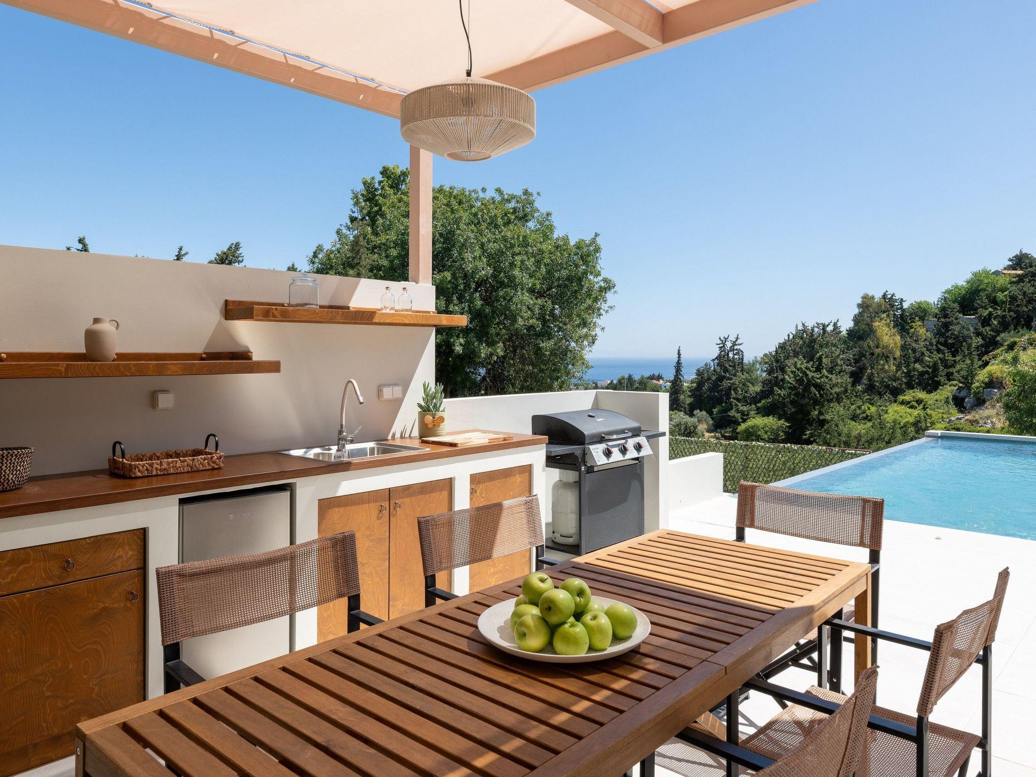 On the first floor, charming balconies offer views of the picturesque surroundings, while the outdoor pergola area features a fully equipped kitchen and an impressive BBQ setup. With a comfortable dining space, it’s the perfect place for guests to gather, share a delicious meal, and create lasting memories in a truly enchanting setting.