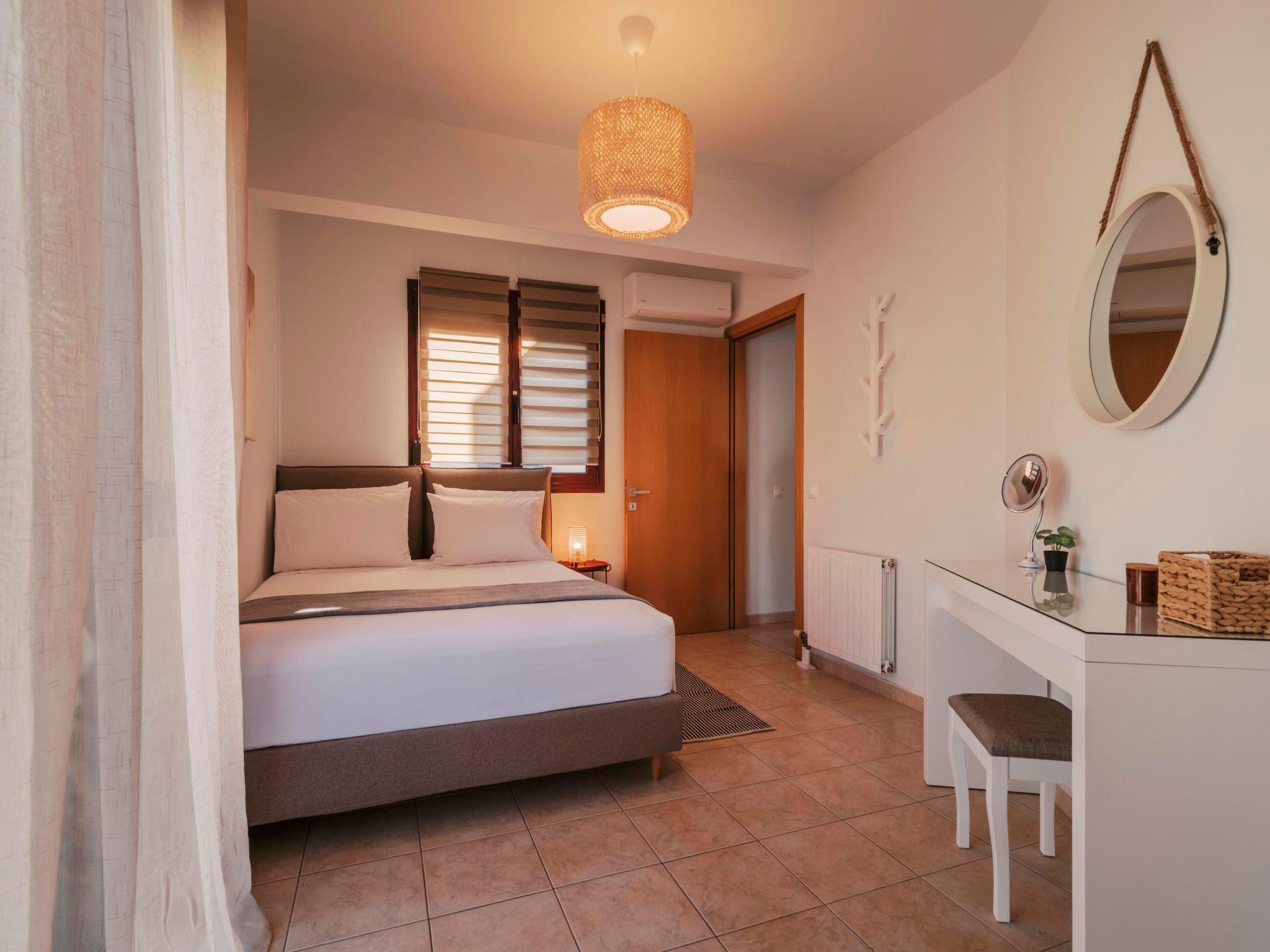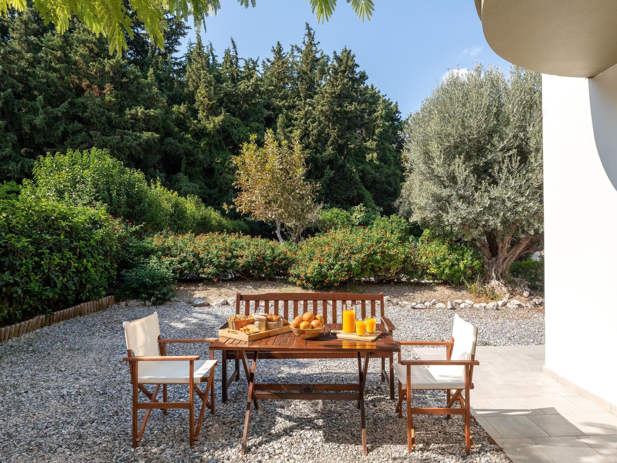 Step outside, and the villa continues to impress. The expansive outdoor area boasts a magnificent private pool surrounded by lush greenery, complete with sun loungers and parasols — an idyllic spot to soak up the golden Greek sun.
