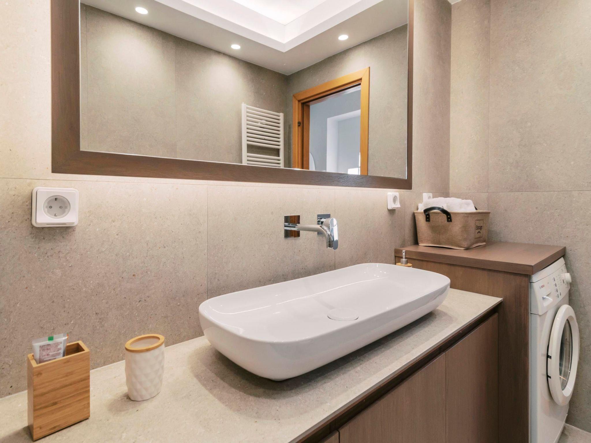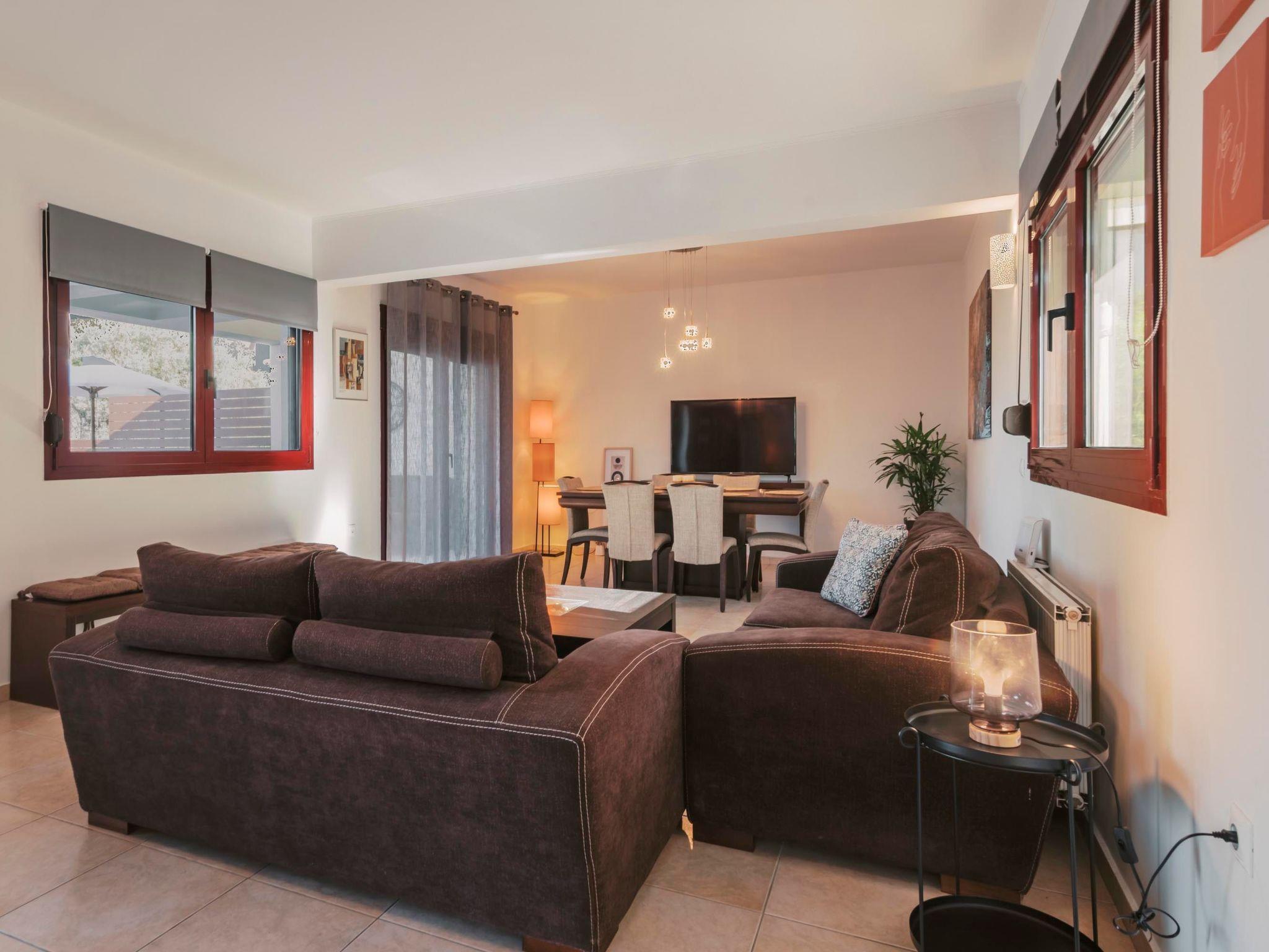 The open-plan kitchen is fully equipped and thoughtfully designed in warm hues, ideal for preparing meals of any kind. Adjacent to the kitchen is a welcoming sitting area, perfect for relaxing or entertaining. The spacious living room, decorated in soothing natural tones, invites guests to unwind in a calm and peaceful environment. Complimentary Wi-Fi is available throughout the property.