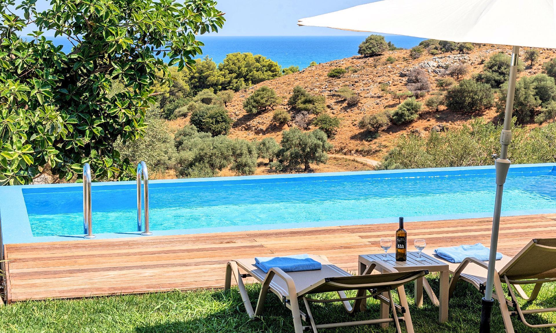 The outdoor space of the villa is where the magic truly happens. Boasting a private pool surrounded by sun lounges, sunbeds, and umbrellas, guests can bask in the Greek sun in complete solitude or enjoy alfresco dining with the villa's BBQ and outdoor dining facilities. The private garden, a verdant oasis, invites guests to unwind in the tranquility of nature, adding another layer of relaxation to this exquisite vacation home.