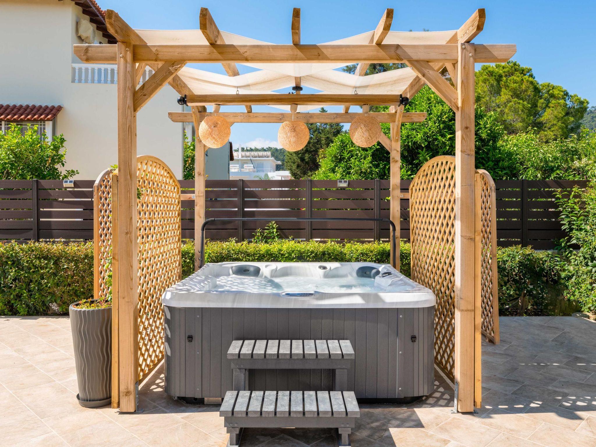 Villa Montefile has three fully air-conditioned bedrooms, all of them with double beds and balconies. One of the double bedded bedrooms includes an ensuite bathroom with a shower and has a flat-screen TV. There are two bathrooms in total, with showers as well as a WC. All areas of the villa are fully airconditioned. Also, there’s an open-plan huge kitchen which is fully equipped and suitable for any meal preparation. In the same area, you will find the sitting area of the kitchen along with an incredibly cozy living room in bright tones. There’s a smart TV and free Wi-Fi access throughout the property. There’s an entrance that leads to two houses that belong to one property. As you face the property from the entrance, Villa Montefile is on the left. Outdoors, there’s the wonderful private swimming pool and a heated jacuzzi with sunbeds where you can relax and work on your tan under the rays of the Aegean Sun. Of course, the beach is right about a 6-minute drive from the house so you can easily spend your time there. Also, there’s an outdoor furnished area and a BBQ installation along with a sitting area to enjoy a gathering with your friends or family under the starry sky!