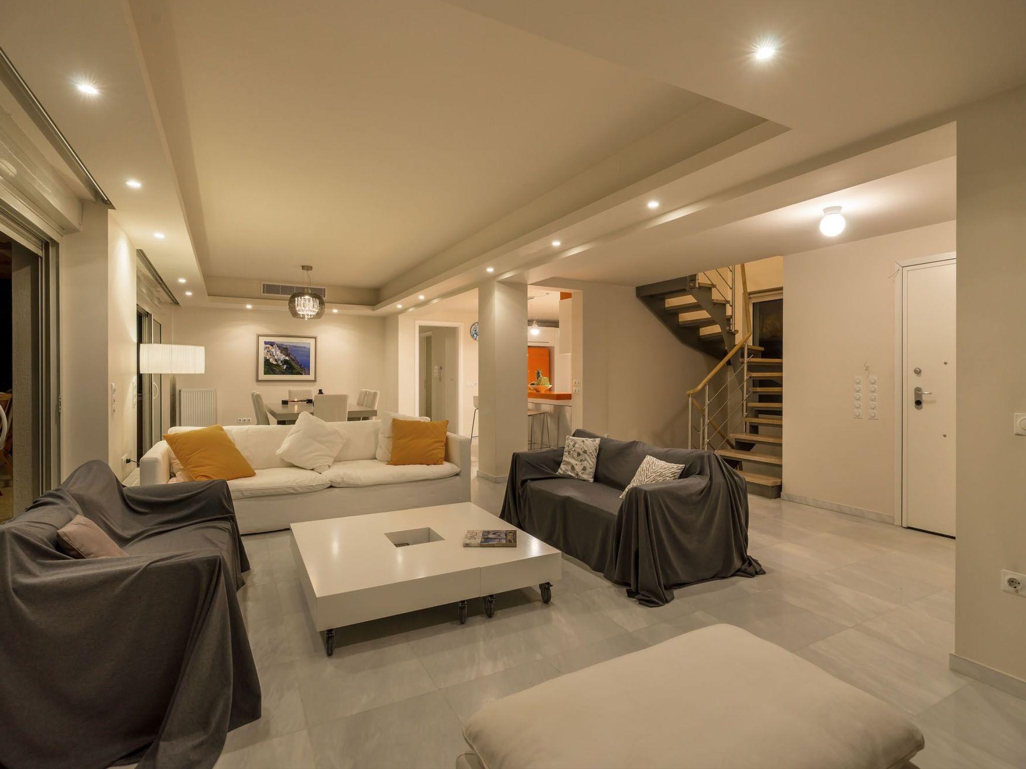 The villa itself spans an impressive 315 sq.m. across three exquisitely designed levels. The basement serves as the primary entrance, welcoming you into a spacious living room that opens onto the main balcony. The left side presents a cozy sitting area equipped with two couches and a TV, while to the right, you'll find a stunning open-plan kitchen, fully equipped for all your culinary needs, and a dining area capable of seating 8 people comfortably. For those who prefer dining alfresco, the veranda offers another dining setup with immediate access to the enchanting garden.