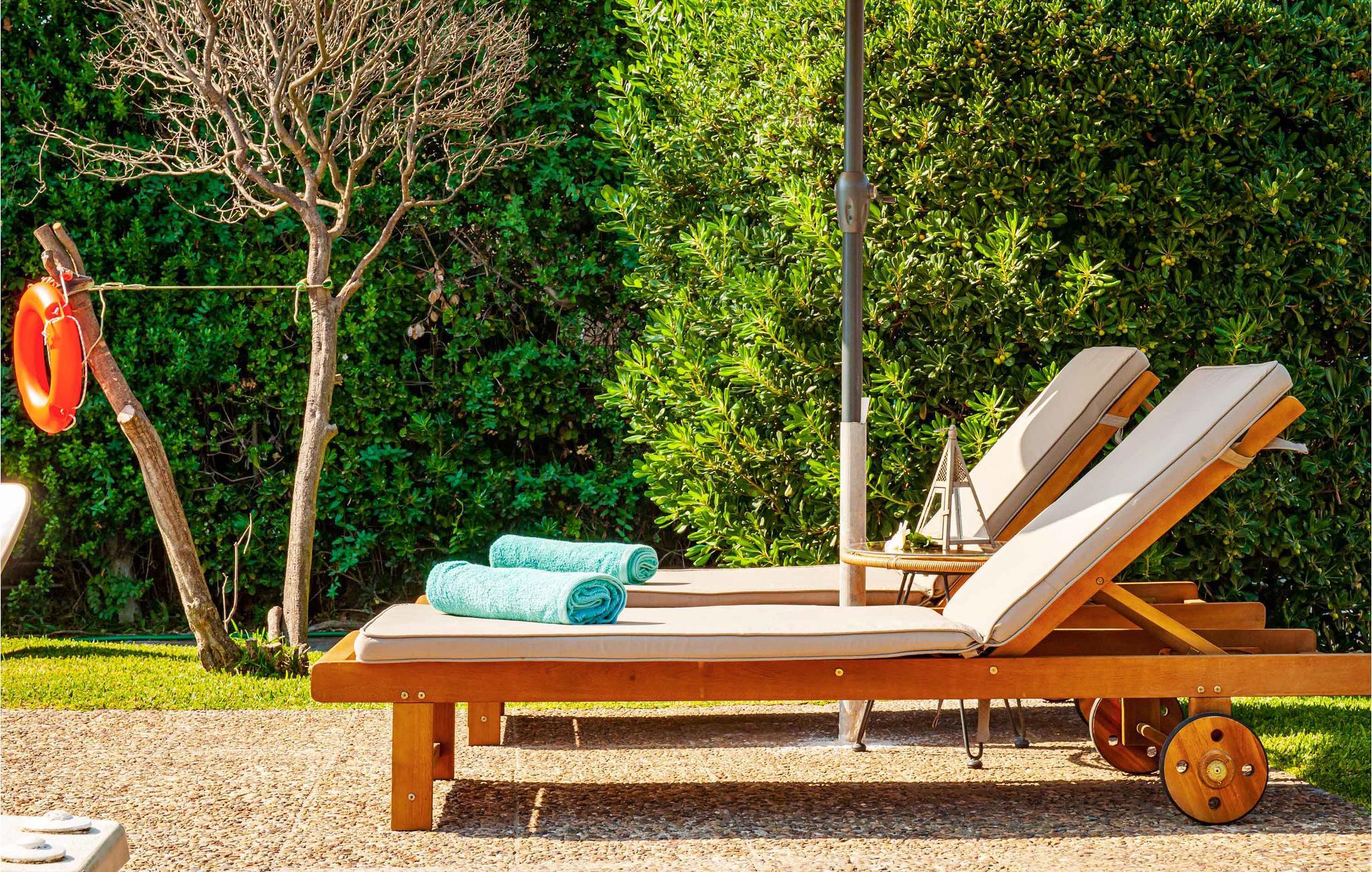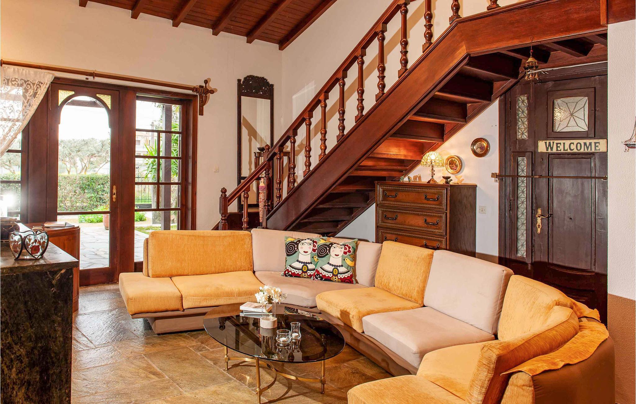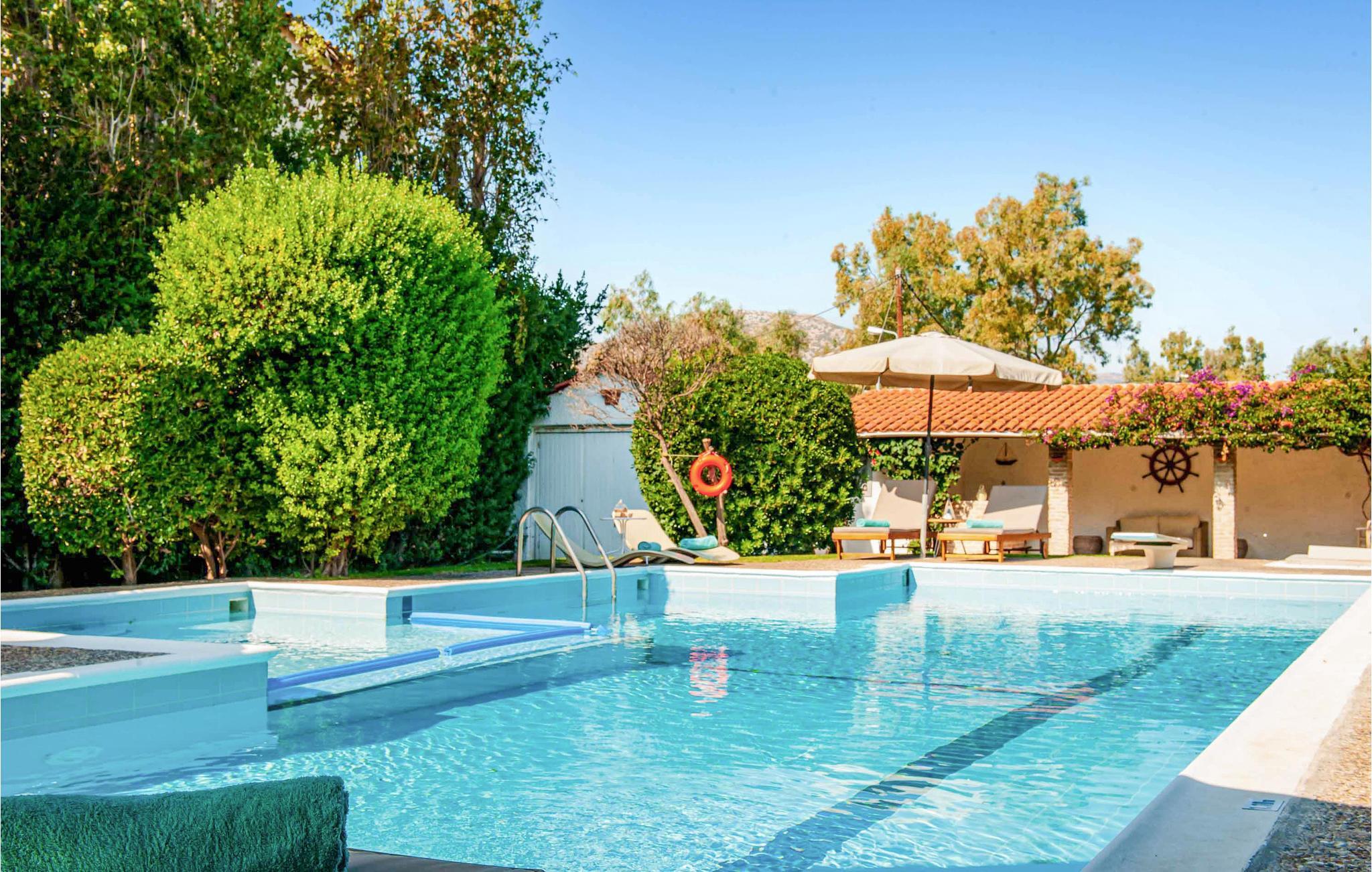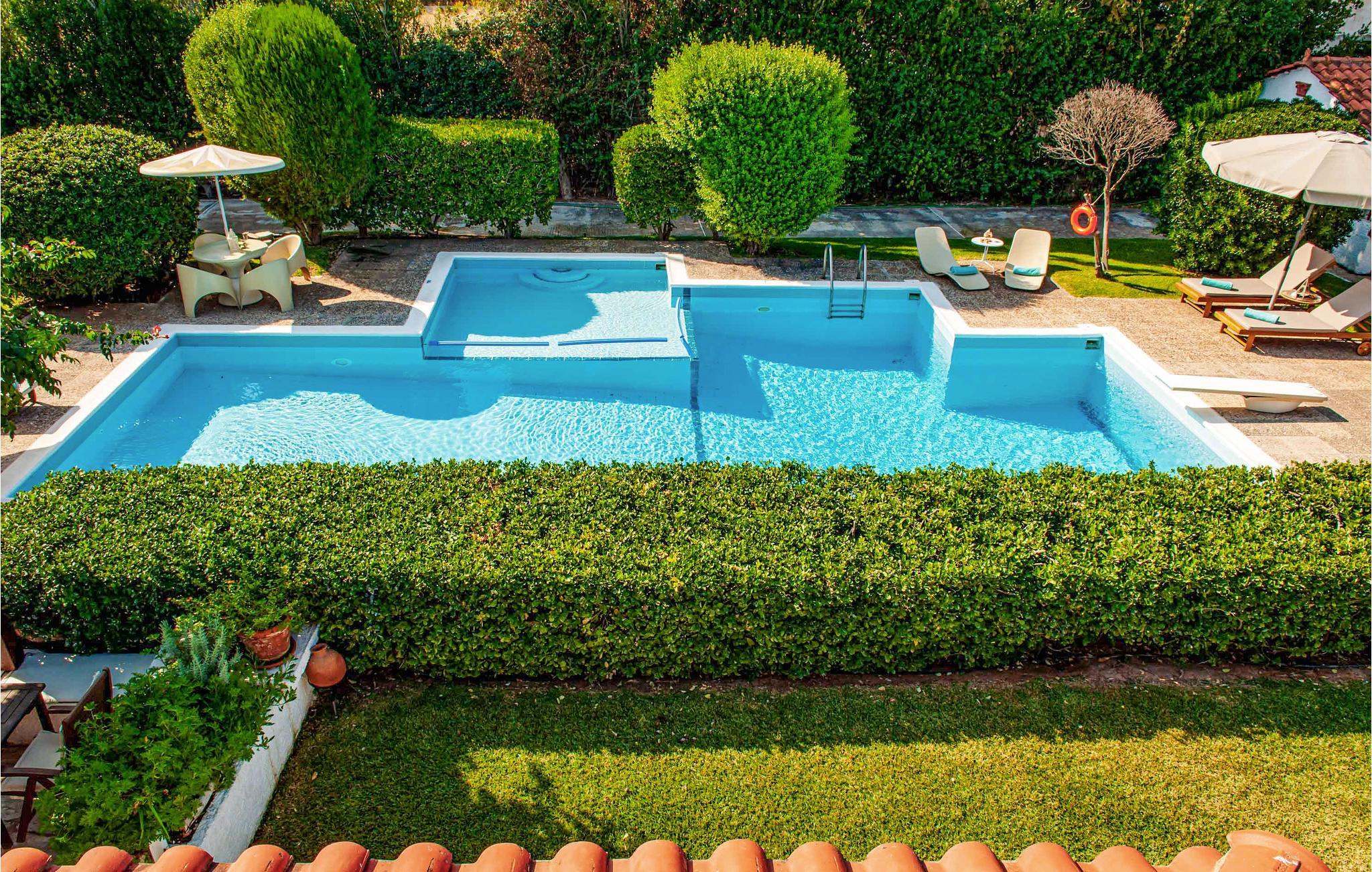 Das Haus verfügt über einen großen Pool mit weitläufigen Terrassen, ideal zum Sonnenbaden, mit bequemen Sonnenliegen und Tischen, um Ihr Frühstück zu genießen. Das Innere des Hauses bietet viel natürliches Licht und wirkt durch Holzdecken besonders gemütlich.