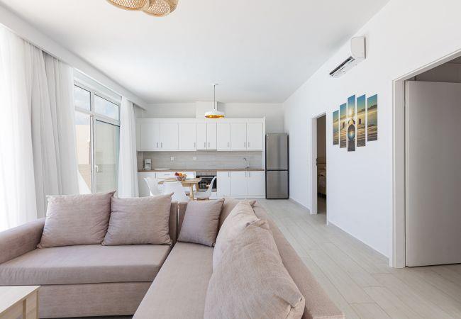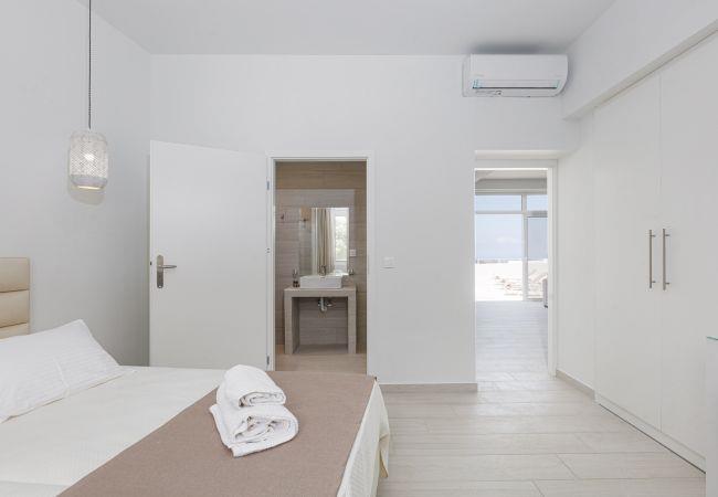 The villa includes a fully equipped, modern kitchen, perfect for preparing meals with local ingredients. Two comfortable bedrooms accommodate up to four guests: one with a king-size bed (1.60 x 2.00 m) and the other with two single beds (0.90 x 2.00 m each), which can be joined to form a queen-size bed (1.80 x 2.00 m) upon request. Both bedrooms feature private en-suite bathrooms with contemporary finishes.