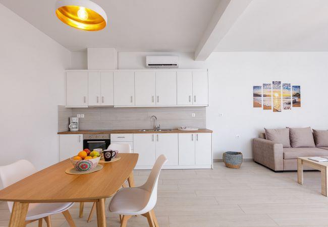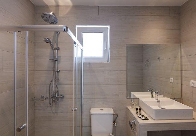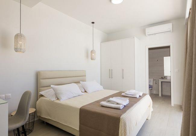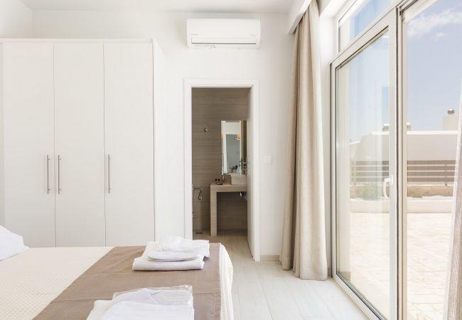 The villa includes a fully equipped, modern kitchen, perfect for preparing meals with local ingredients. Two comfortable bedrooms accommodate up to four guests: one with a king-size bed (1.60 x 2.00 m) and the other with two single beds (0.90 x 2.00 m each), which can be joined to form a queen-size bed (1.80 x 2.00 m) upon request. Both bedrooms feature private en-suite bathrooms with contemporary finishes.