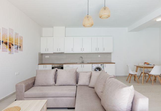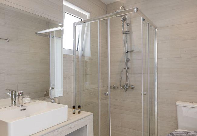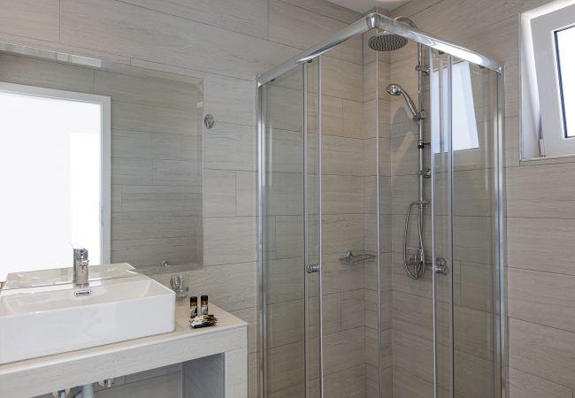 The villa includes a fully equipped, modern kitchen, perfect for preparing meals with local ingredients. Two comfortable bedrooms accommodate up to four guests: one with a king-size bed (1.60 x 2.00 m) and the other with two single beds (0.90 x 2.00 m each), which can be joined to form a queen-size bed (1.80 x 2.00 m) upon request. Both bedrooms feature private en-suite bathrooms with contemporary finishes.