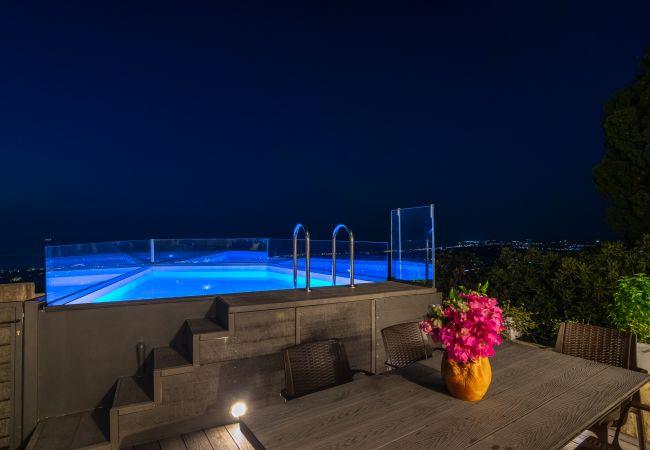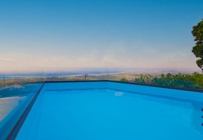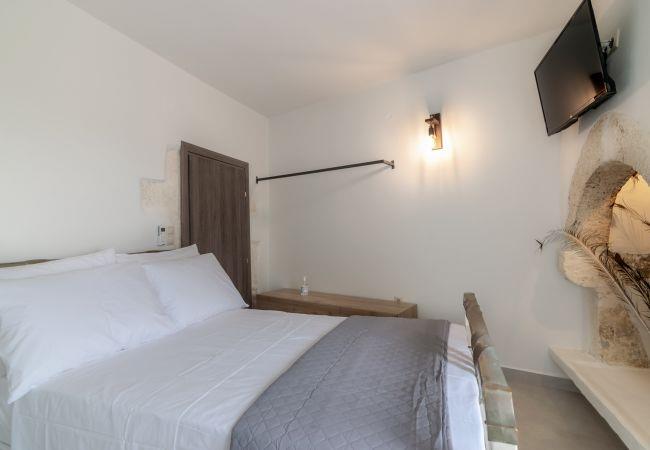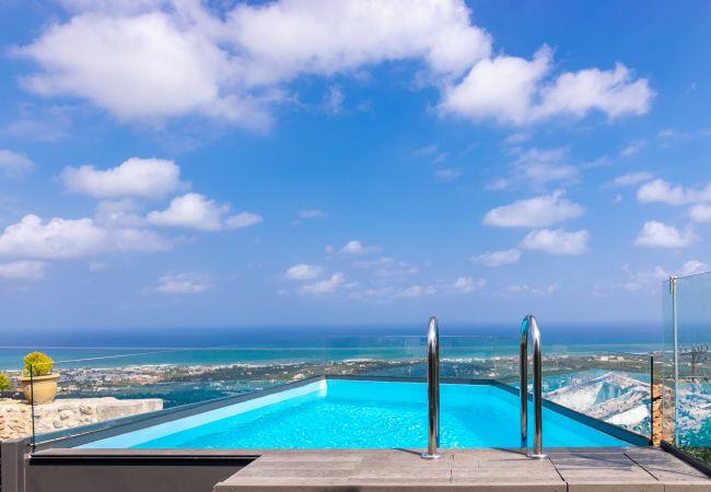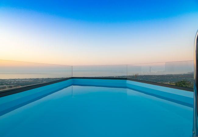 Stepping outside, the private terrace is a true highlight. The 16 m² infinity pool invites you to cool off while admiring the stunning landscape. Comfortable sun loungers are positioned by the pool, allowing you to relax, soak up the sun, and gaze out at the panoramic views of the sea and Cretan countryside.