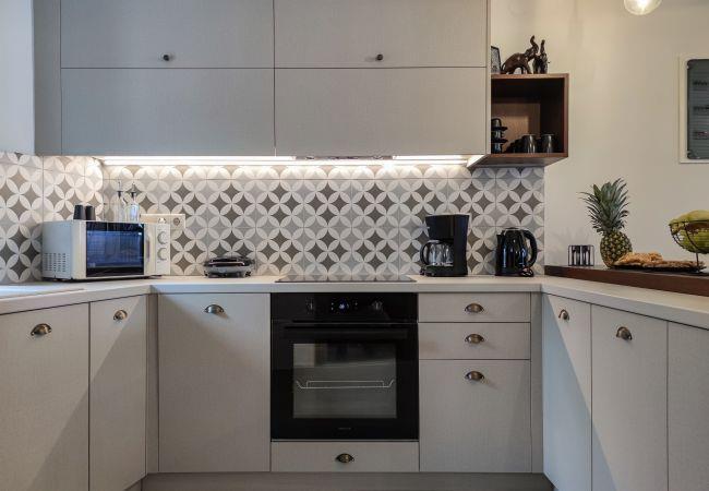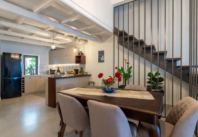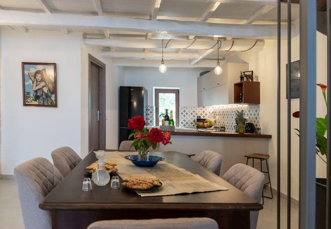 Inside, the warm, inviting atmosphere is enhanced by stone walls, wooden details, and tasteful furnishings. The open-plan living area features a cozy sitting space, satellite TV, and a large dining table, while the fully equipped kitchen includes a dishwasher, ideal for longer stays. A bathroom with a washing machine is also available on the ground floor, along with the elegant master bedroom that offers a double bed and an en-suite bathroom.