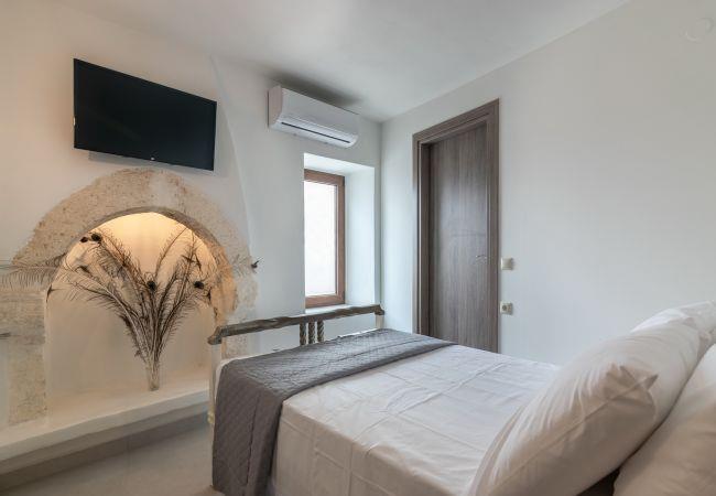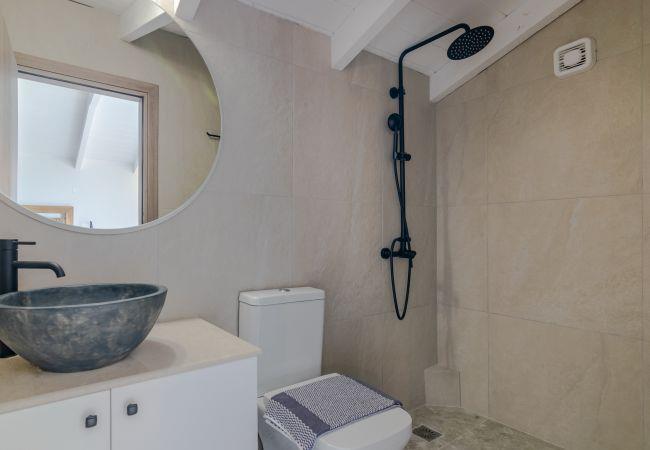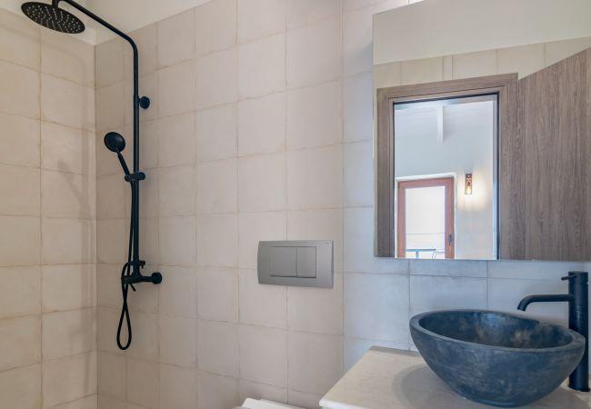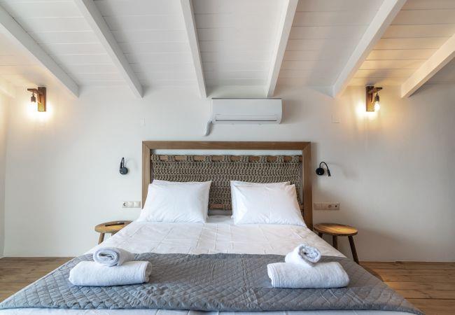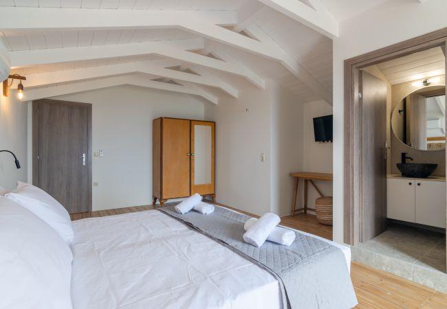 Upstairs, two more bedrooms await—one with a double bed and one with twin beds—each with its own en-suite bathroom and private balcony. From here, guests can enjoy breathtaking views over the olive groves, hills, and the sea. Each bedroom is individually air-conditioned, and the villa offers fast, stable Wi-Fi throughout.