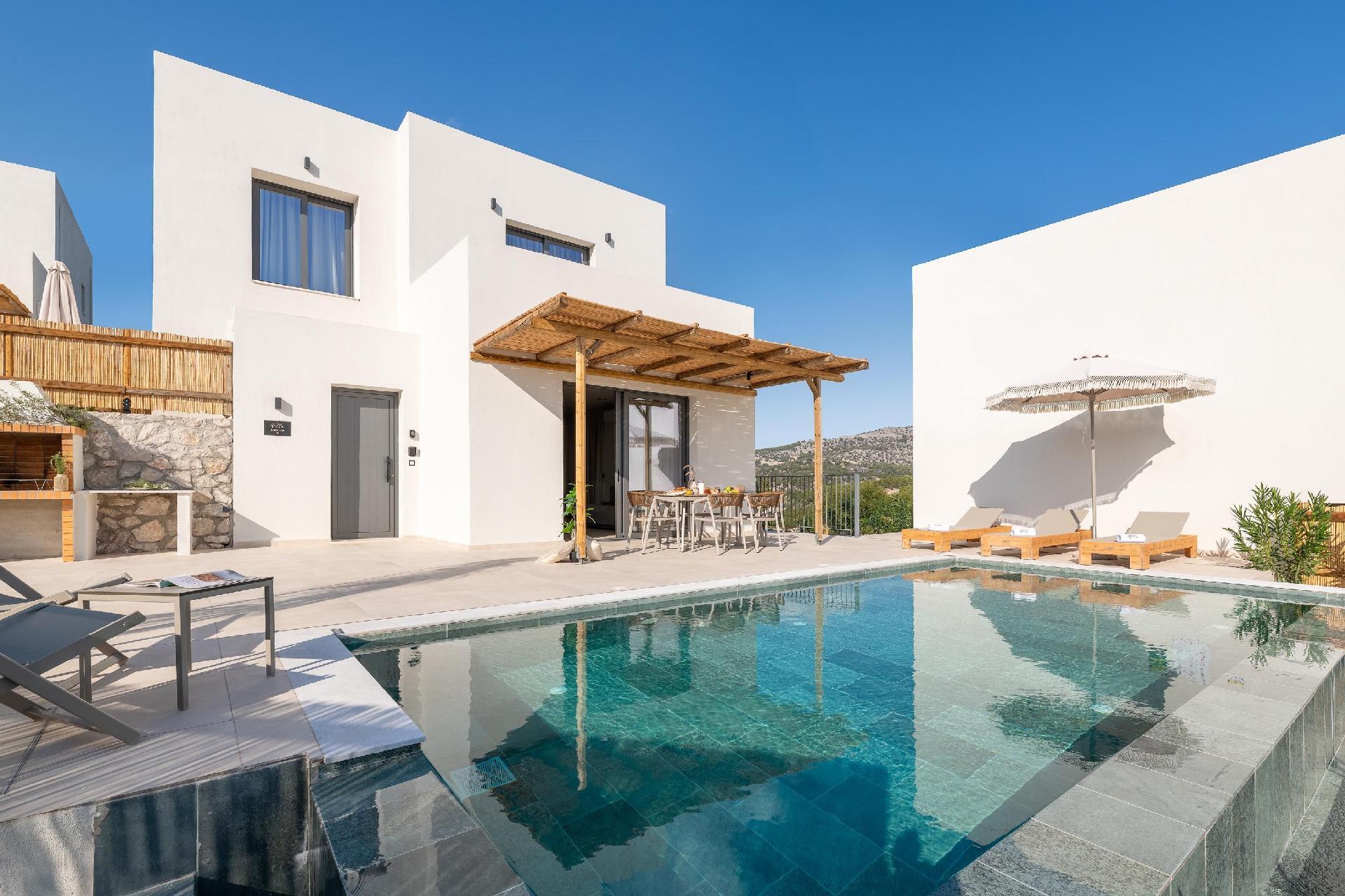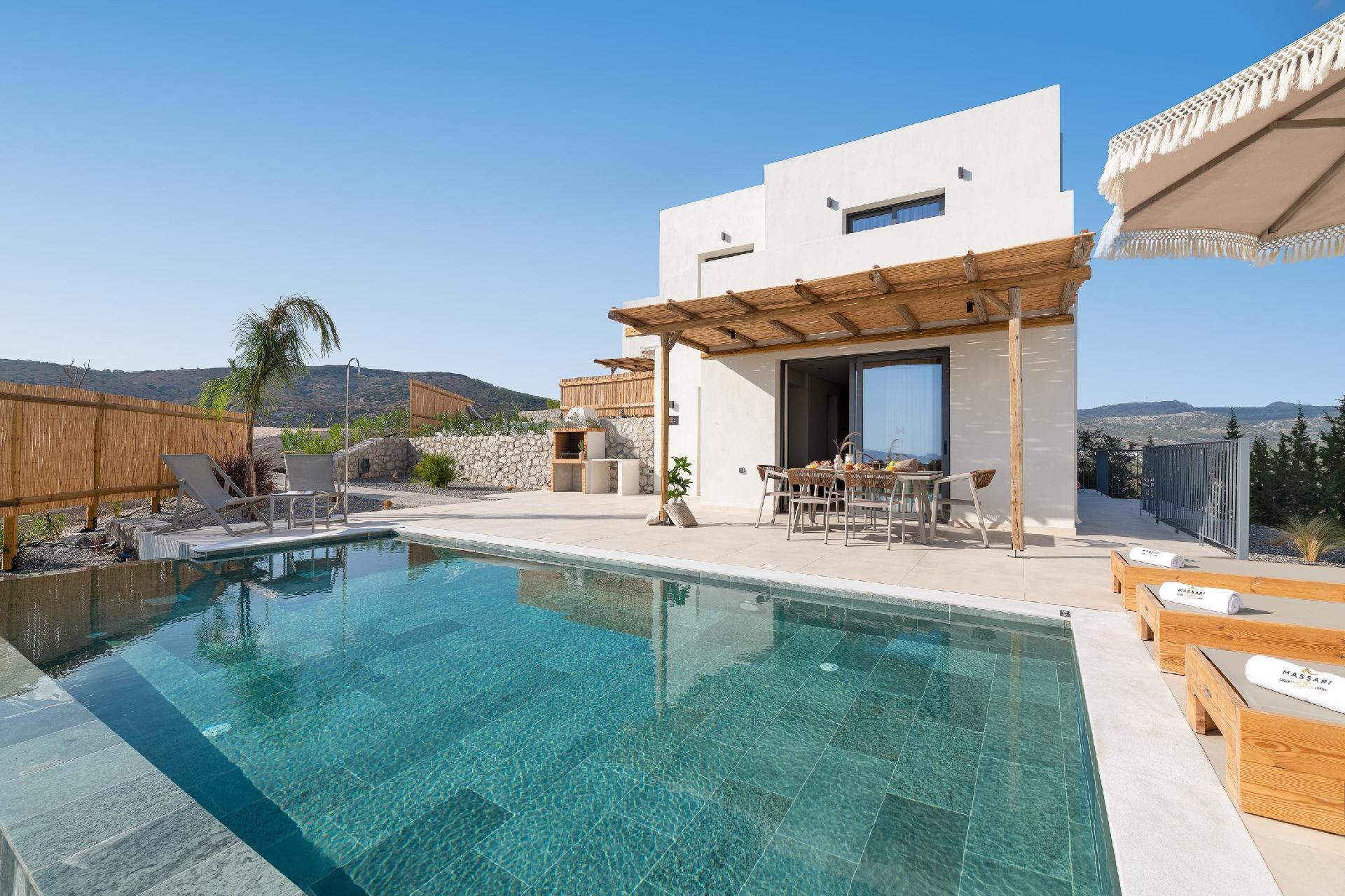 Massari Hills Luxury Living are 15 fantastic brand-new properties designed in unique minimal architecture with unique warm-colored details. They are located in Massari, only a 5-minute drive from Charaki beach. All of the modern villas provide you with all comforts, private swimming pools and patios in a unique design. There is an outdoor sharing gym and each villa offers a BBQ installation. Each property accommodates up to 8 guests.