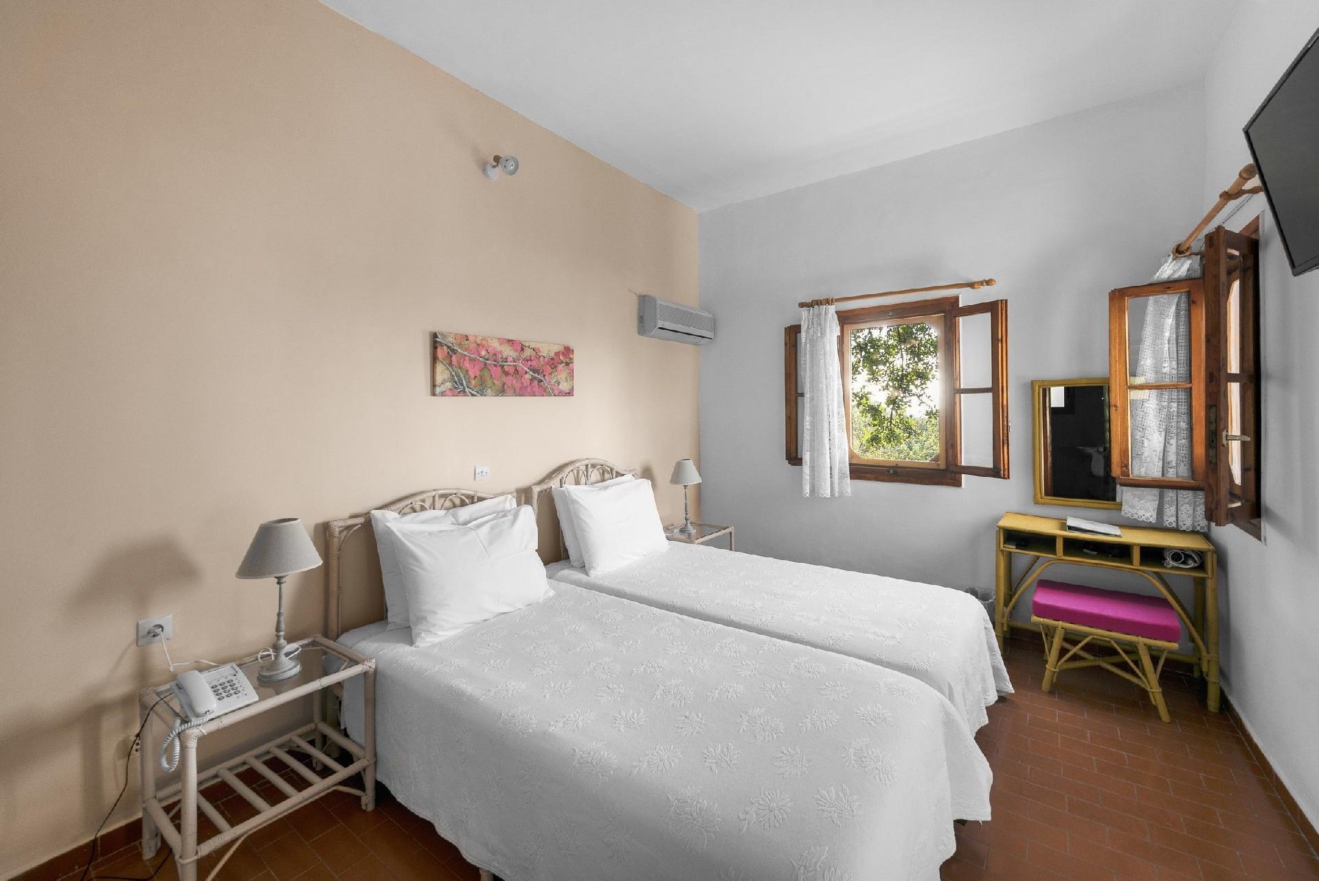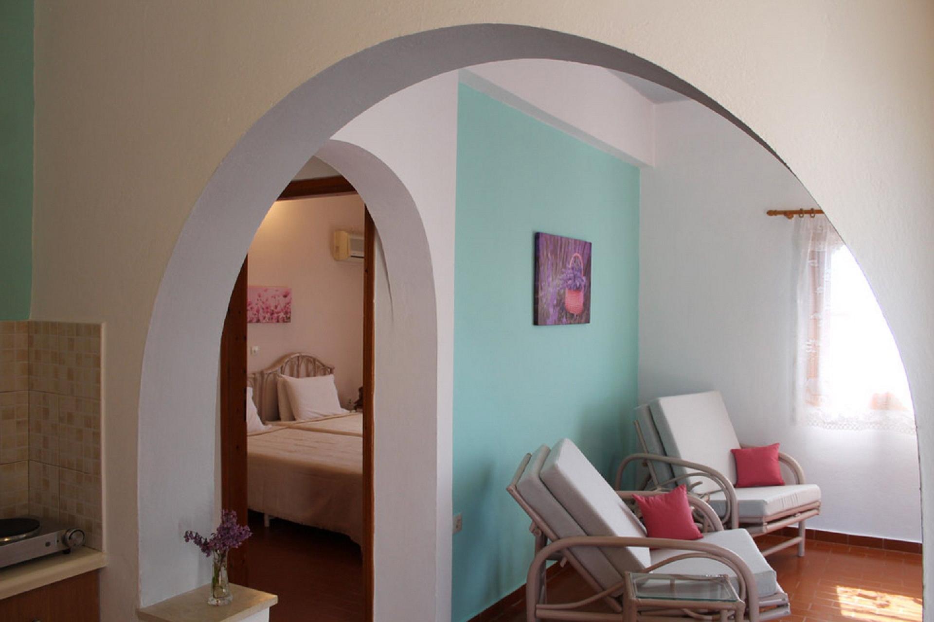 Location: Completely quiet on a large plot of land with olive and pine trees on a hillside on the edge of the pretty village of Mavrovouni. The complex is located above the long sandy beach, which can be reached via a small side road. There are 3 tavernas and a beach bar along the beach and a surf school 1.5 km away.