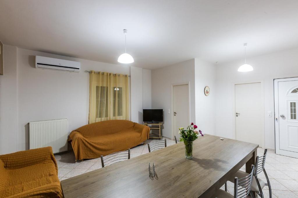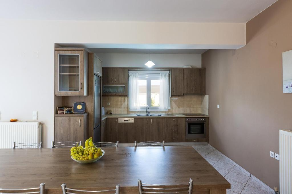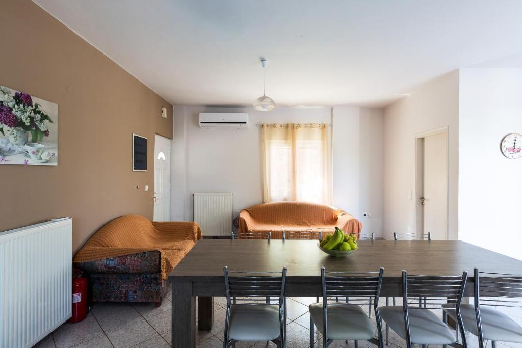 Each apartment features a double bedroom(1,60x2.00), a bathroom with shower, a cosy living area and a kitchenette for your daily needs. A large, fully equipped kitchen can also be found on the ground floor with a spacious wooden dining area, ideal for family gatherings and perfect if you want to have your meals at home.