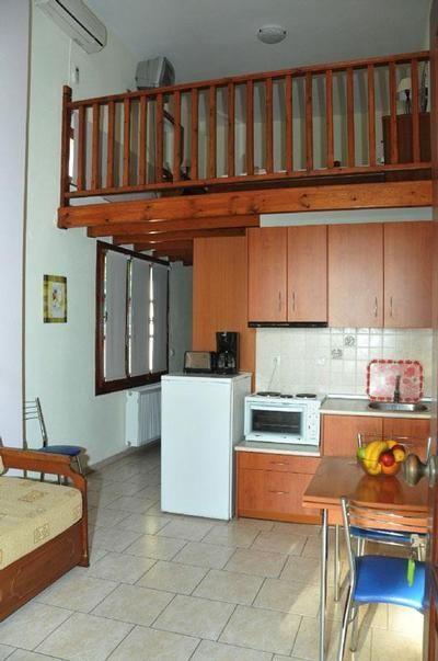Both studios are located on the ground floor and are the same size and equipped in the same way. Each studio has a gallery with a double bed (approx. 12.5 square metres), which can be reached via a wooden staircase, the main room (approx. 24.50 square metres) with kitchenette (standard equipment) and dining table, a pull-out sofa bed, shower/WC and a large veranda (approx. 18 square metres) with garden furniture and a beautiful sea view.