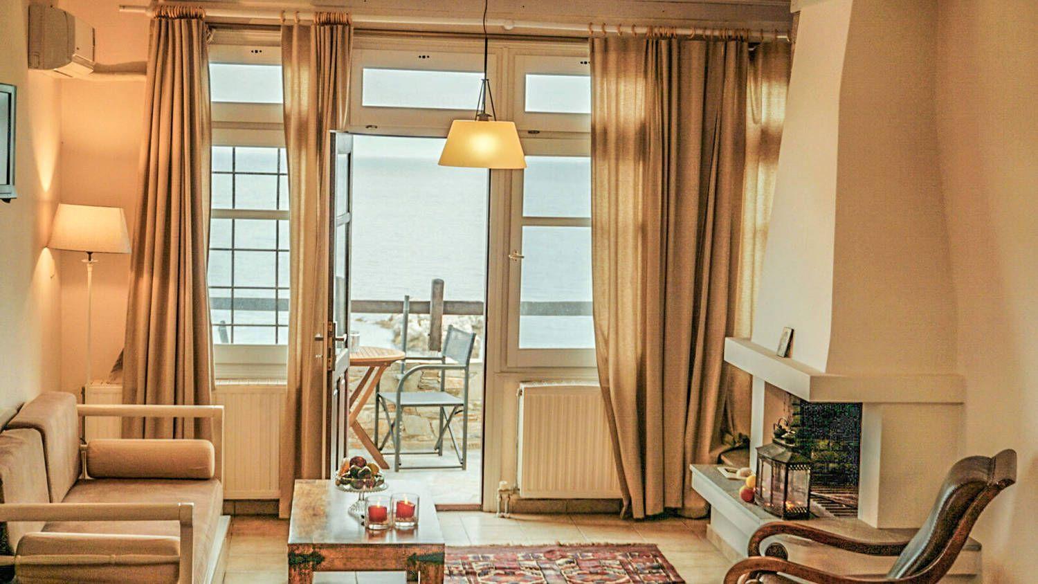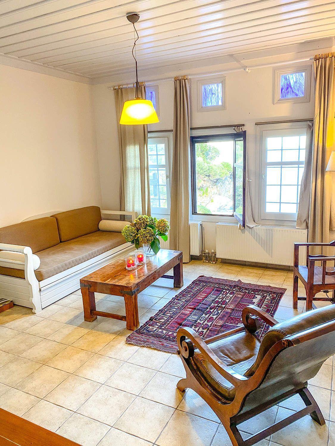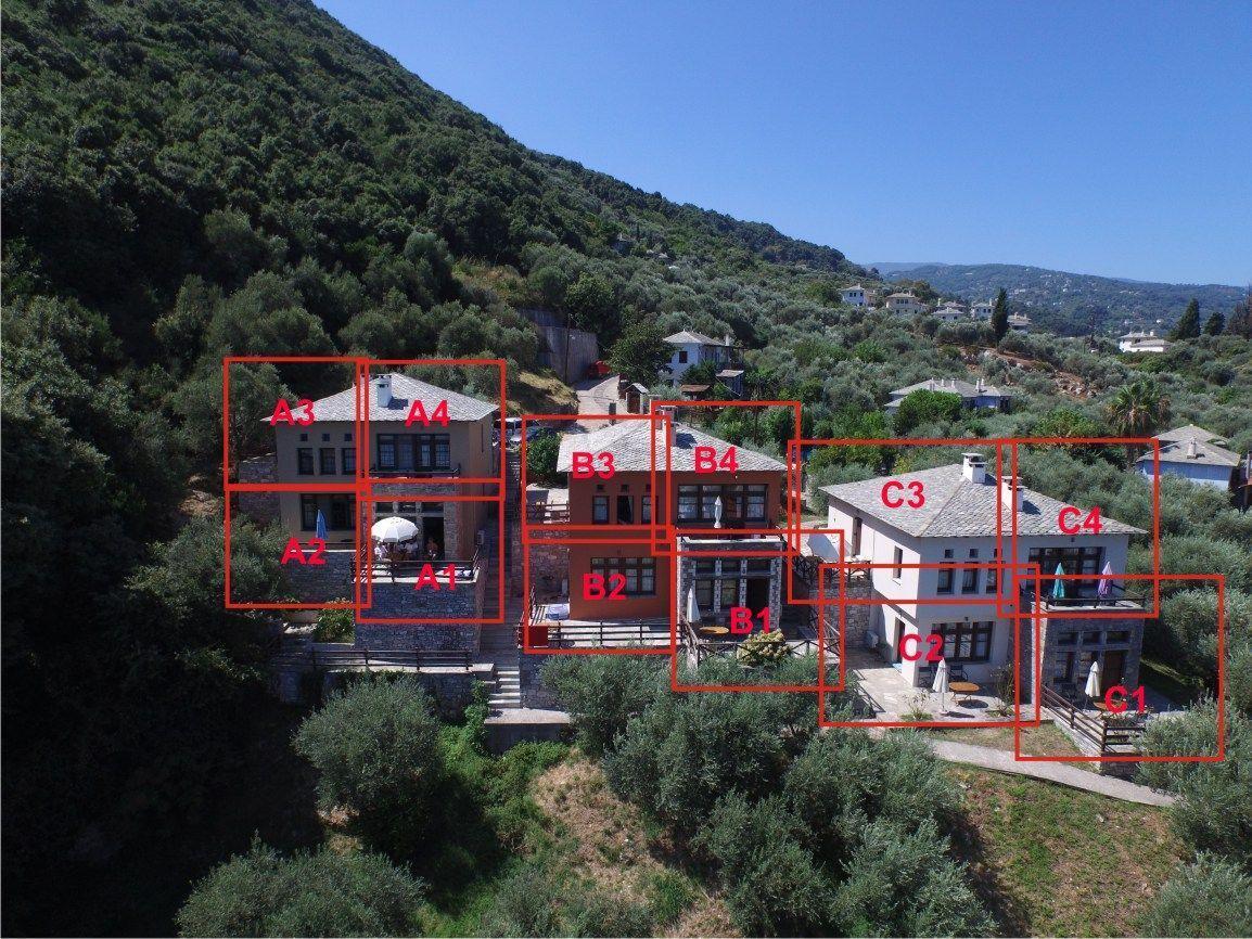 The houses are built in a 9,000 square meter property surrounded by olive trees and consist of three buildings. Each building has 4 studios (two upstairs and two on the ground floor). All are equally modern and tastefully furnished and offer a relaxing holiday. They are situated practically in the middle of nature between mountain and sea, between heaven and earth. The studios have a lovely living room with a fireplace, shower / WC, a properly equipped kitchenette, a double bed and a sofa bed, which also is suitable for a third adult or for 2 children. The studios also have air conditioning, Wi-Fi internet access, TV, balcony with garden furniture and view at the Aegean sea.
