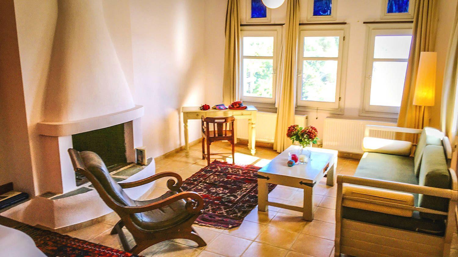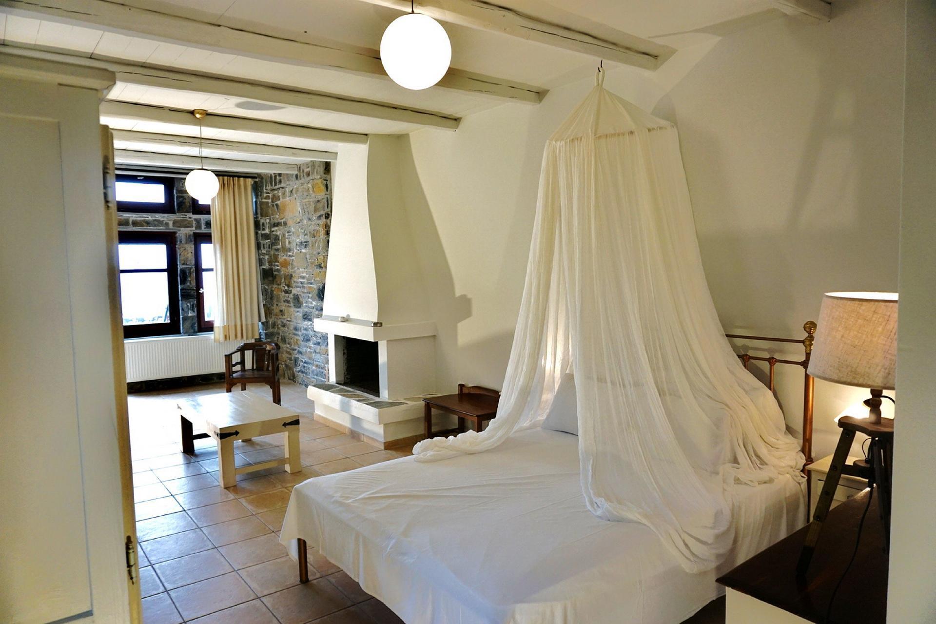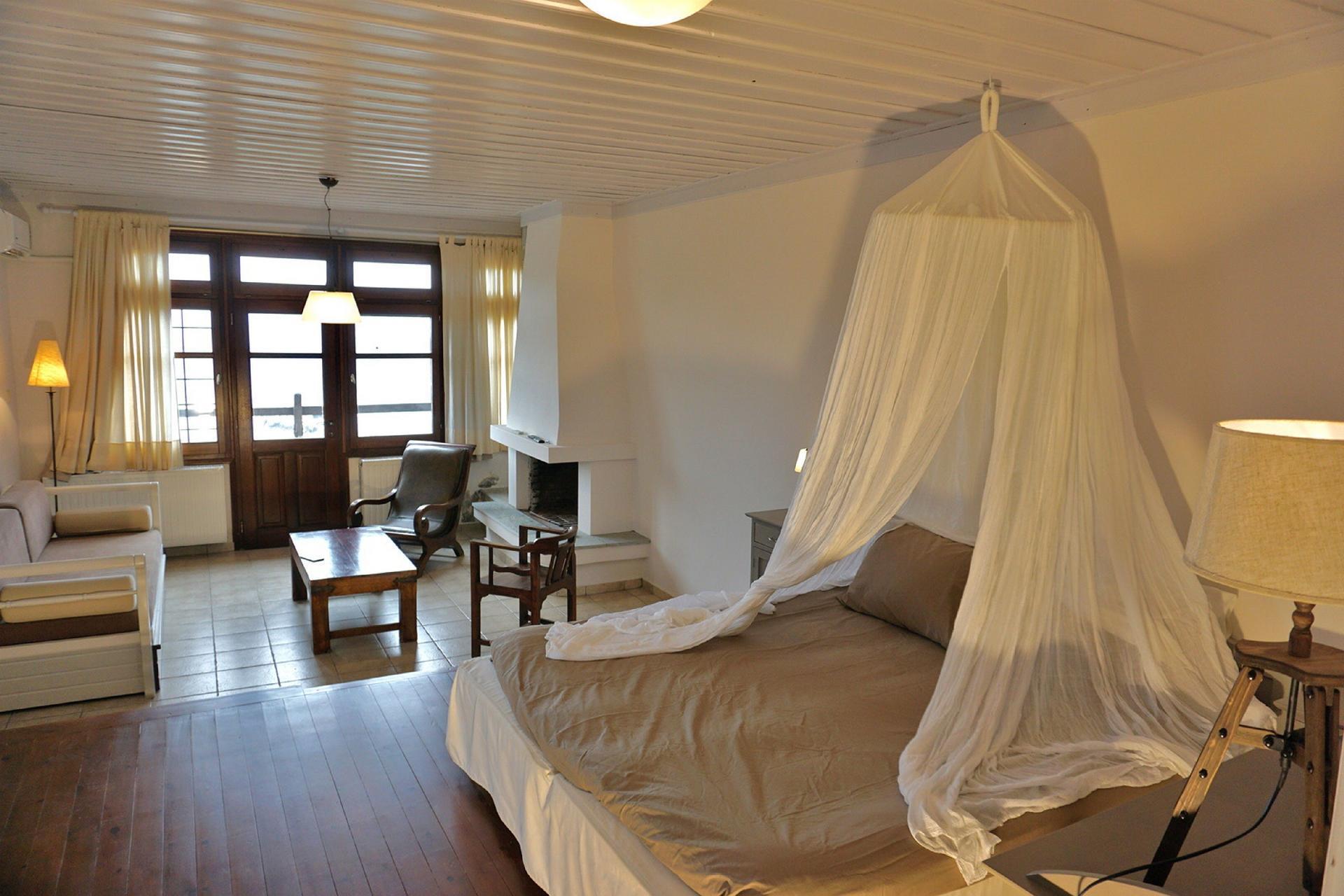 The houses are built in a 9,000 square meter property surrounded by olive trees and consist of three buildings. Each building has 4 studios (two upstairs and two on the ground floor). All are equally modern and tastefully furnished and offer a relaxing holiday. They are situated practically in the middle of nature between mountain and sea, between heaven and earth. The studios have a lovely living room with a fireplace, shower / WC, a properly equipped kitchenette, a double bed and a sofa bed, which also is suitable for a third adult or for 2 children. The studios also have air conditioning, Wi-Fi internet access, TV, balcony with garden furniture and view at the Aegean sea.