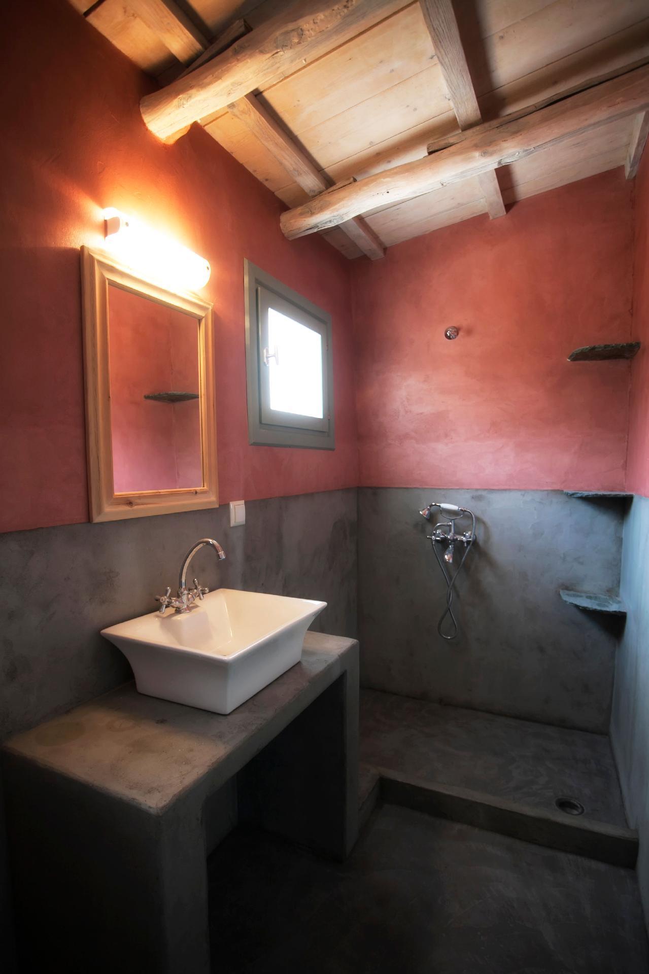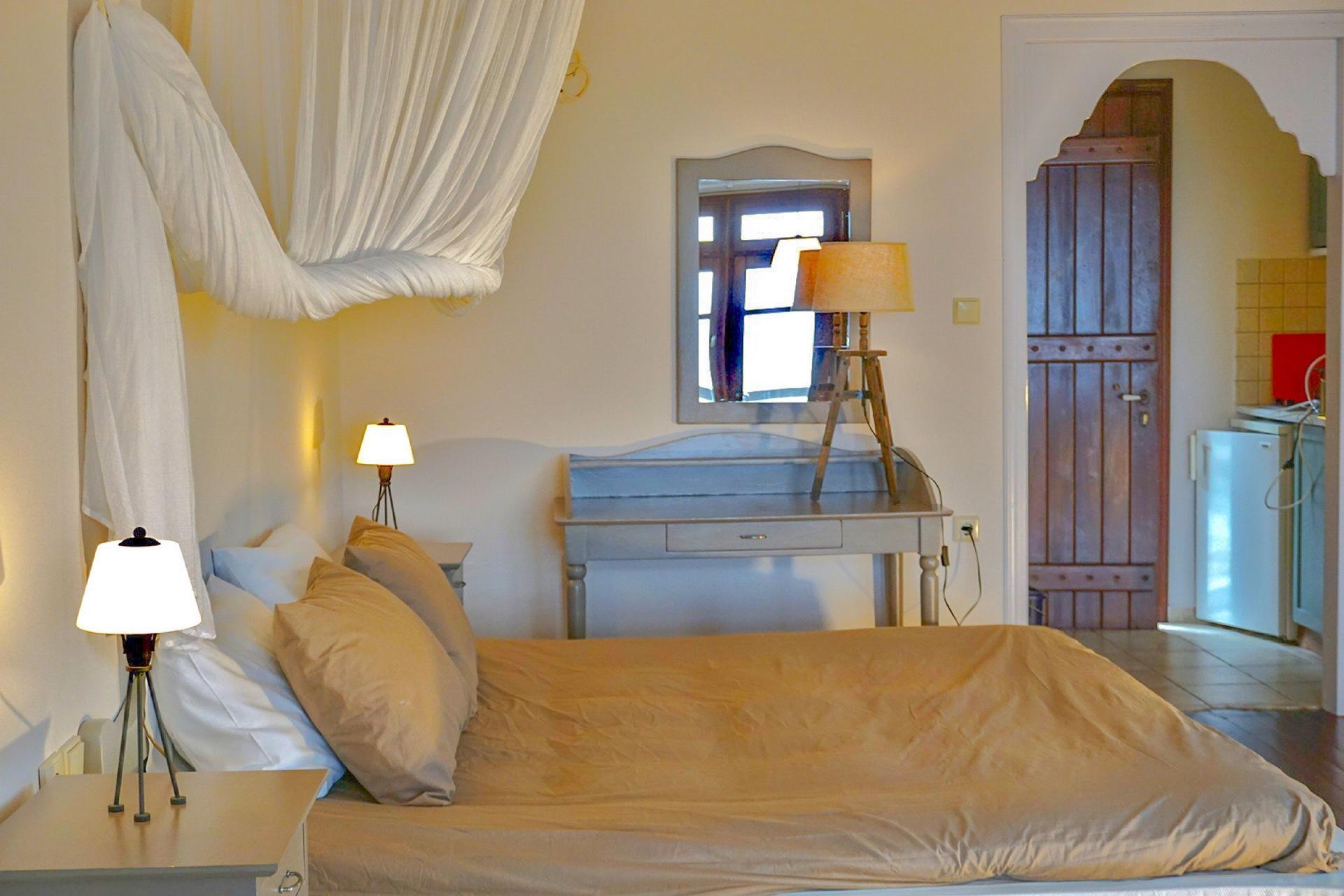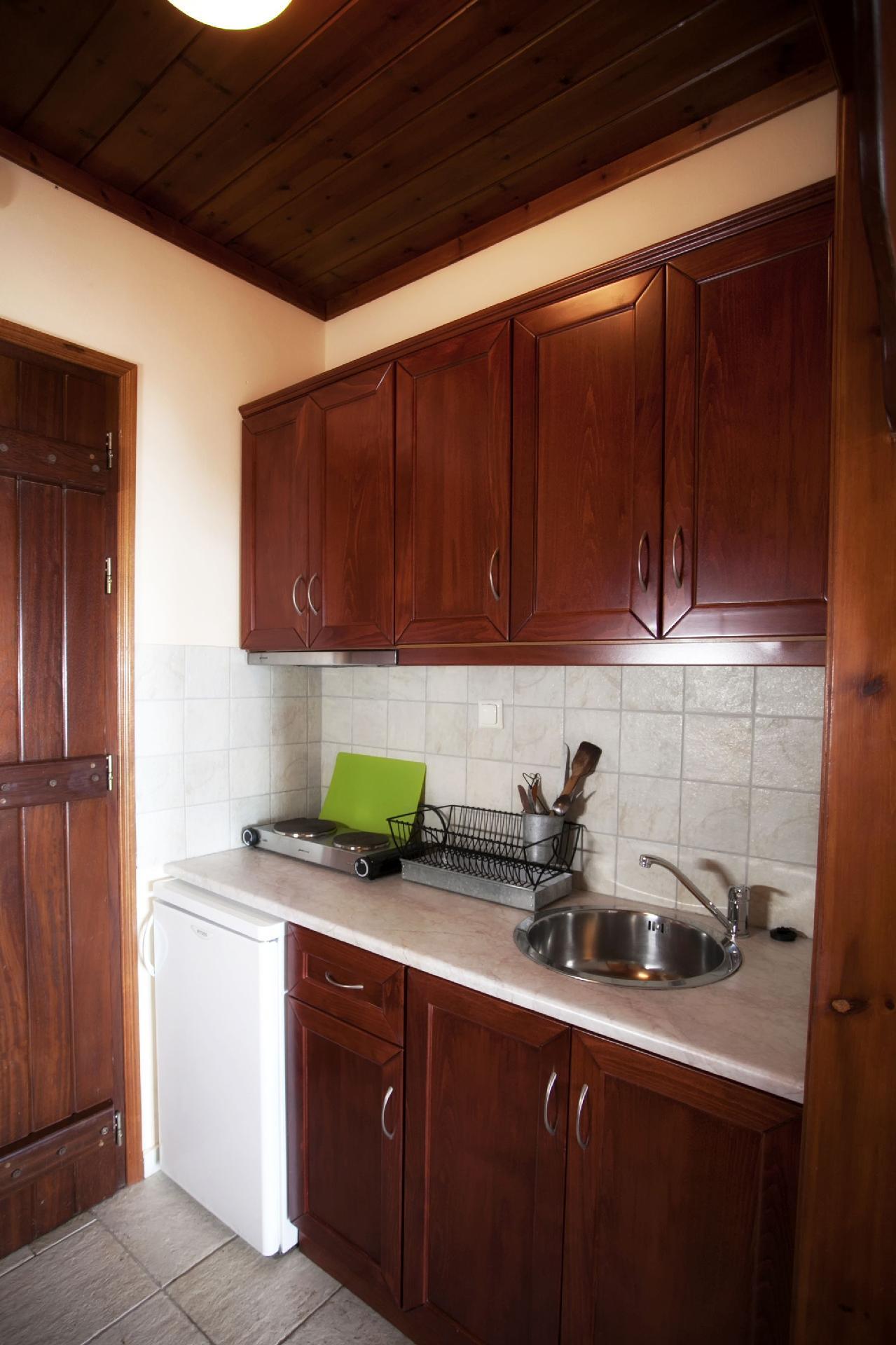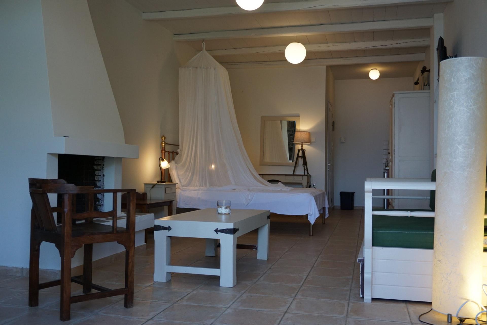 The houses are built in a 9,000 square meter property surrounded by olive trees and consist of three buildings. Each building has 4 studios (two upstairs and two on the ground floor). All are equally modern and tastefully furnished and offer a relaxing holiday. They are situated practically in the middle of nature between mountain and sea, between heaven and earth. The studios have a lovely living room with a fireplace, shower / WC, a properly equipped kitchenette, a double bed and a sofa bed, which also is suitable for a third adult or for 2 children. The studios also have air conditioning, Wi-Fi internet access, TV, balcony with garden furniture and view at the Aegean sea.