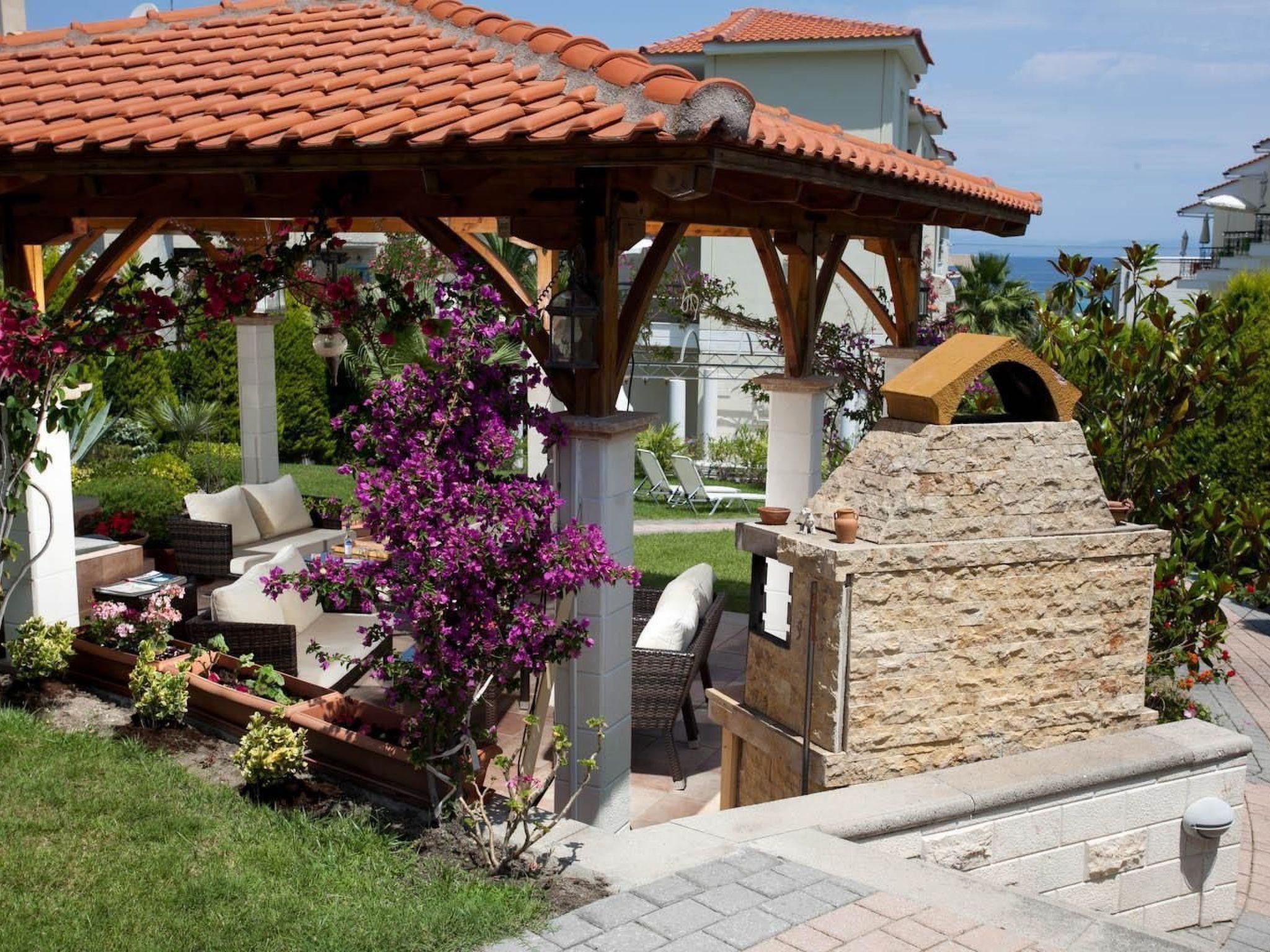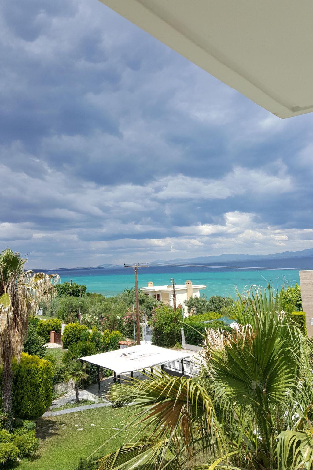 A park-like garden welcomes you with spacious grassy areas as well as cypresses, shrubs and palm trees. A large pergola and an outdoor barbecue invite you to eat and enjoy al fresco dining. Enjoy the beautiful weather on the communal terrace. The terrace is equipped with garden furniture, parasol and some garden loungers. The view of Mount Athos and the whole of Halkidiki is indescribable. The property is fenced. Enjoy the surroundings, the view of the garden and the beautiful weather on your own balcony with garden furniture.