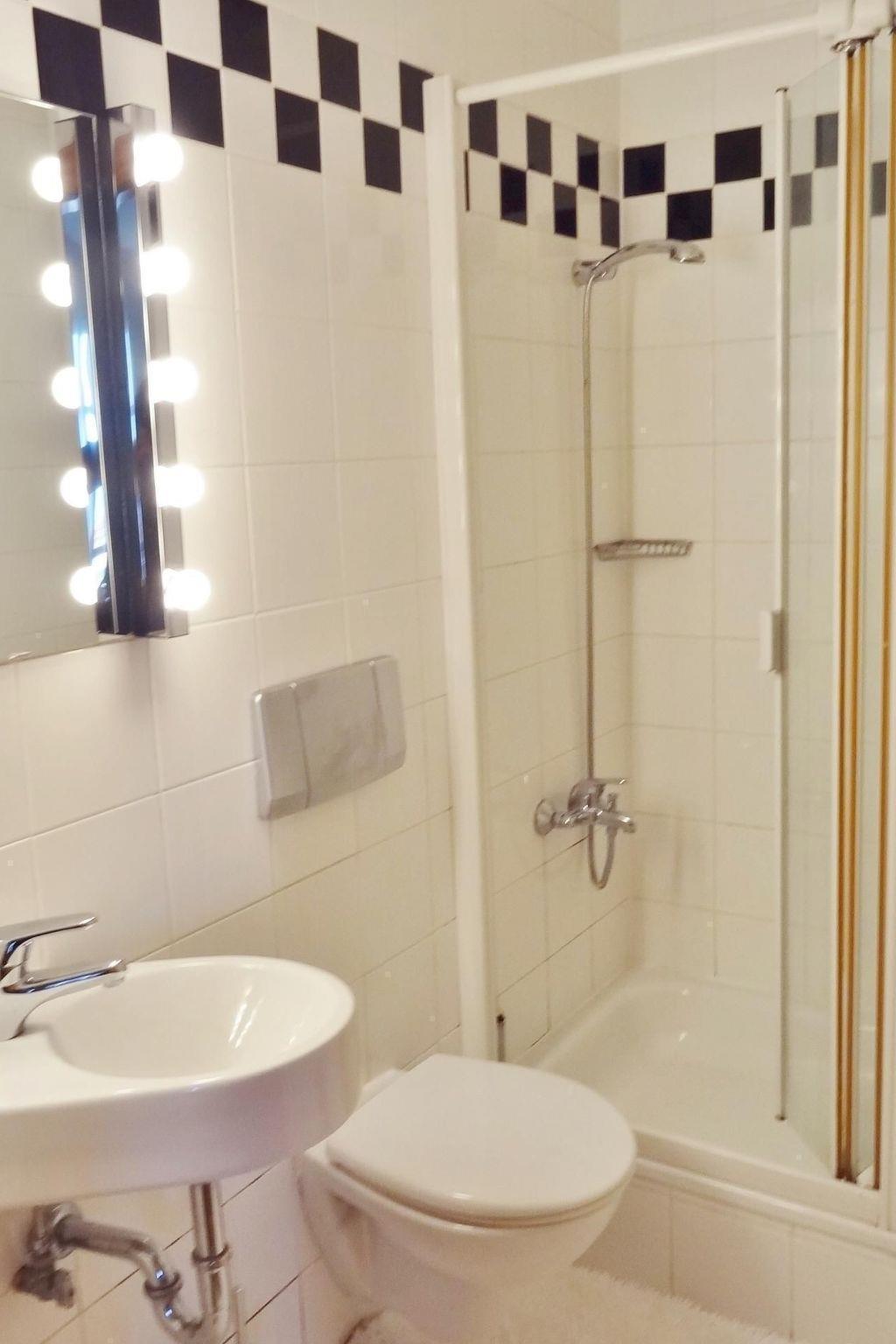 The hallway also leads to a very attractively designed bathroom with a bathtub, WC, large undermounted washbasin and a wall cupboard set into the wall.