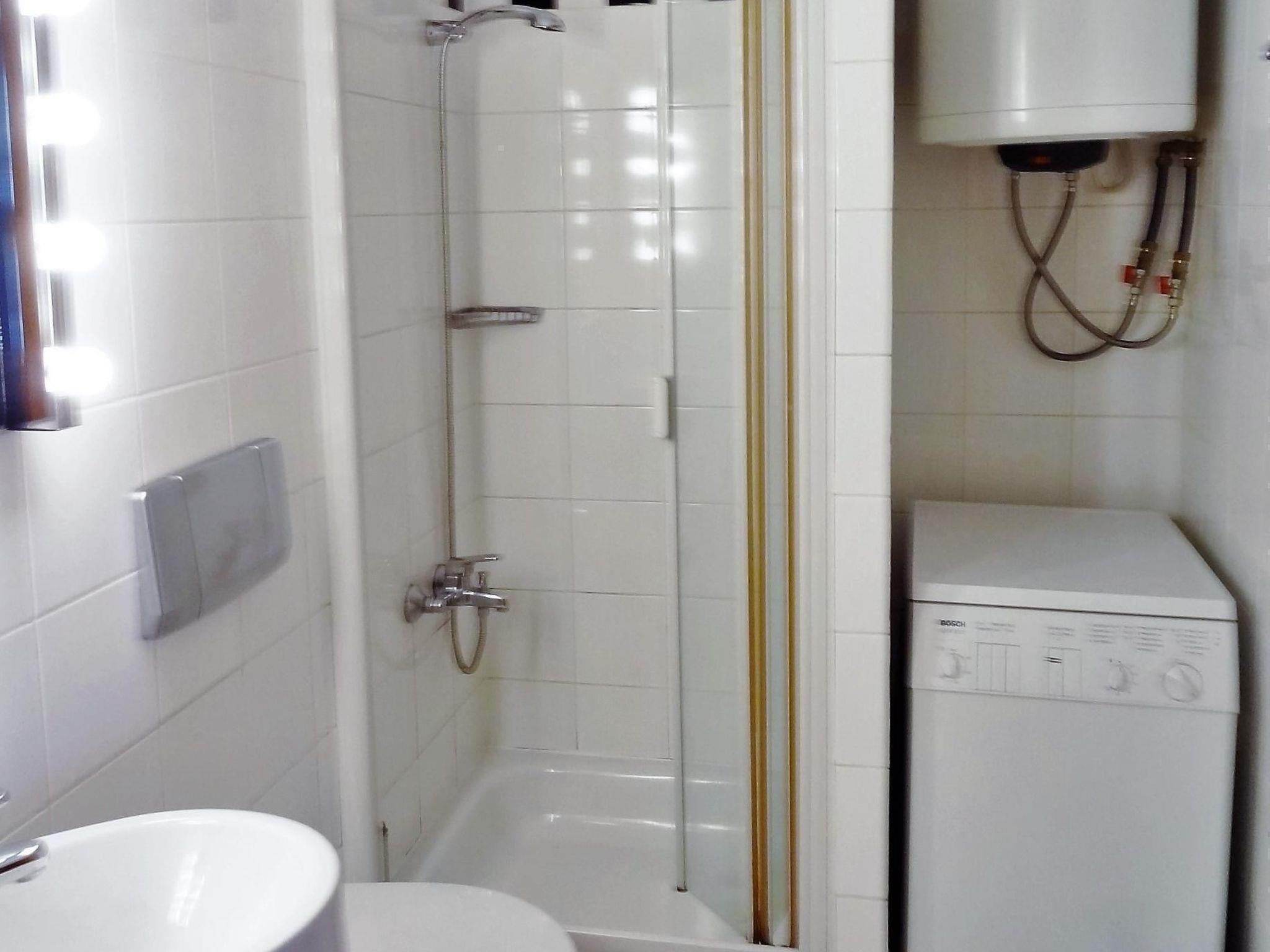 Next to the kitchen, concealed by the fireplace, is a shower room with glass doors, WC, wash hand basin with mirror and separate washing machine.