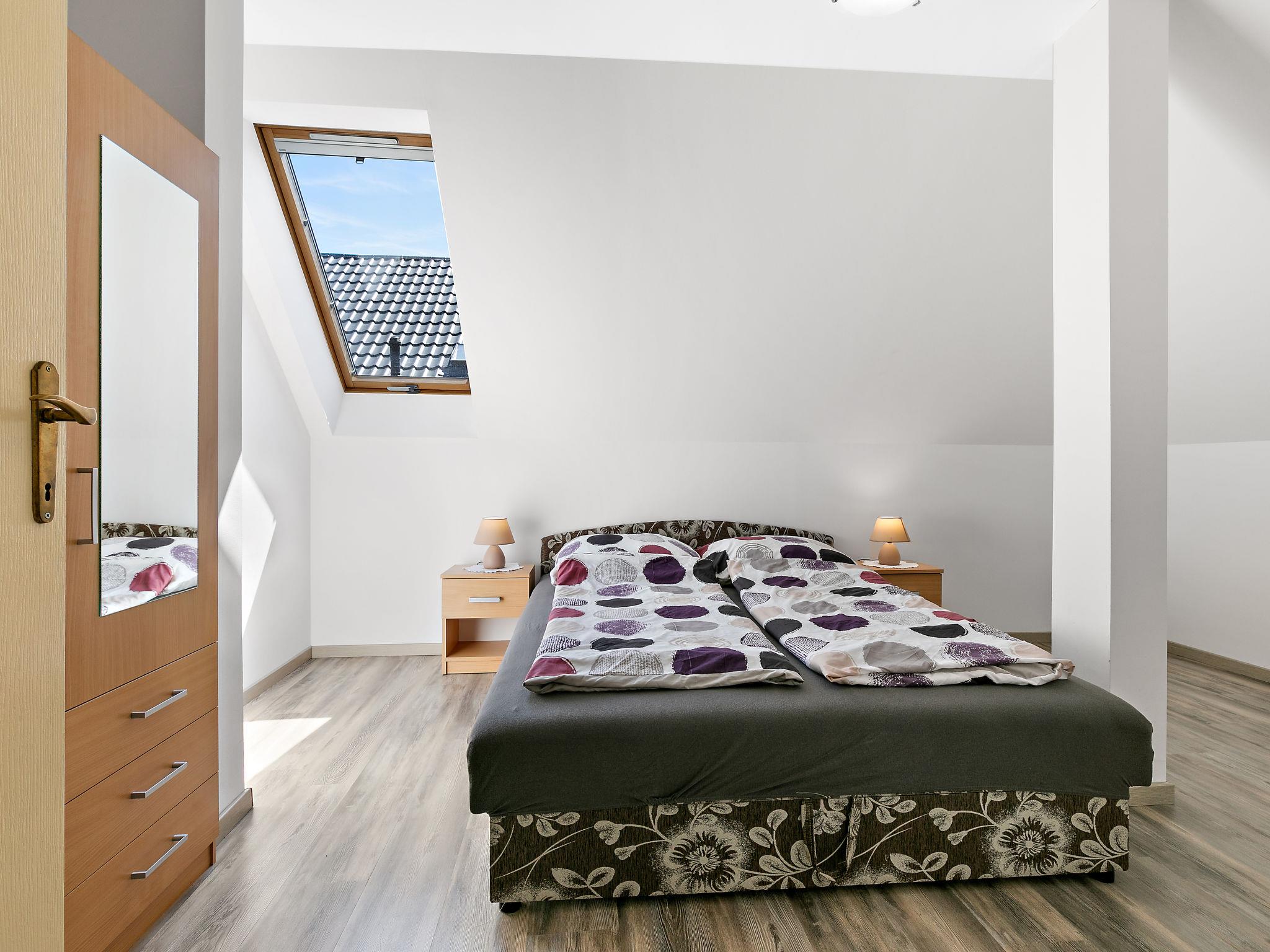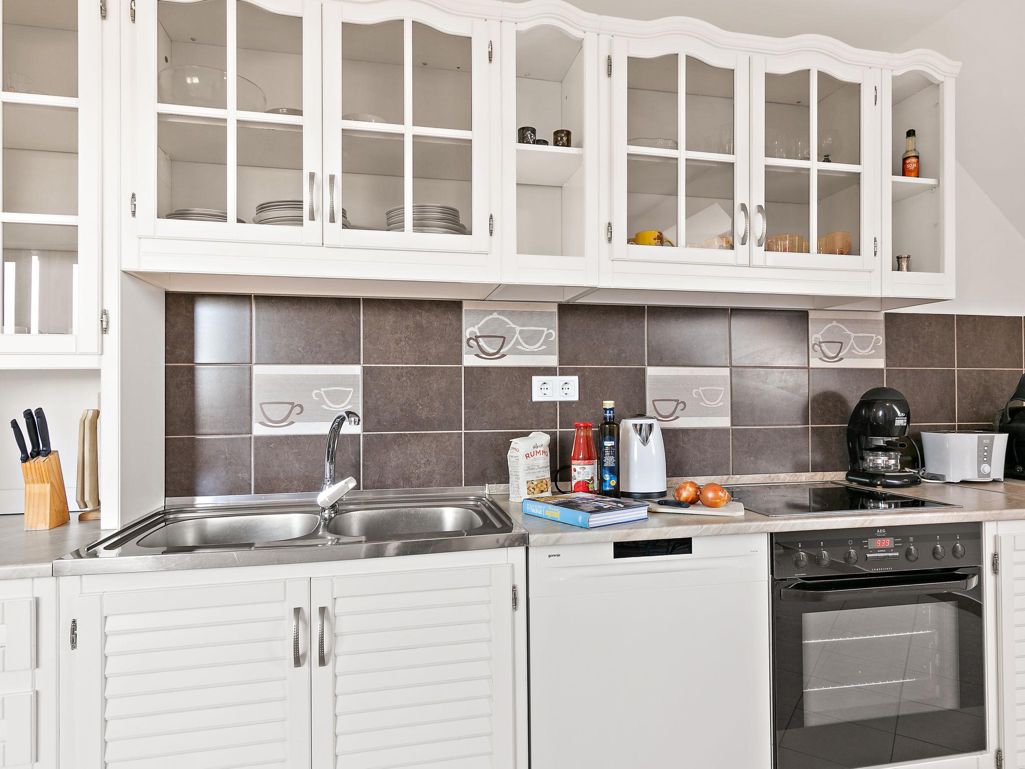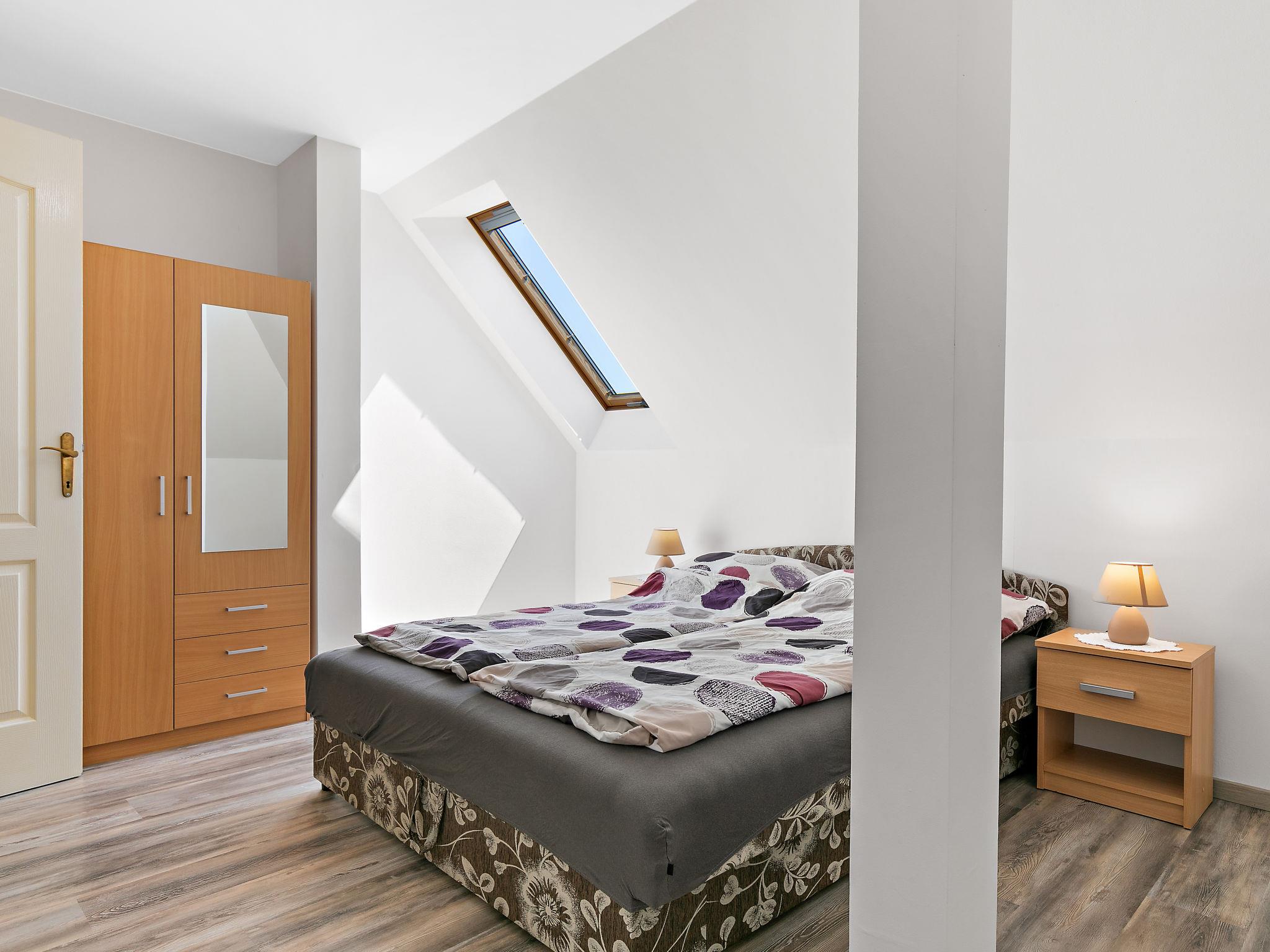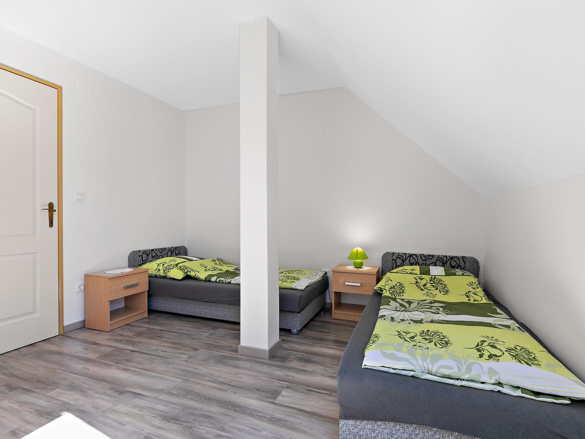 "Beate", 5-room apartment 120 m2 on 1st floor. With sloping ceilings, modern furnishings: living room with satellite TV and air conditioning. Exit to the balcony. 2 rooms, each room with 2 beds (90 cm, length 200 cm). 2 rooms, each room with 1 french bed (160 cm, length 200 cm). Open kitchen (oven, dishwasher, 4 ceramic glass hob hotplates, toaster, kettle, microwave, electric coffee machine) with dining table. Shower/WC, sep. WC. No heating option. On the lower ground floor: kitchen (4 hot plates, oven, dishwasher) with separate WC. Exit to the garden. Balcony, patio roofed. Balcony furniture, barbecue, deck chairs (6). Facilities: washing machine, baby cot. Internet (WiFi, free). Please note: non-smokers only. Private entrance. MA19011110