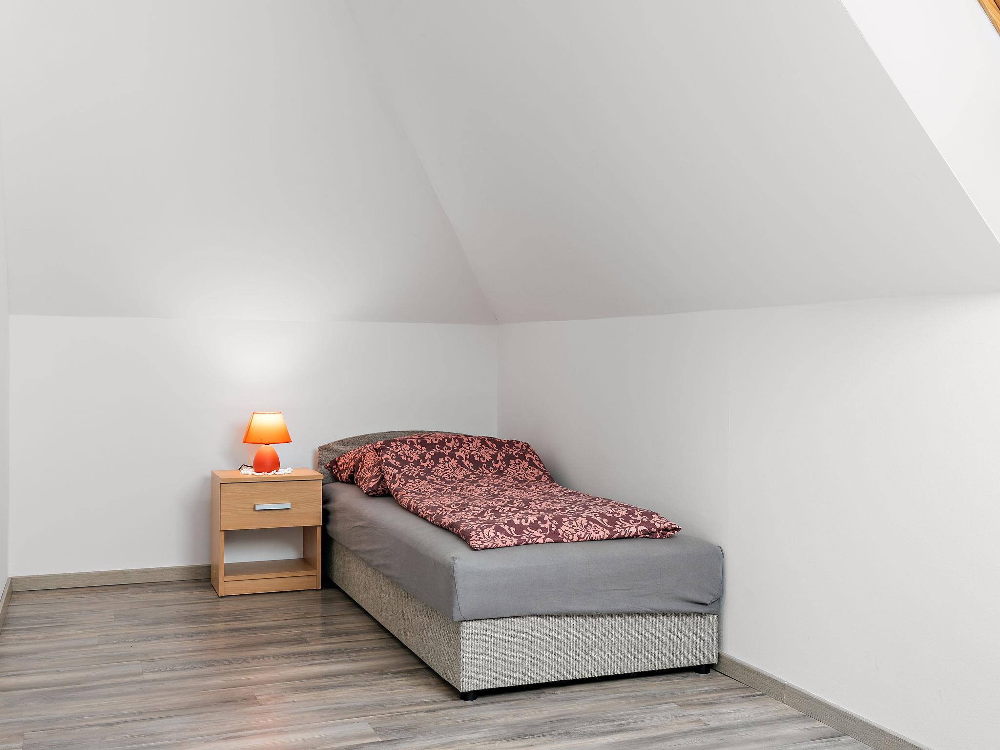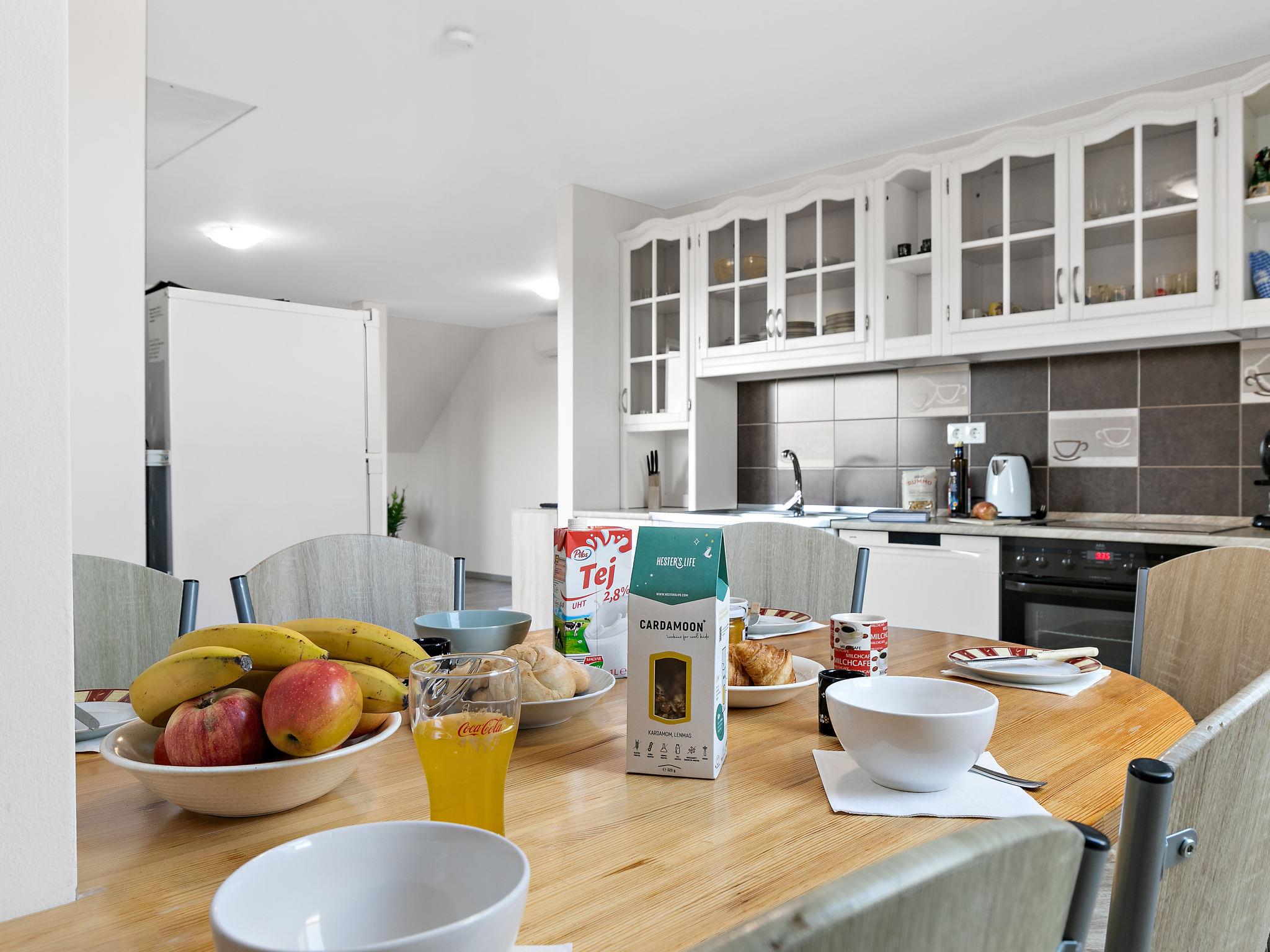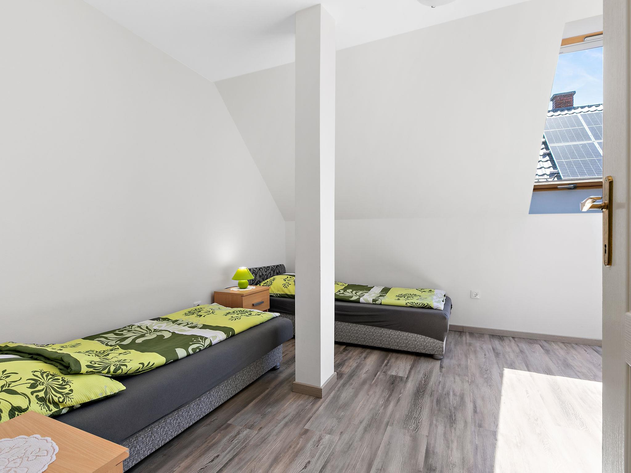 "Beate", 5-room apartment 120 m2 on 1st floor. With sloping ceilings, modern furnishings: living room with satellite TV and air conditioning. Exit to the balcony. 2 rooms, each room with 2 beds (90 cm, length 200 cm). 2 rooms, each room with 1 french bed (160 cm, length 200 cm). Open kitchen (oven, dishwasher, 4 ceramic glass hob hotplates, toaster, kettle, microwave, electric coffee machine) with dining table. Shower/WC, sep. WC. No heating option. On the lower ground floor: kitchen (4 hot plates, oven, dishwasher) with separate WC. Exit to the garden. Balcony, patio roofed. Balcony furniture, barbecue, deck chairs (6). Facilities: washing machine, baby cot. Internet (WiFi, free). Please note: non-smokers only. Private entrance. MA19011110