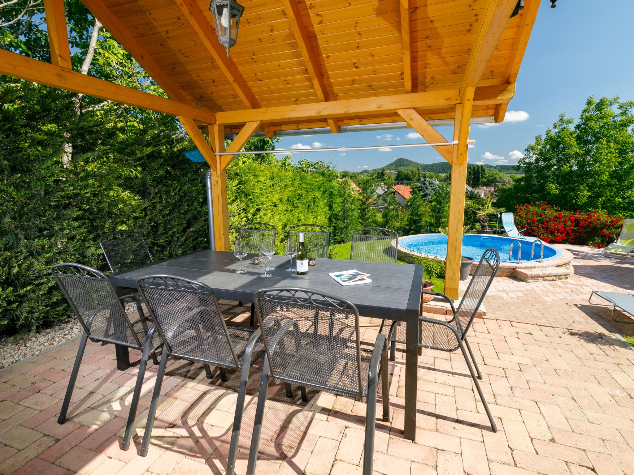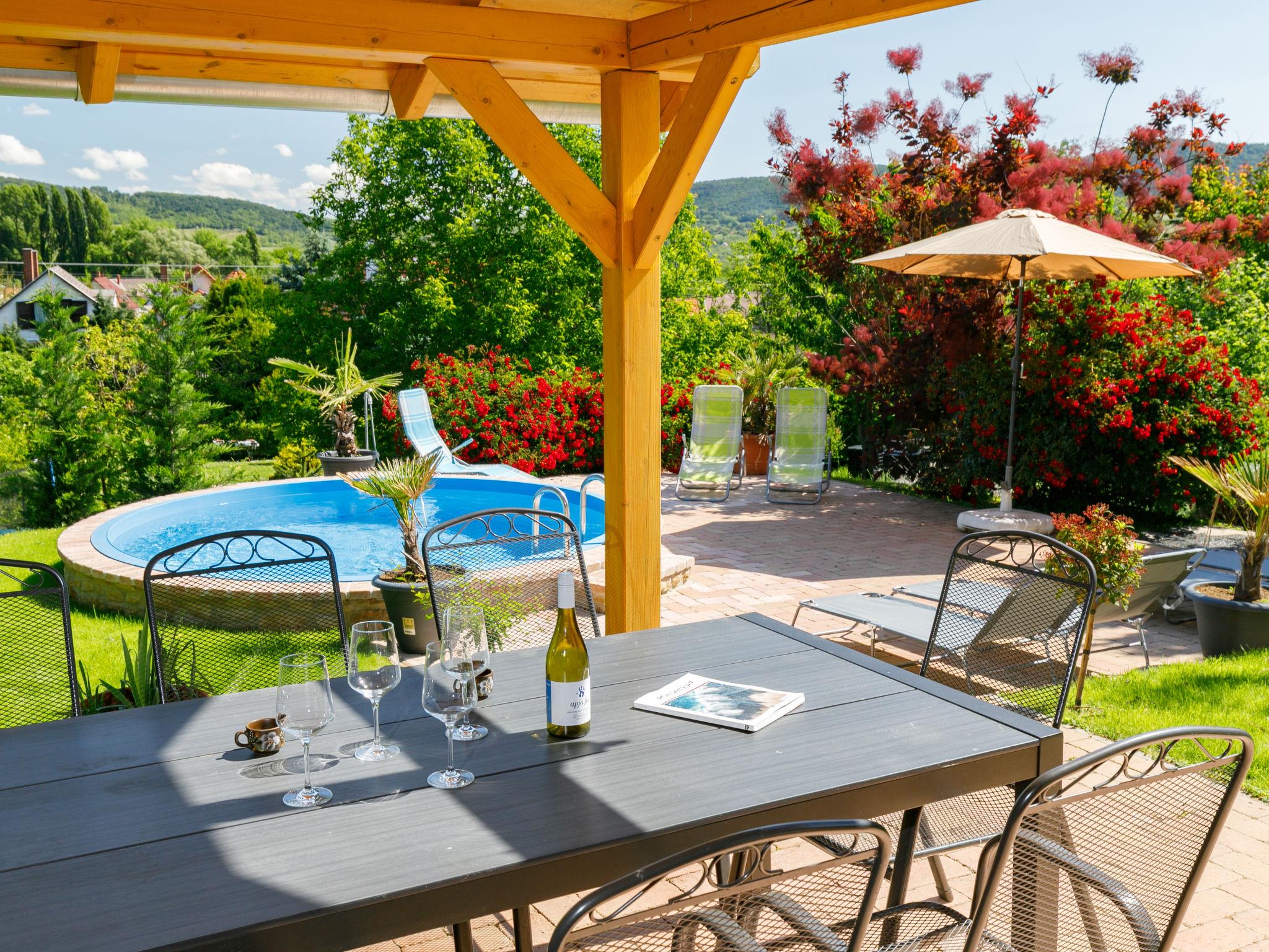Badacsonytomaj 25 km from Keszthely: Beautiful 2-family house "Beate". 1.4 km from the centre of Badacsonytomaj, 4.5 km from the centre of Badacsony, 38 km from the centre of Keszthely, on a slope, in the residential district, 2 km from the lake, 1.8 km from the beach. For shared use: property 900 m2 (fenced) with lawn. Children's playground. Private: terraced garden with lawn, swimming pool (4 x 2 m, depth 1 cm, seasonal availability: 01.May. - 30.Sep.). Garden furniture, parking (for 3 cars) on the premises. Shop 800 m, grocery 300 m, supermarket 11 km, restaurant 1 km, bakery 1 km, bicycle rental 1 km, grass beach 2 km, thermal baths "Hévíz" 30 km. Tennis 2 km, riding stable 4 km, cycle lane 1.5 km, children's playground 550 m. Nearby attractions: Festetics Castle 26 km, Tihany 37 km, Balatonfüred Annagora Aquapark 38 km, Tapolca Lake Cave Visitor Centre 10 km, Szigliget Castle 88 km, Folly Arboretum 3 km. Please note: the owner lives in the same residence.