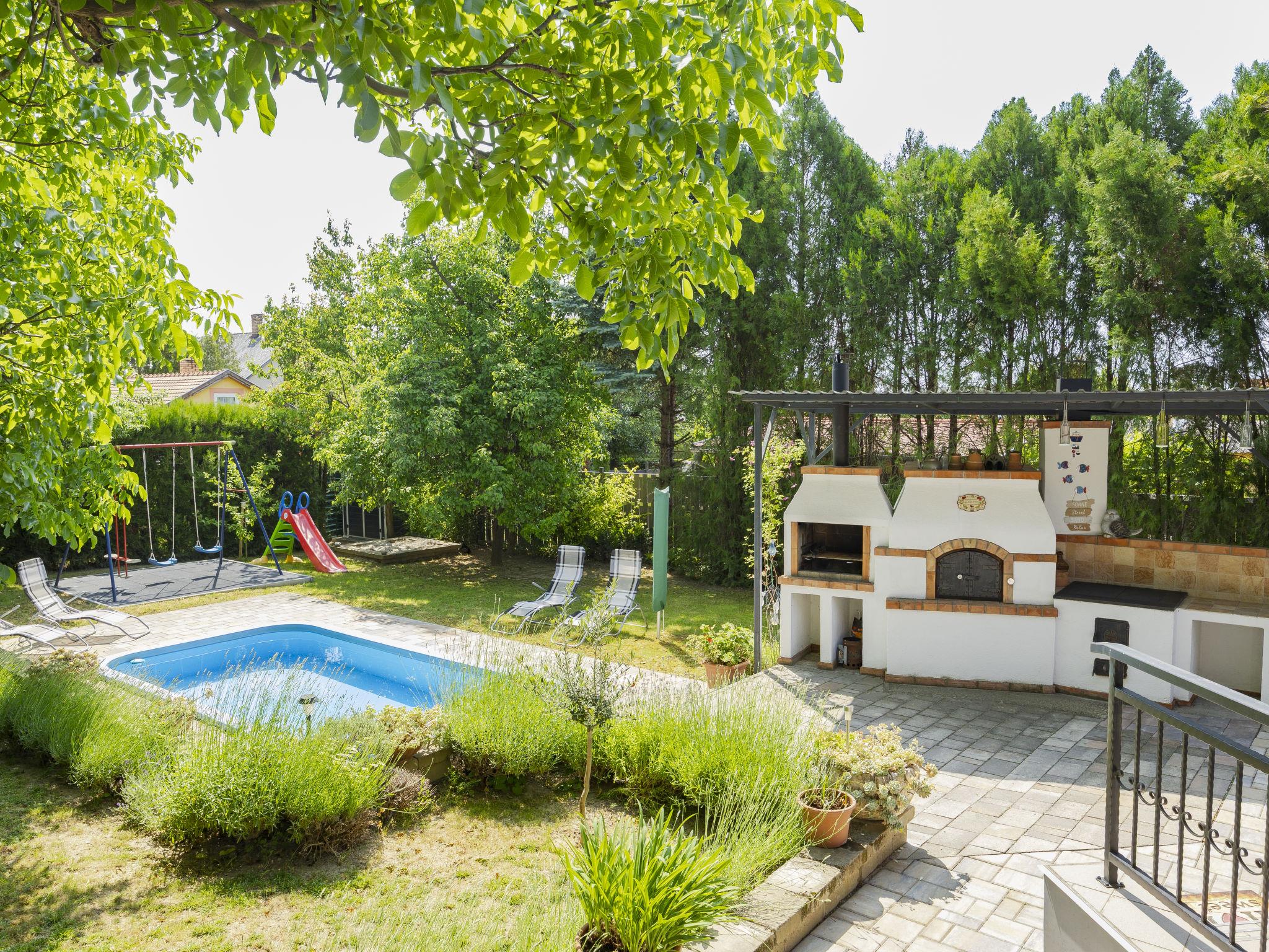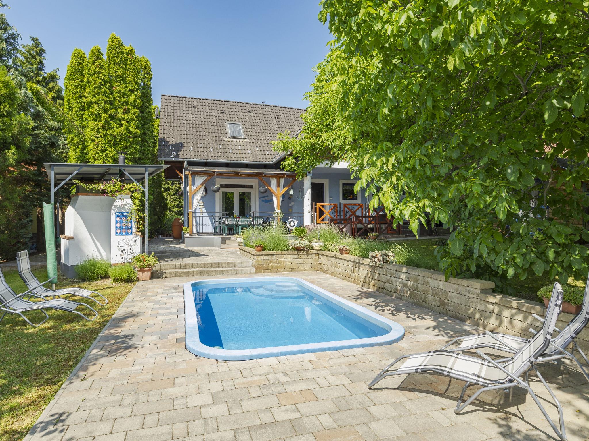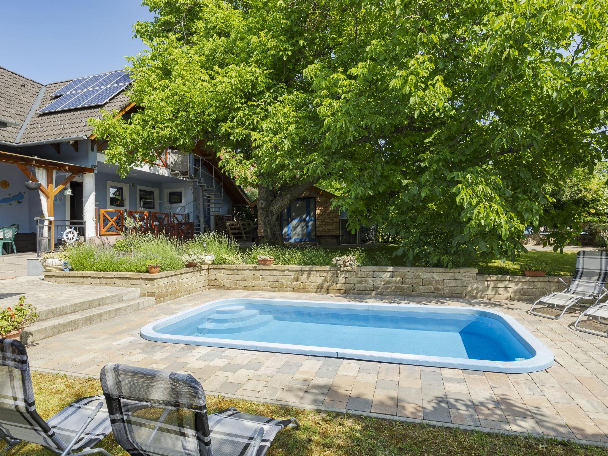 Balatonederics 12 km from Badacsony: Beautiful single-family house "Emöke", detached. In the district of Balatonederics 500 m from the centre of Baltonederics, 5 km from the centre of Balatongyörök, 12 km from the centre of Keszthely, in the residential district, 1.5 km from the lake, 1.4 km from the beach. Private: property 1'000 m2 (fenced), well-kept garden with lawn and wildlife garden, swimming pool (4 x 2 m, depth 120 cm, seasonal availability: 15.May. - 25.Sep.). Barbecue, children's playground (swing, sandbox). In the house: air conditioning. Stepped path (5 steps) to the house. Parking on the premises. Grocery 500 m, supermarket 14 km, restaurant 600 m, thermal baths "Hévíz" 20 km. Tennis 8 km, minigolf 8 km, riding stable 4 km, cycle lane 1.2 km, children's playground 550 m. Nearby attractions: Tapolca Lake Cave Visitor Centre 13 km, Festetics Nature House visitor center 13 km, Szigliget Castle 6 km, Keszthely Giant Wheel 15 km, Hévíz Thermal Bath 20 km, Festetics Castle 15 km.