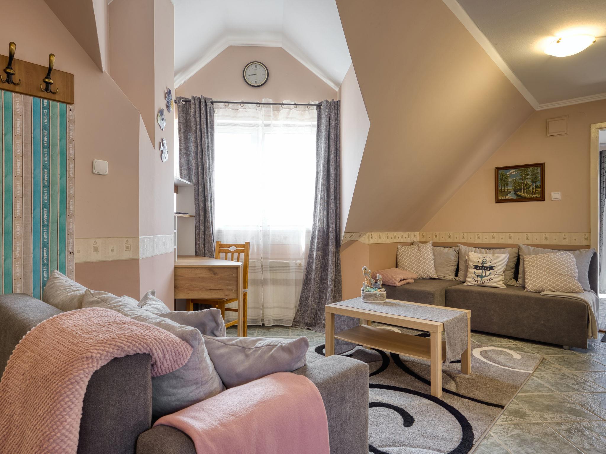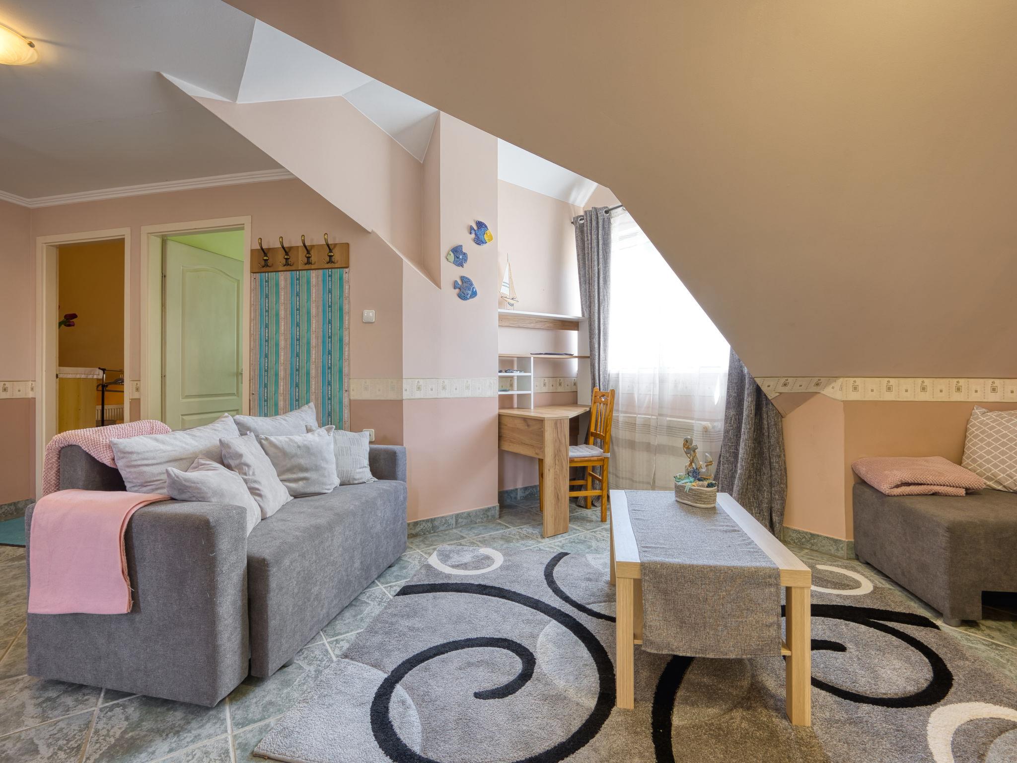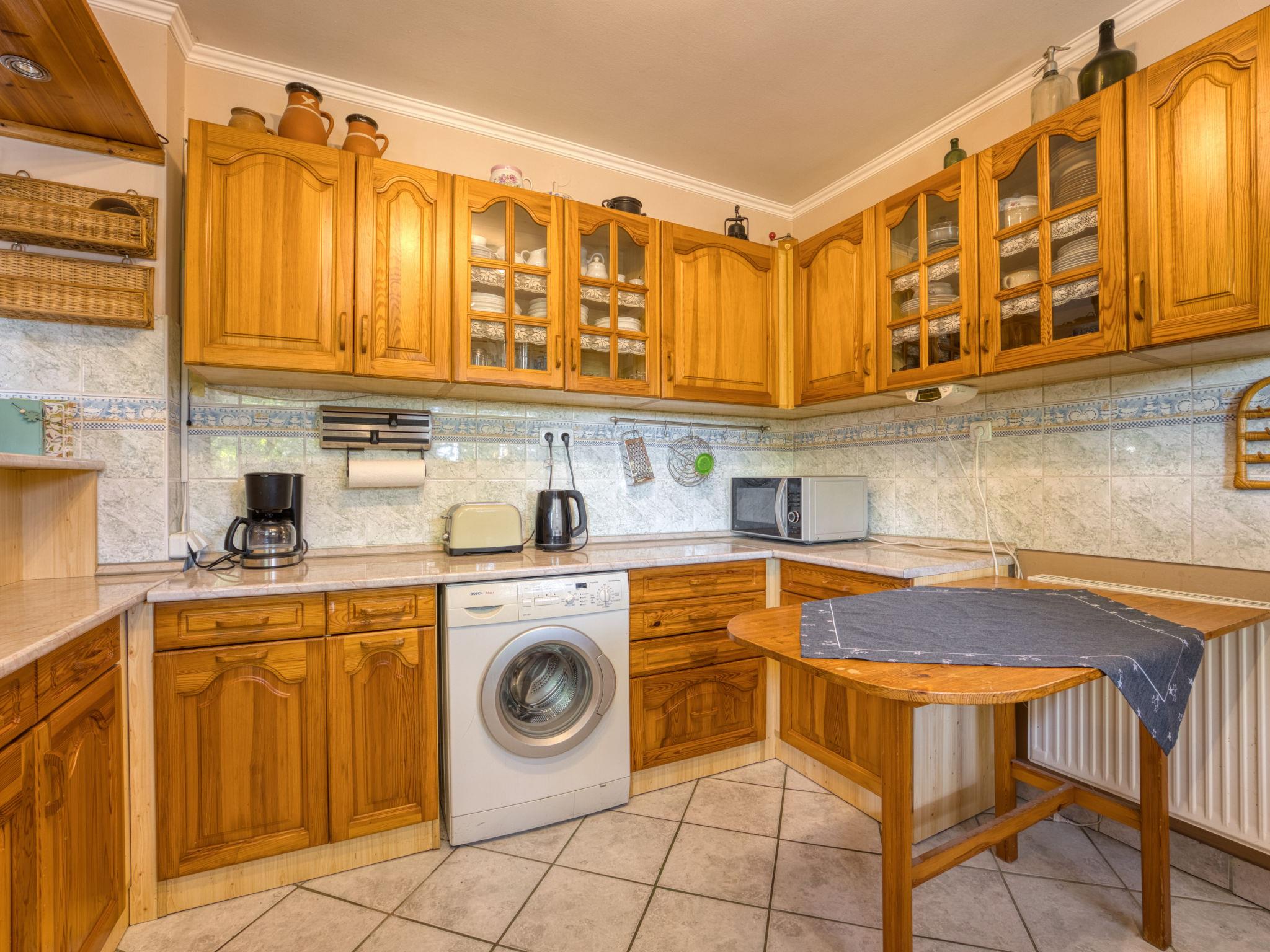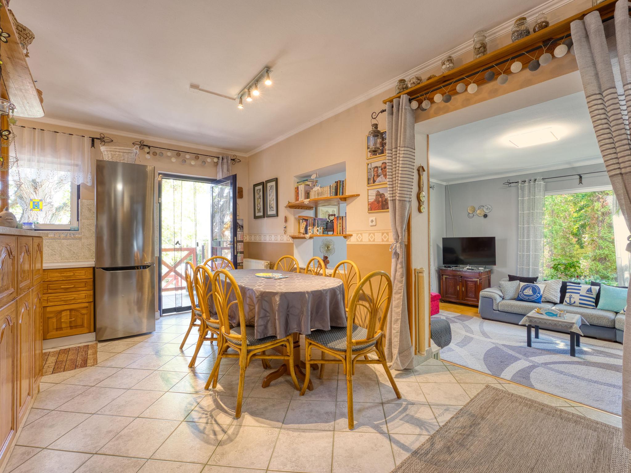 "Emöke", 7-room house 130 m2 on 2 levels. Cosy furnishings: living room with satellite TV (flat screen). Exit to the terrace. 1 room with 1 french bed. Open kitchen (oven, dishwasher, 4 ceramic glass hob hotplates, toaster, kettle, microwave, freezer, electric coffee machine) with dining table. Exit to the terrace. Shower/WC, sep. WC. No heating option. Upper floor: living room. 2 rooms, each room with 1 french bed (180 cm, length 200 cm). 1 room with 1 french bed (180 cm, length 200 cm). Exit to the balcony. 1 room with 1 sofabed. Exit to the balcony. Small kitchen (3 gas rings). Shower/WC. No heating option. Carpet. Balcony, terrace roofed, patio. Terrace furniture, barbecue, deck chairs (6). Facilities: washing machine, mosquito net, children's high chair, baby cot. Internet (WiFi, free). Please note: non-smoking house. MA19016218