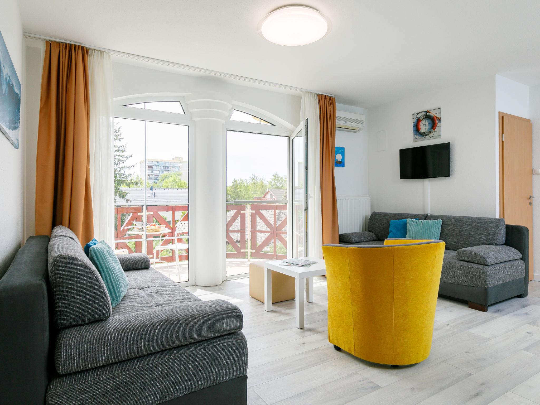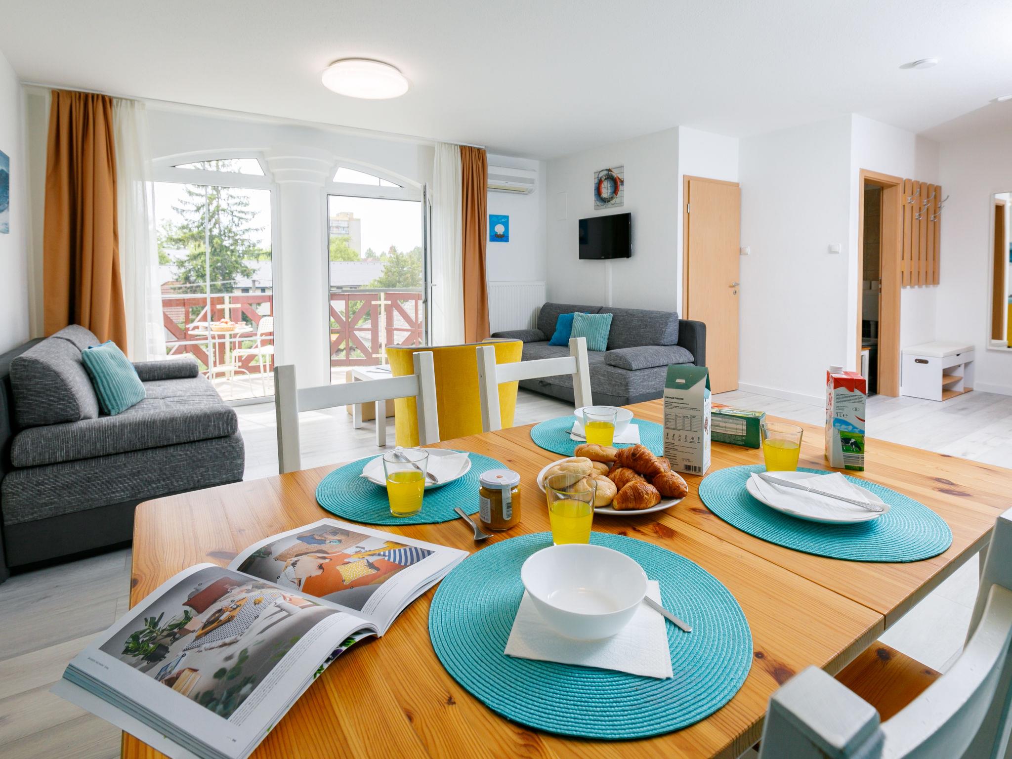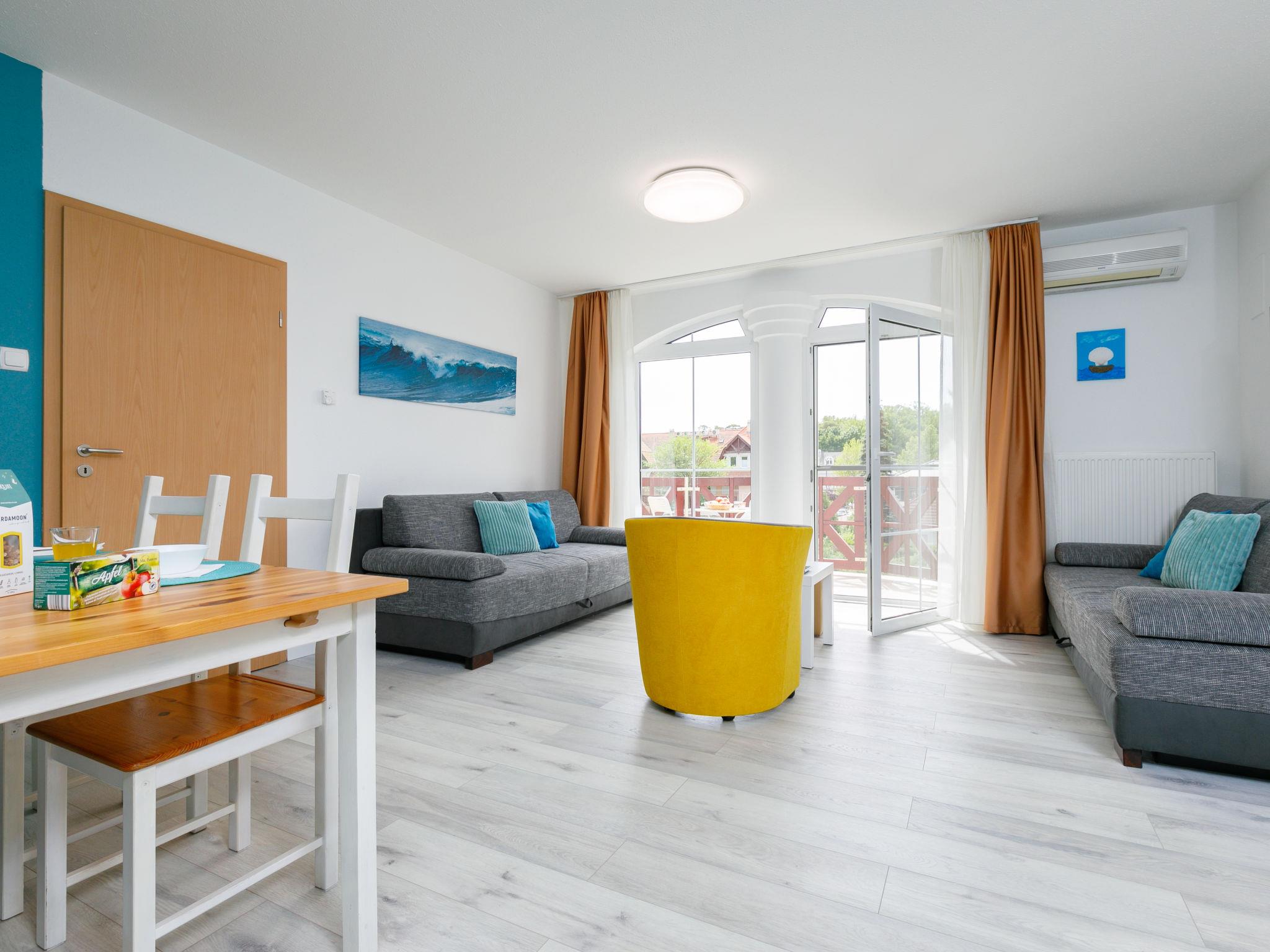 "Summer", 2-room apartment on 2nd floor, south-west facing position. Spacious and bright, comfortable and stylish furnishings: open living/dining room with 2 double sofabeds (140 cm, length 200 cm), dining table and cable TV (flat screen), air conditioning. Exit to the balcony, west facing position. 1 double bedroom with 1 french bed (160 cm, length 200 cm). Exit to the balcony, south facing position. Open kitchen (oven, 2 ceramic glass hob hotplates, kettle, microwave, electric coffee machine). Bathroom, sep. WC. Heating (extra). 2 balconies, south facing position and west facing position. Balcony furniture. Facilities: mosquito net, children's high chair, baby cot (extra). Internet (WiFi). Please note: smoke alarm.