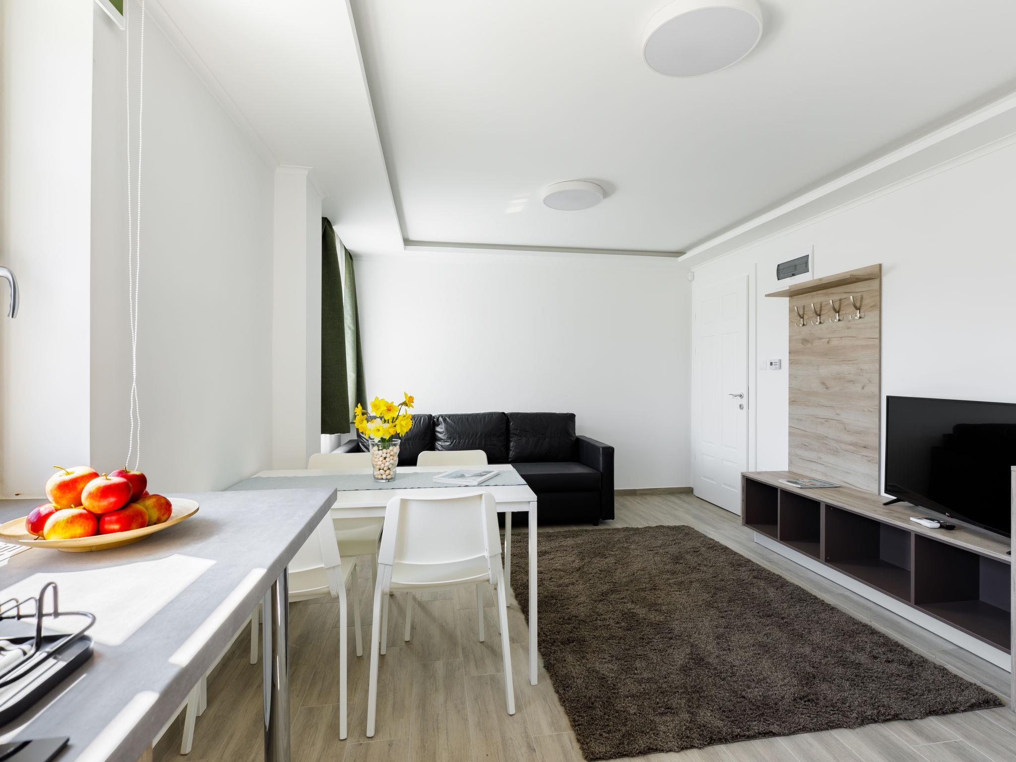 "Park 5", apartment on the upper floor. Beautiful and modern furnishings: open living/dining room with 2 sofabeds and cable TV (flat screen). 1 double bedroom with 1 french bed (160 cm, length 200 cm). Small, open kitchen (2 ceramic glass hob hotplates, microwave, electric coffee machine). Shower/WC. Floor heating. Solar power. North-west facing position. Facilities: children's high chair, baby cot (extra), hair dryer. Internet (WiFi). Please note: apartment courtyard side. Type of coffee machine: Nespresso.