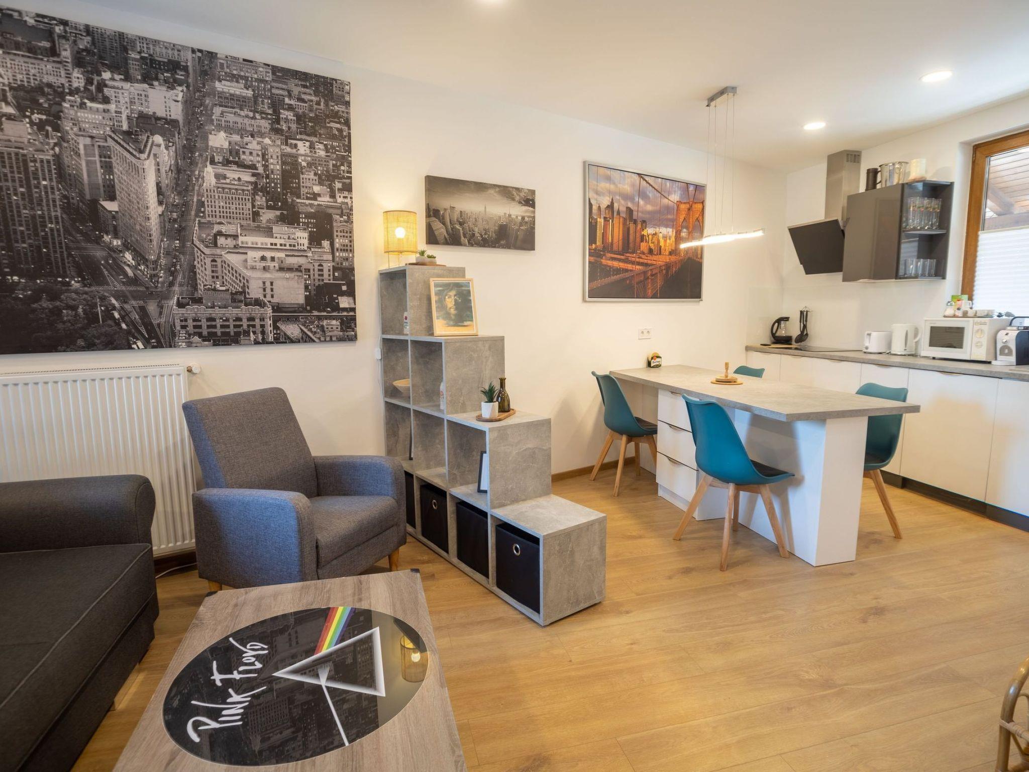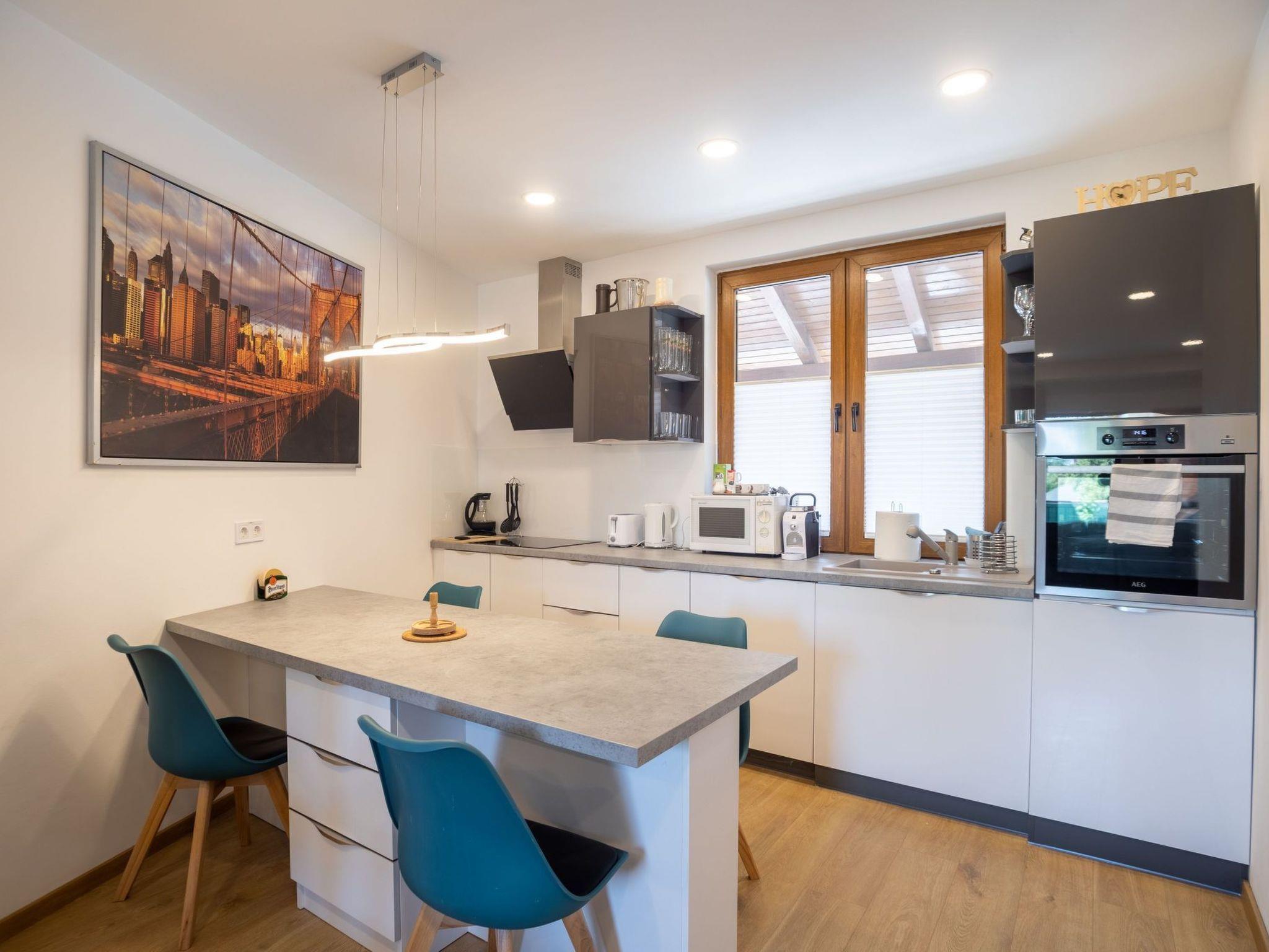 Inside, a stylishly furnished double room and a cosy twin room await you, accompanied by an American-style living room with integrated dining area and kitchenette. For your comfort, the bathroom is equipped with a shower, washing machine and WC; a separate WC further enhances living comfort. The modern kitchen equipment includes an electric cooker, coffee machine, fridge, microwave, toaster, kettle and dishwasher, leaving nothing to be desired for self-catering.