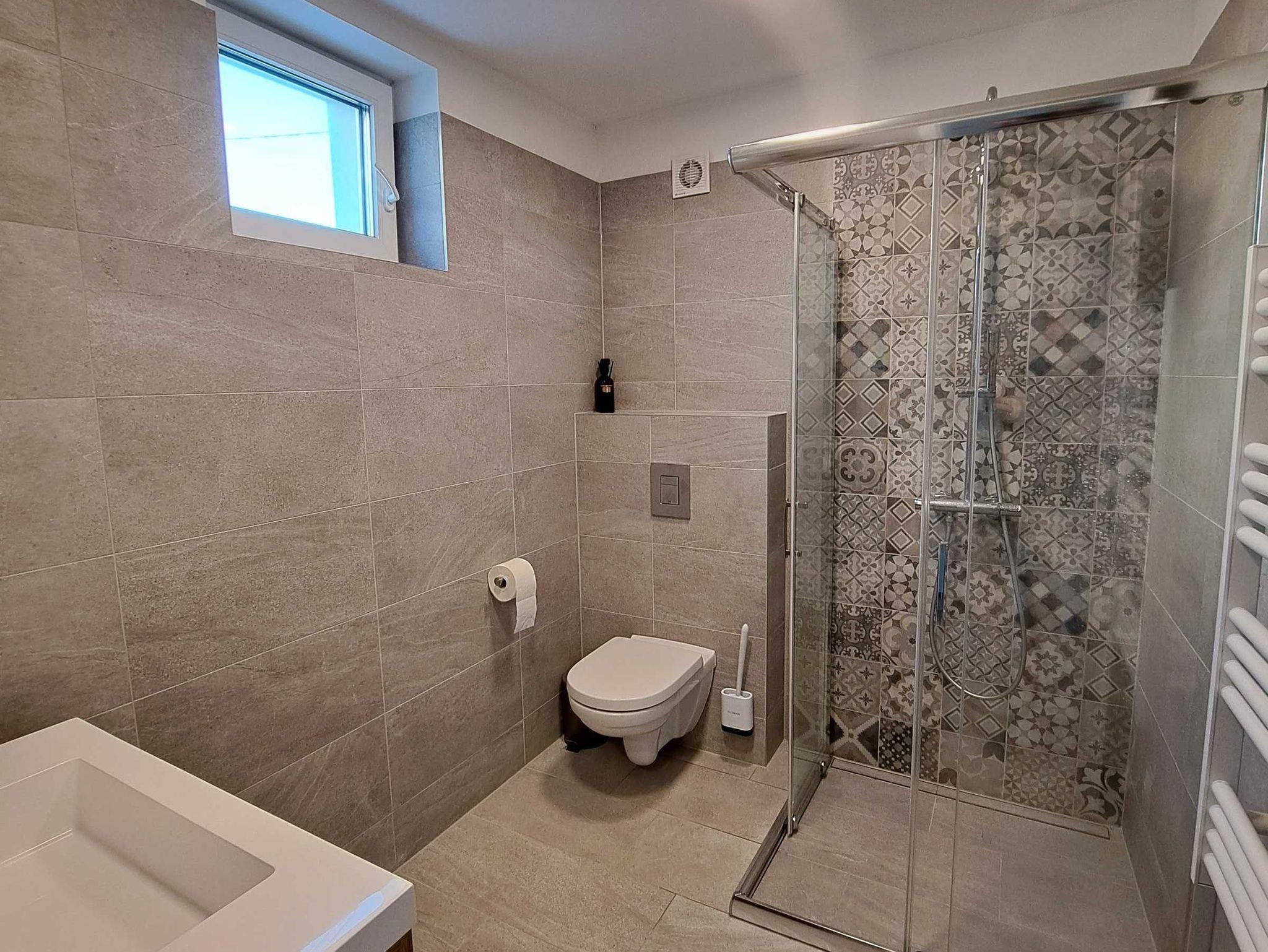 Auf der unteren Ebene des Hauses verfügt Apartment 1 über zwei Schlafzimmer, ein King Size Bett im Elternschlafzimmer und zwei Einzelbetten im Kinderzimmer. Auf dieser Ebene bietet das Wohnzimmer mit amerikanischer Küche einen angenehmen Lebensraum für Familie und Freunde. Neben dem Badezimmer und dem Gäste-WC befindet sich auf dieser Ebene auch eine Waschküche für einen komfortablen Urlaub. Sie erreichen den oberen Teil, Apartment 2 über eine separate Treppe.