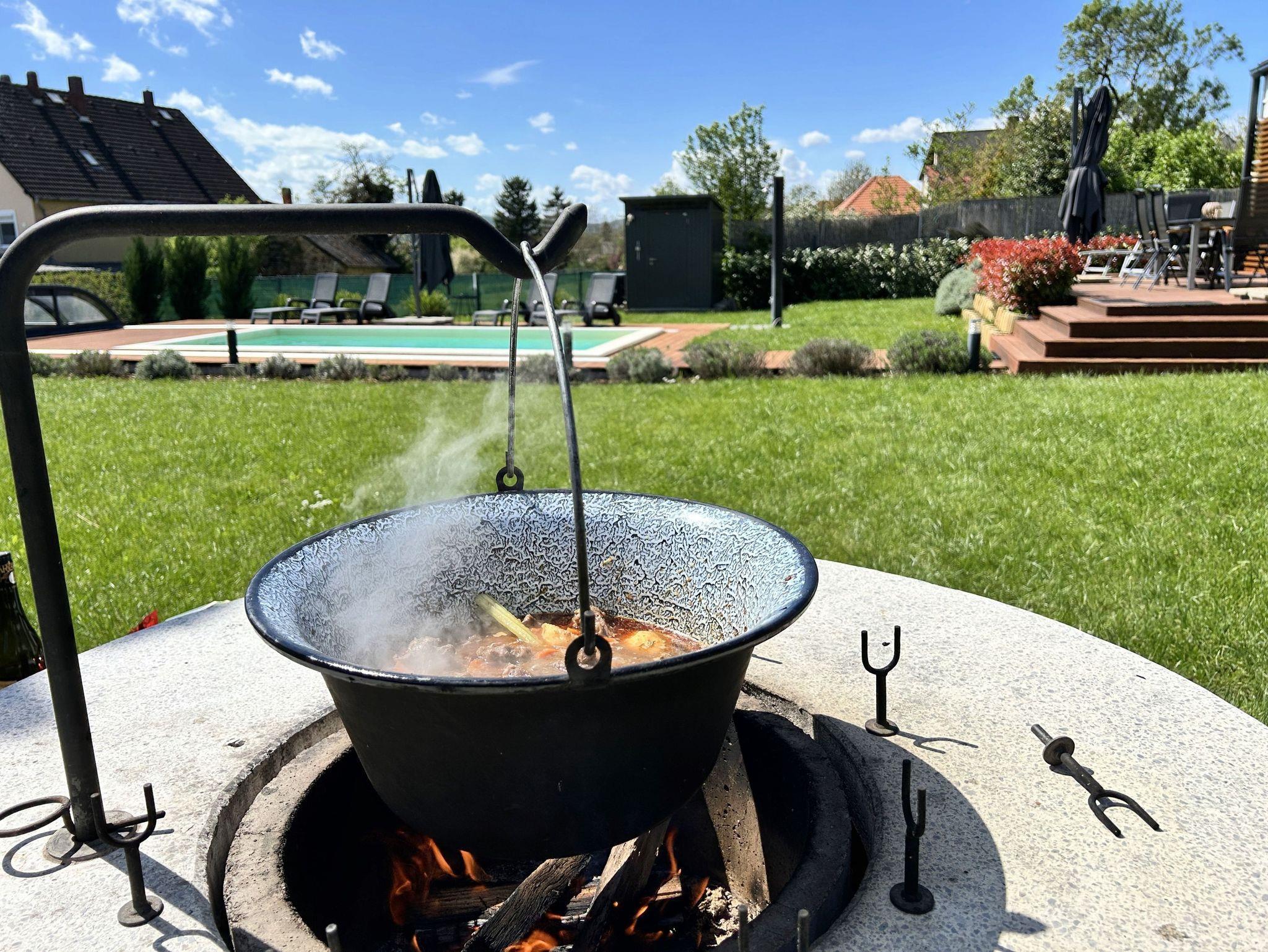 Im 1100 m2 großen Garten können bis zu drei Autos geparkt werde, und auch Elektroautos aufgeladen werden (normales Netzladegerät, kein schnelles Laden möglich!). Im Garten befindet sich ein 6x3 Meter großer Pool mit Sonnenliegen, Grill- und Kochgelegenheit. Die große Rasenfläche bietet auch Möglichkeiten zum Federn, Yoga, usw. In der Kühle der Bäume haben Sie die Gelegenheit sich zu Entspannen und Erholen.