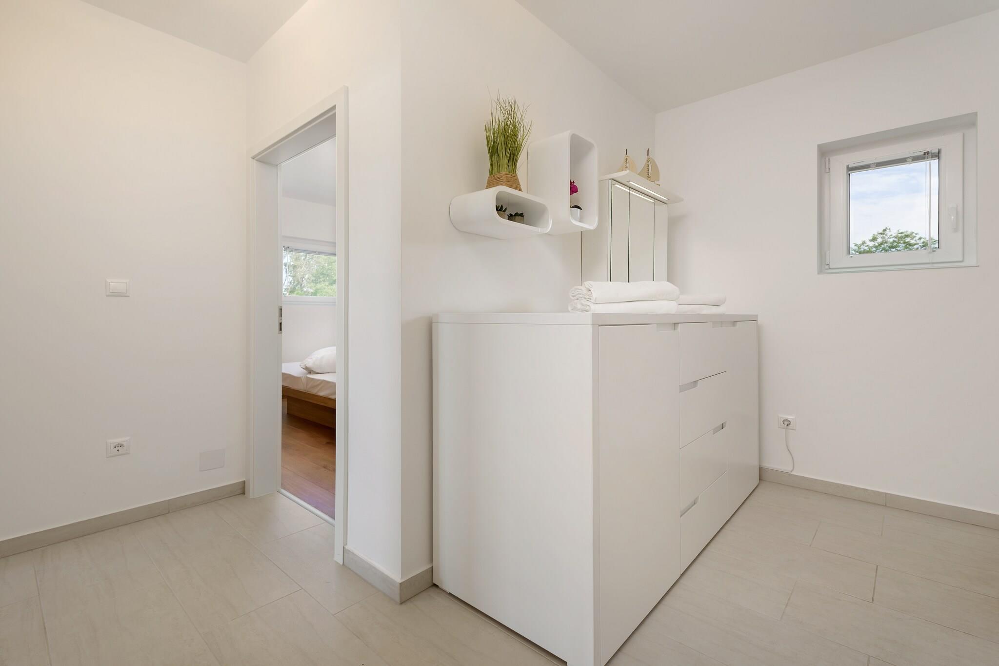 On the 1st floor: (Living room(double sofa bed, TV, balcony), open kitchen(electric kettle, cooker(2 ring stoves), coffee machine(cups), combination microwave, dishwasher, fridge-freezer), bedroom(double bed), bedroom(double bed), bathroom(shower, washbasin, washing machine), toilet) balcony, air conditioning, parking, swimming pool(shared with other guests, natural swimming pond)