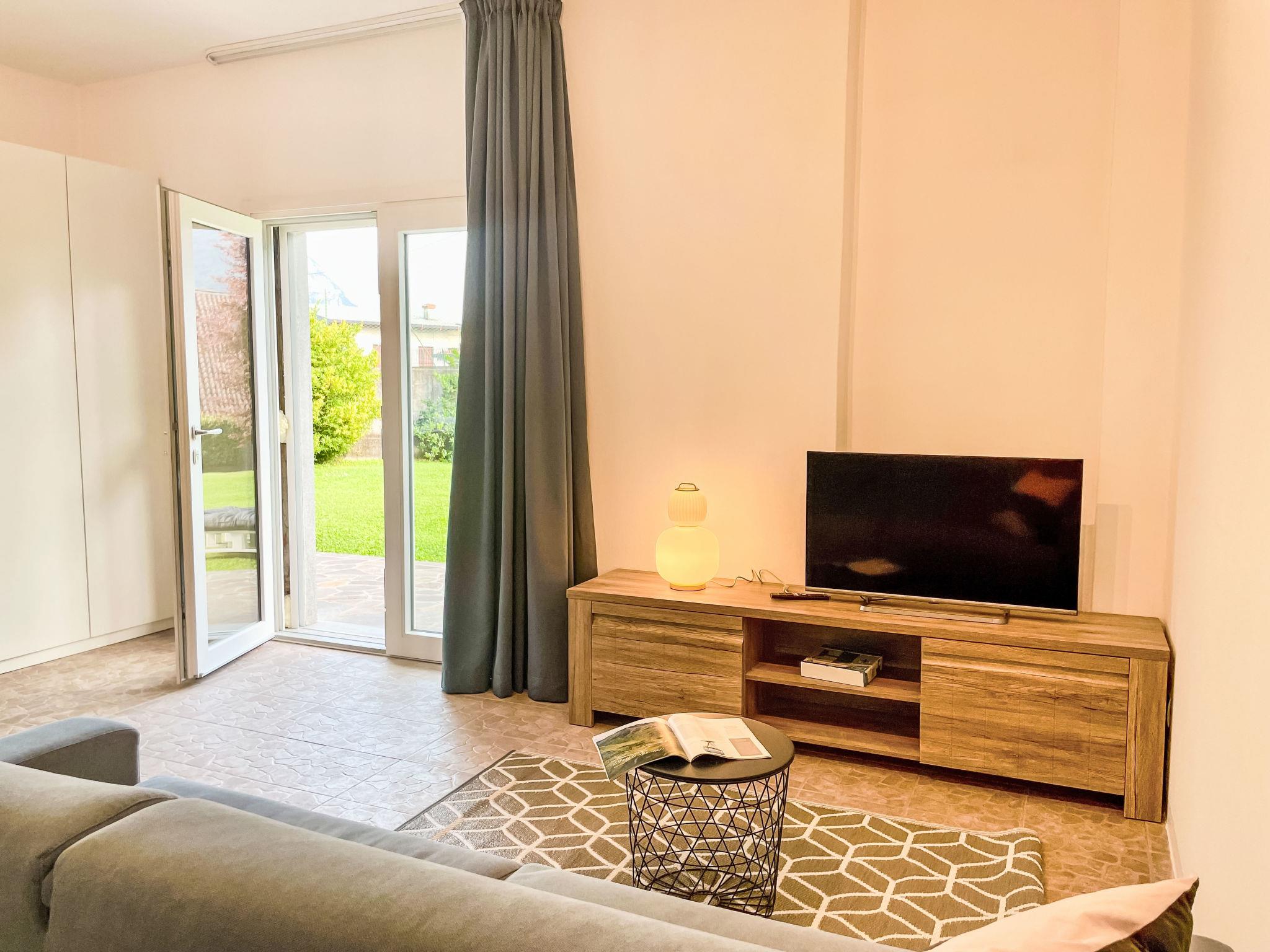 "DaNina", 2-room apartment 50 m2, on the ground floor. Comfortable furnishings: open living/sleeping room with 1 double sofabed, dining table and TV. Exit to the garden. 1 double bedroom. Open kitchen (oven, dishwasher, 4 induction hot plates, toaster, electric coffee machine). Shower/bidet/WC. Air-conditioning, underfloor heating. Heating available only from 15.10. to 15.04. Large patio. Terrace furniture, deck chairs (2). Partial view of the lake, the mountains and the resort. Facilities: washing machine, children's high chair, baby cot for up to 2 year olds, hair dryer. Internet (WiFi, free). Parking (1 car). Please note: non-smokers only. Private entrance, smoke alarm, fire extinguisher. IT097001C2ZZMOTUP5
