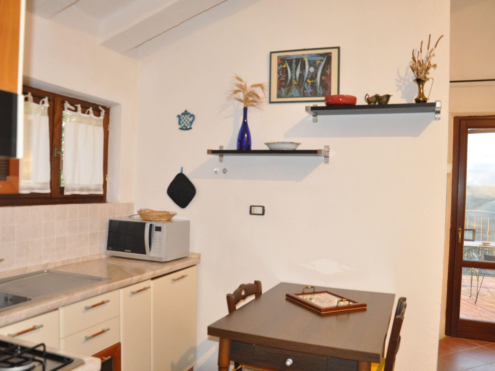 L'appartamento è una dependance indipendente all'inside a larger farmhouse consisting of five flats. Located on the ground floor, the Casetta (a small independent flat) sleeps two and is about 40 square metres. It has a veranda with table and chairs, an entrance hall with kitchen equipped with TV and sofa, a double bedroom, a bathroom with shower (washbasin, WC - no bidet) and a 30-square-metre panoramic terrace furnished with table, chairs and sunshade.