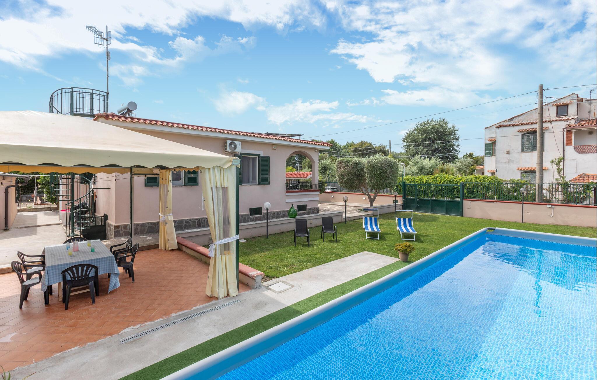 Freuen Sie sich auf den Urlaub in diesem strandnahen Ferienhaus mit Pool.