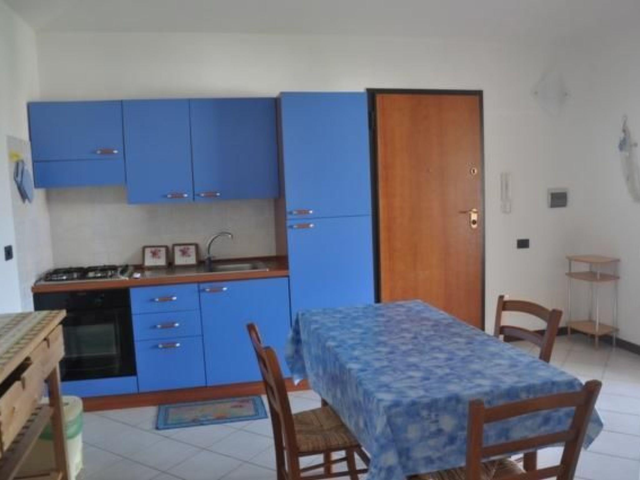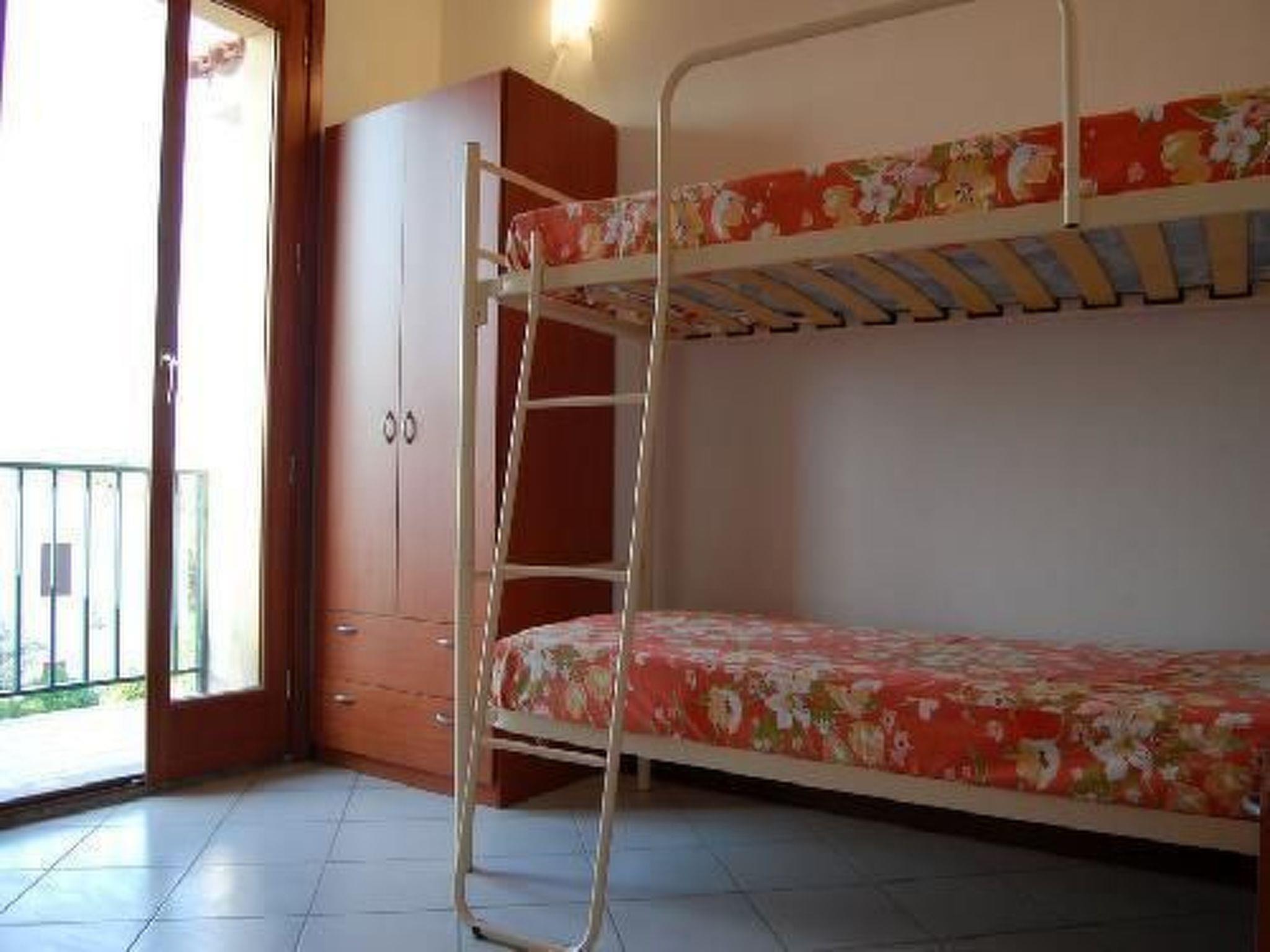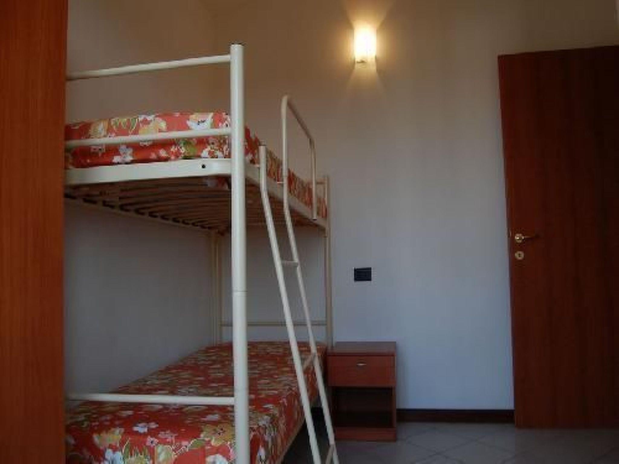 Inside, the flat covers an area of about 60 square metres and includes a cosy living room with kitchenette, equipped with air conditioning, a sofa bed for one person, a shelf, a dining area with table and six chairs, as well as a refrigerator, freezer, gas cooker and oven. The accommodation continues with a double bedroom and a bedroom with bunk beds, both carefully furnished and air-conditioned; a windowed bathroom with shower and the conveniences of an iron and ironing board complete the interior.