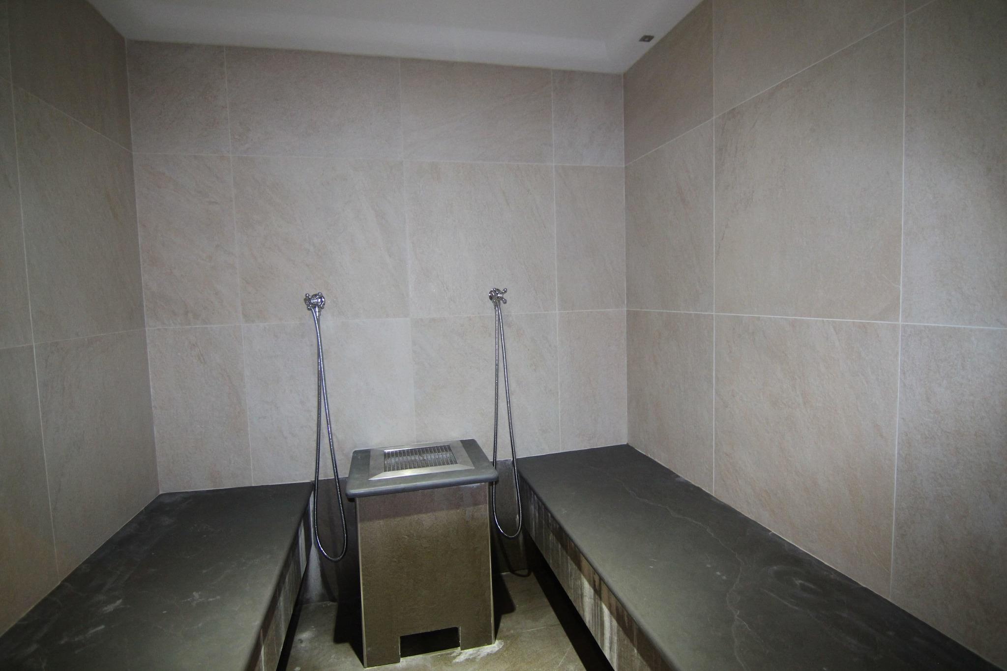 Ground floor: (Living room(double sofa bed, TV, dining table(6 persons)), open kitchen(boiling water tap, cooker(4 ring stoves), oven, fridge-freezer)) On the 1st floor: (bedroom(double bed), bedroom(double bed), bathroom(shower, washbasin, toilet, bidet)) sauna(shared with other guests, reachable from the outside, on the same premises, paid), Turkish steambath(shared with other guests, reachable from the outside, on the same premises, paid), Bubble bath(shared with other guests, reachable from the outside, on the same premises, paid), washing machine(shared with other guests, paid), heating(central), courtyard(shared with other guests), garden(shared with the the owner and other guests), garden furniture, BBQ, swimming pool(shared with other guests, 6 x 3 m., opened from Jun upto and including Aug), children's bed(on request)