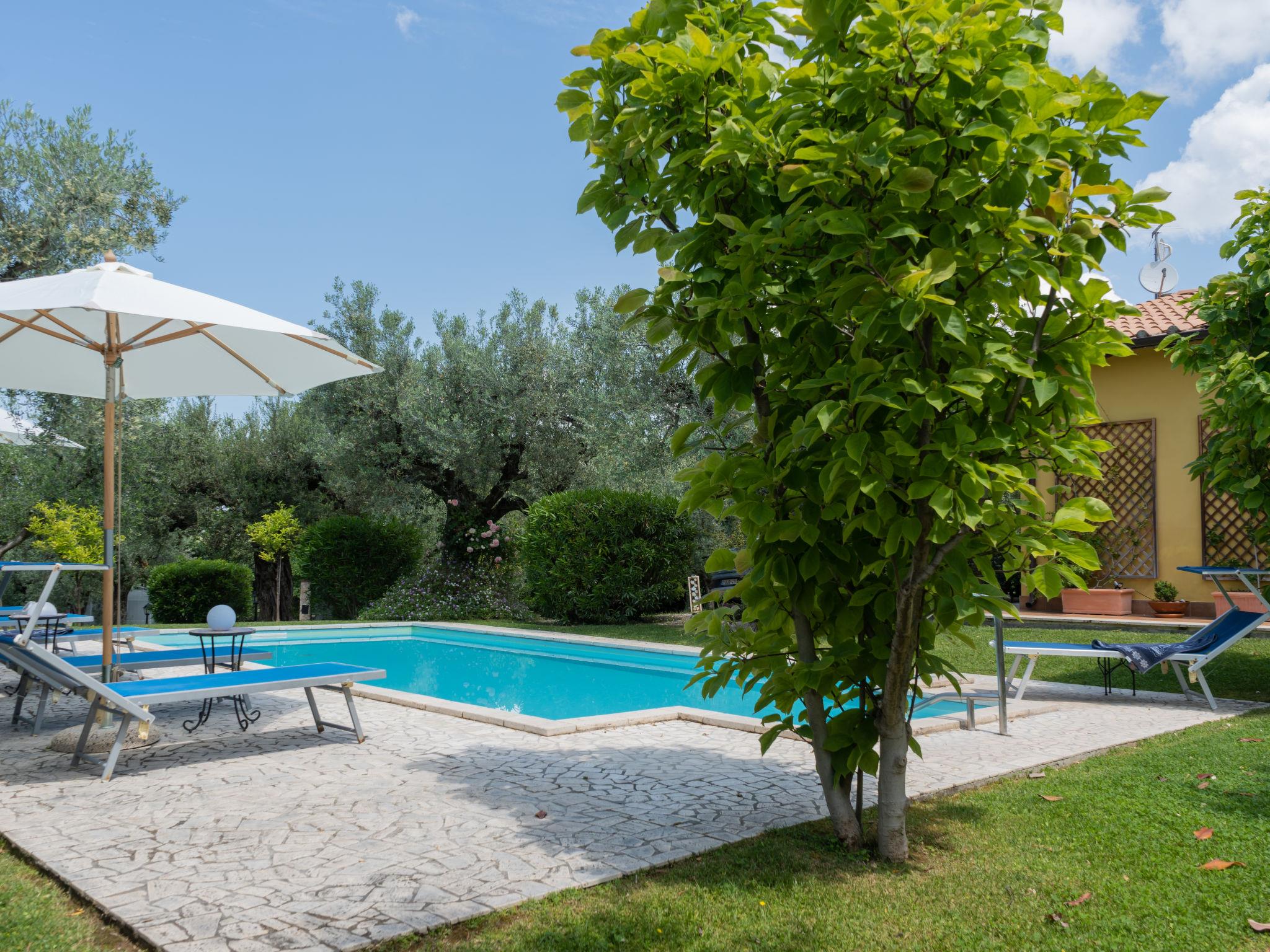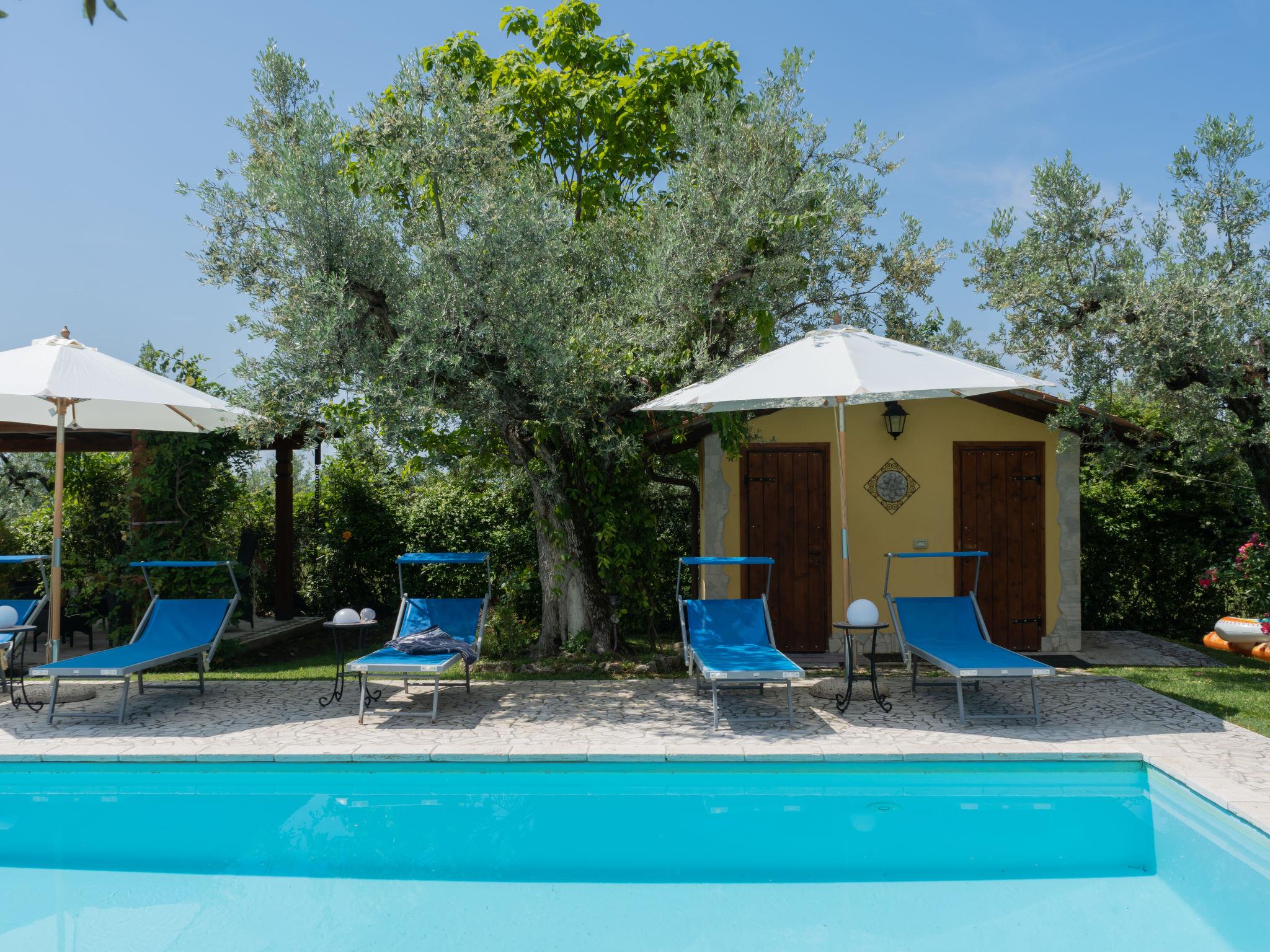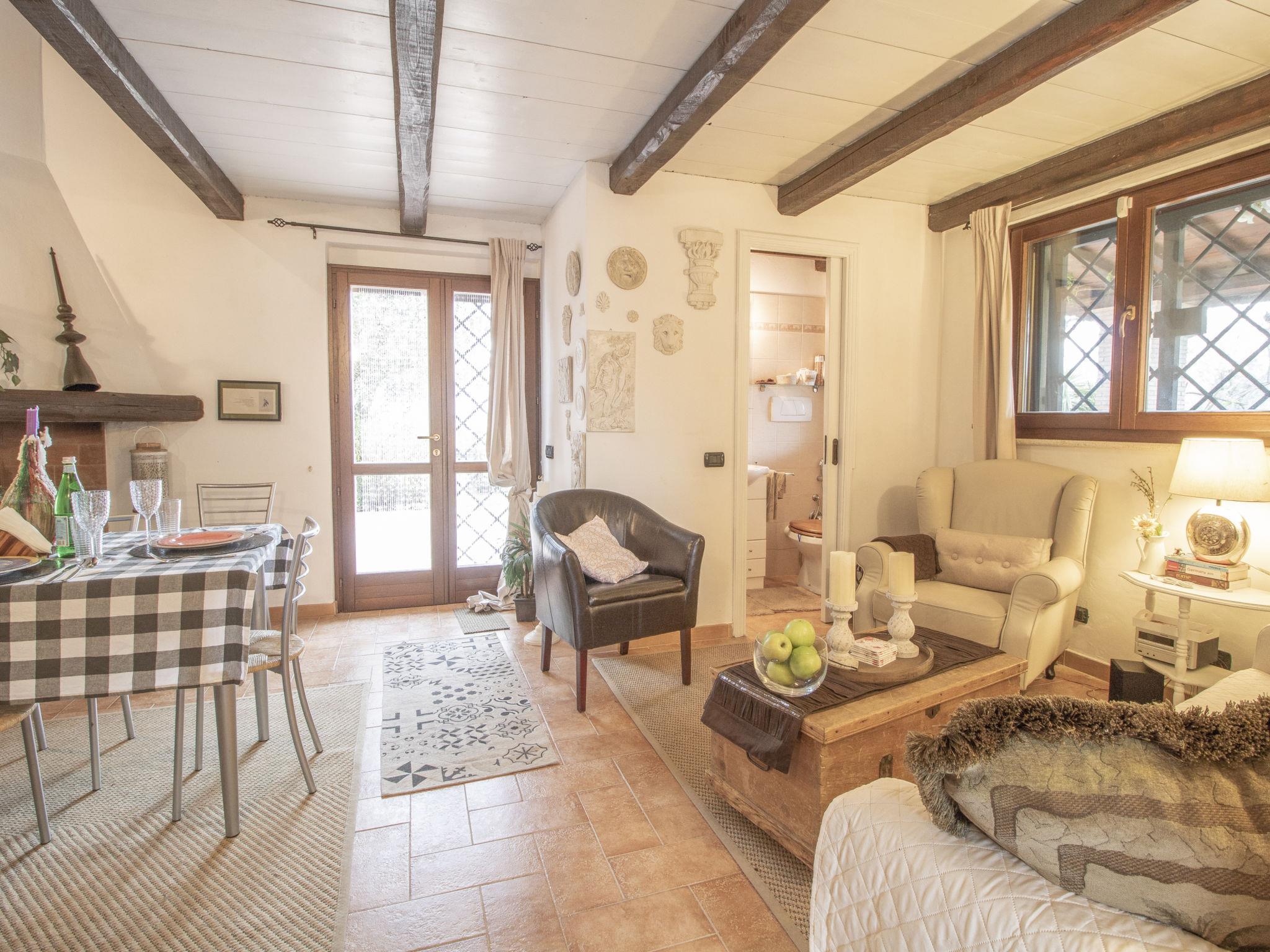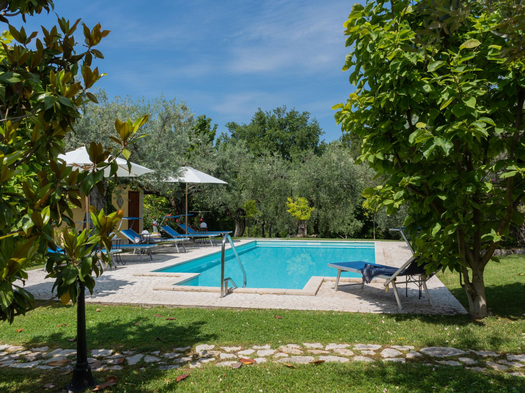 Beautiful, comfortable cottage "Olive Grove Sabina", 2 storeys. Property composed of main house and outbuilding, in the hamlet Canneto 10 km from the centre of Passo Corese, in a secluded, quiet, sunny position, in the countryside. Private: property 1 ha (fenced), garden 1 ha (fenced) with trees, swimming pool (8 x 4 m, depth 120 - 120 cm, seasonal availability: 01.Jun. - 30.Sep.) with salt-electrolysis pool-cleaning system. Shower/WC in the pool area, outdoor shower, table tennis, patio, arbour, pergola, terrace, garden furniture, barbecue, fireplace. Narrow motor access to the house (500 m via unmade road). Shop 1 km, grocery 2 km, supermarket 2 km, bar 2 km, café 2 km, bus stop 1 km, railway station "Fara Sabina FL1 - to Roma" 10 km. Nearby attractions: Roma 45 km, Rieti 30 km, Orvieto 70 km, Tivoli 40 km. Well-known lakes can easily be reached: Lago del Turano 30 km, Lago di Bracciano 40 km. Please note: car recommended. The owner does not accept any youth groups. Residence with electric gates. Yoga/viewing spot available in the olive grove.