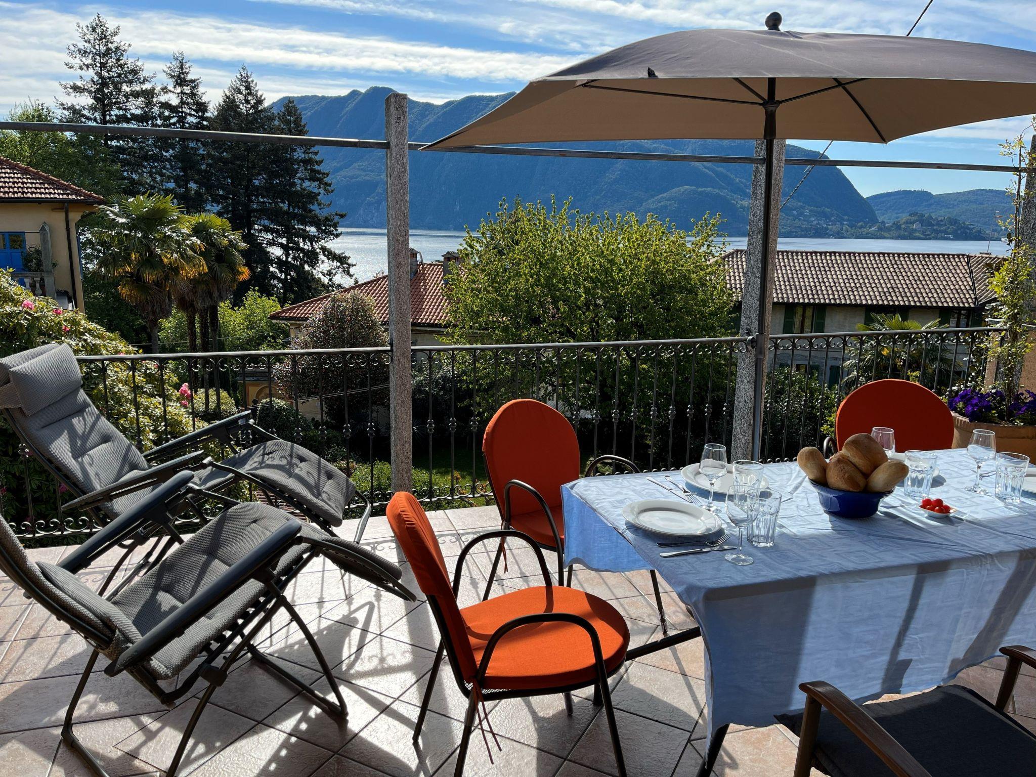 Modern holiday accommodation for families and couples on the western shore of Lake Maggiore, lovingly furnished in an old building with lake view, equipped with panoramic terrace, fireplace, barbecue, large garden, two bedrooms with double beds, one cot and one baby bed