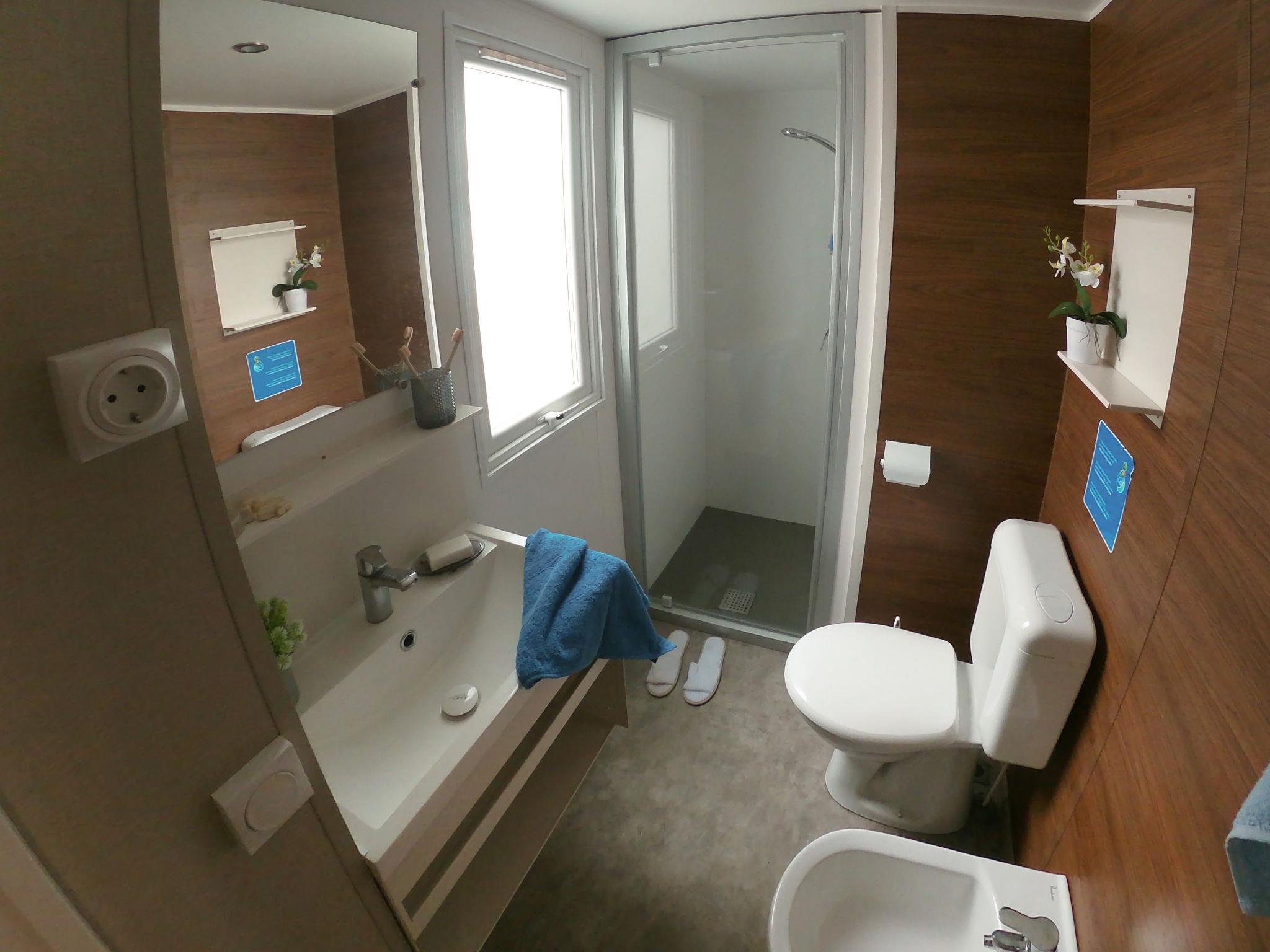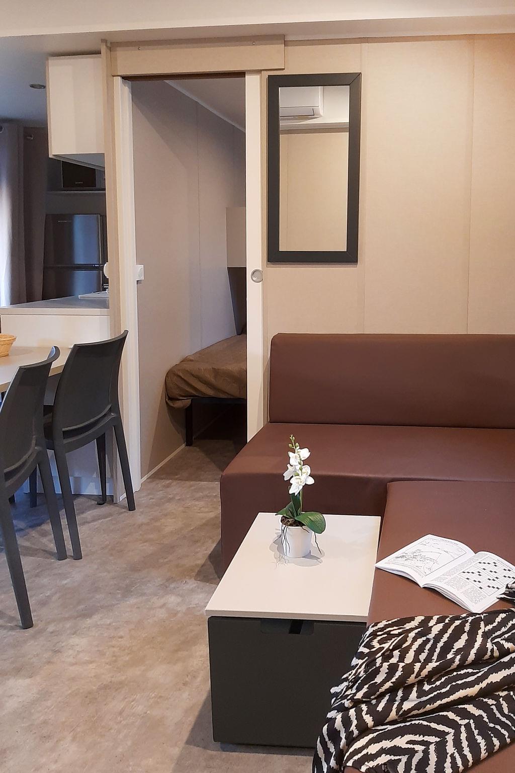 "Ponente Deluxe", 3-room mobile home 29 m2. Bright, modern furnishings: living/sleeping room with 1 sleeping facility, dining table, kitchen corner and air conditioning. Exit to the terrace. 1 room with 1 double bed (155 cm, length 200 cm). Exit to the terrace. 1 room with 2 beds (80 cm, length 187 cm), 1 x 1 bunk beds (80 cm, length 187 cm). Open kitchen (4 gas rings, microwave, freezer). Shower/bidet/WC. Heating, air-conditioning. Terrace 15 m2, roofed. Terrace furniture. Facilities: mosquito net. Parking (1 car). IT049001B1KRISVGSR
