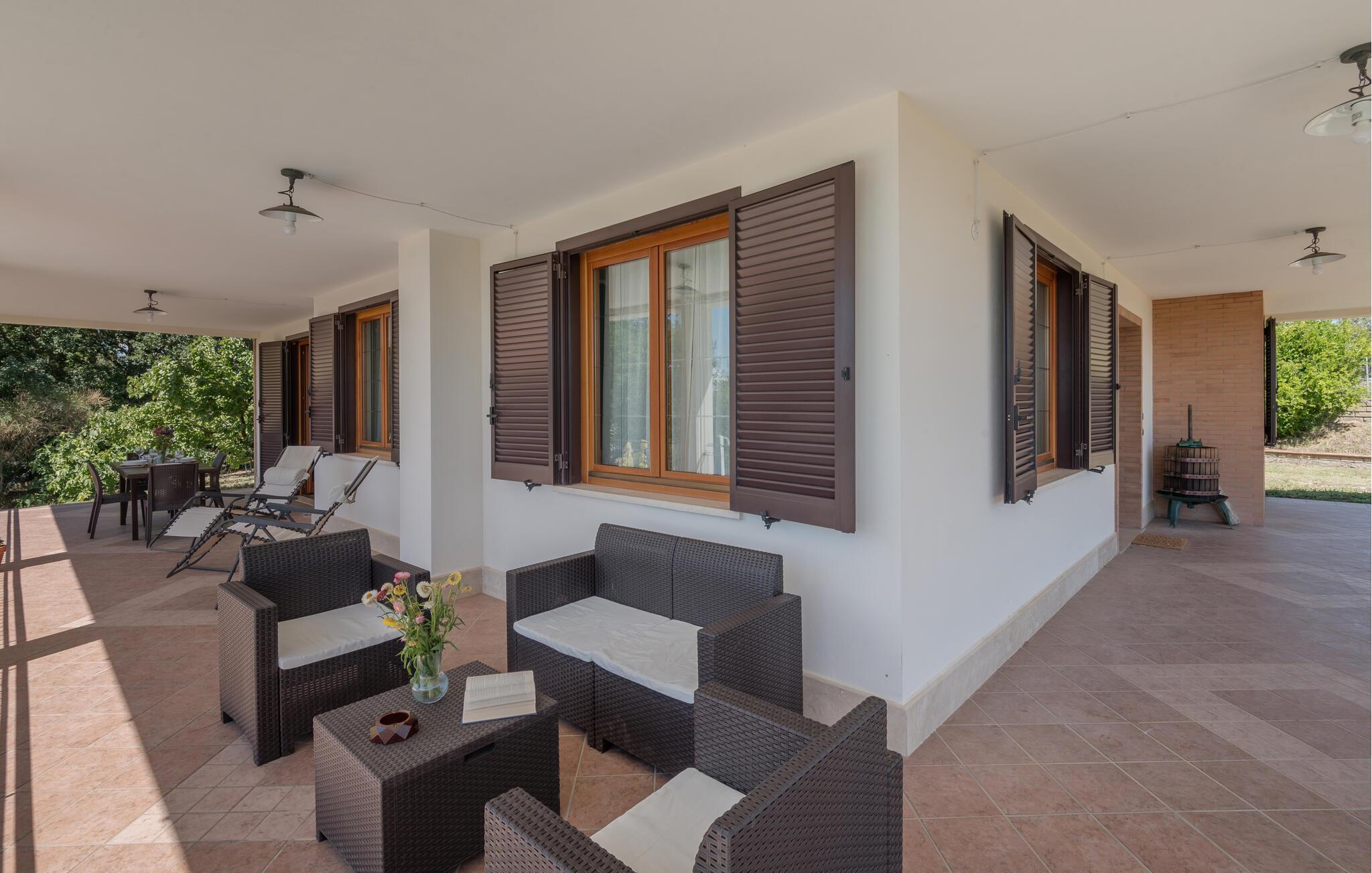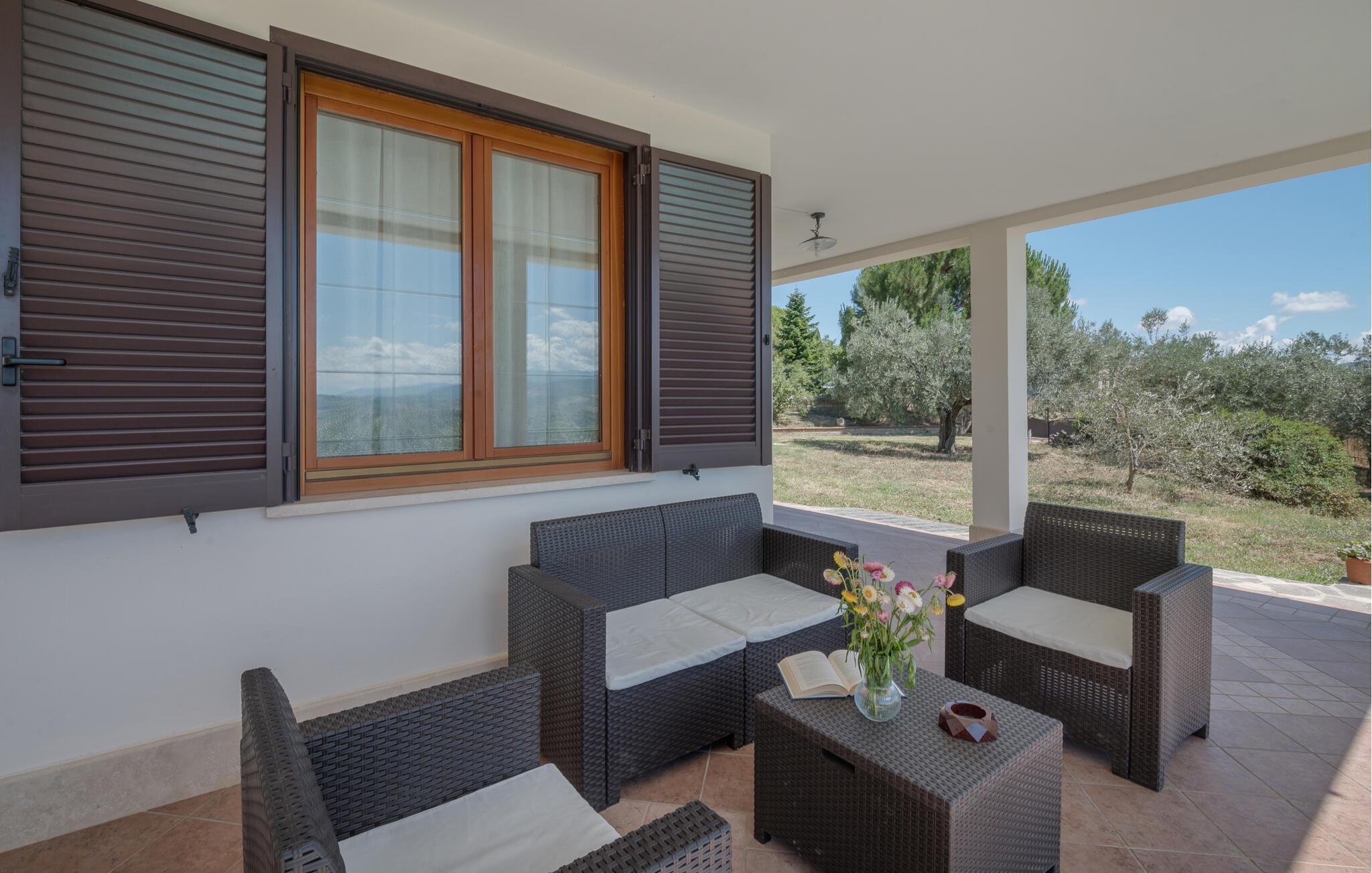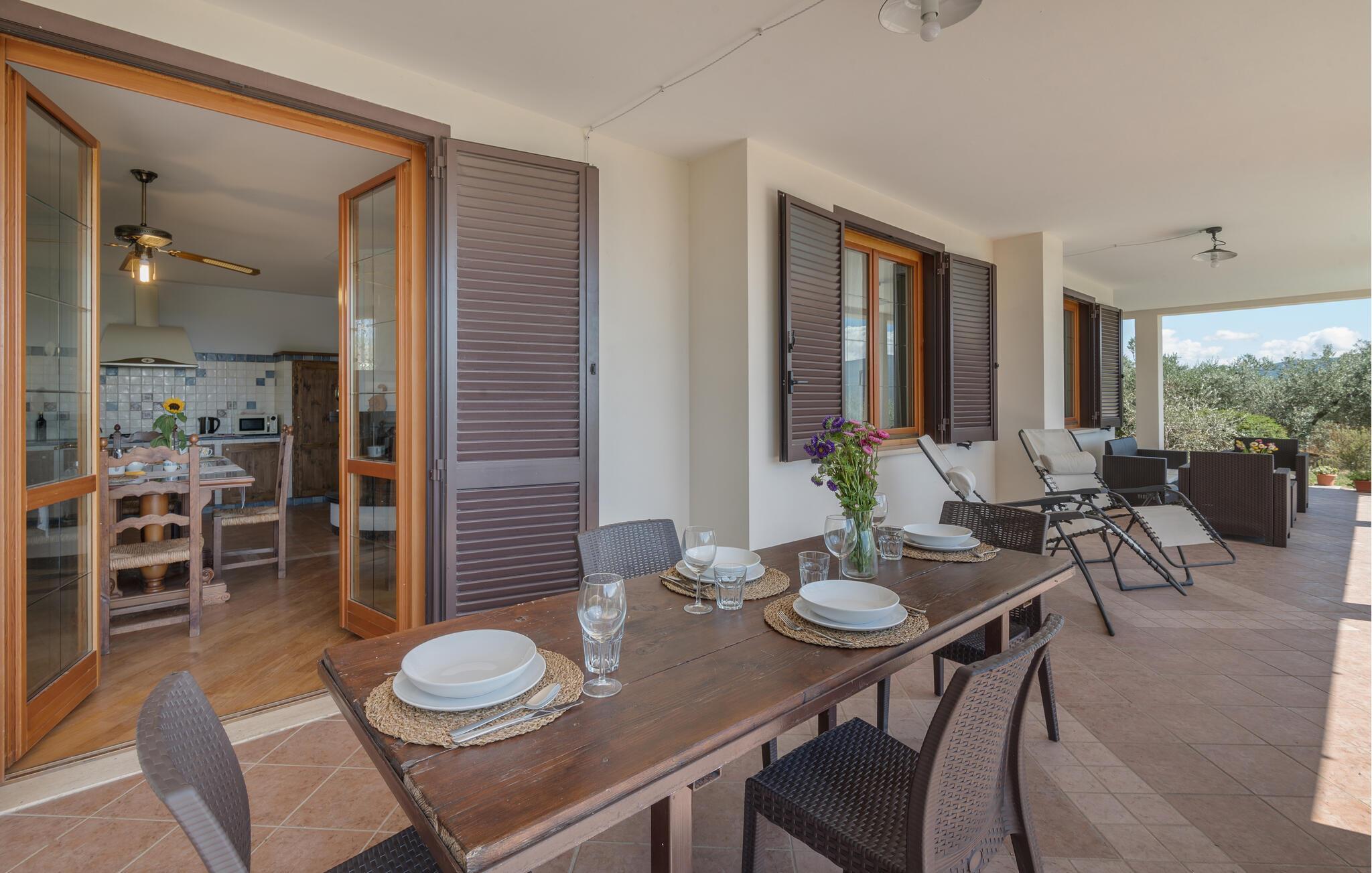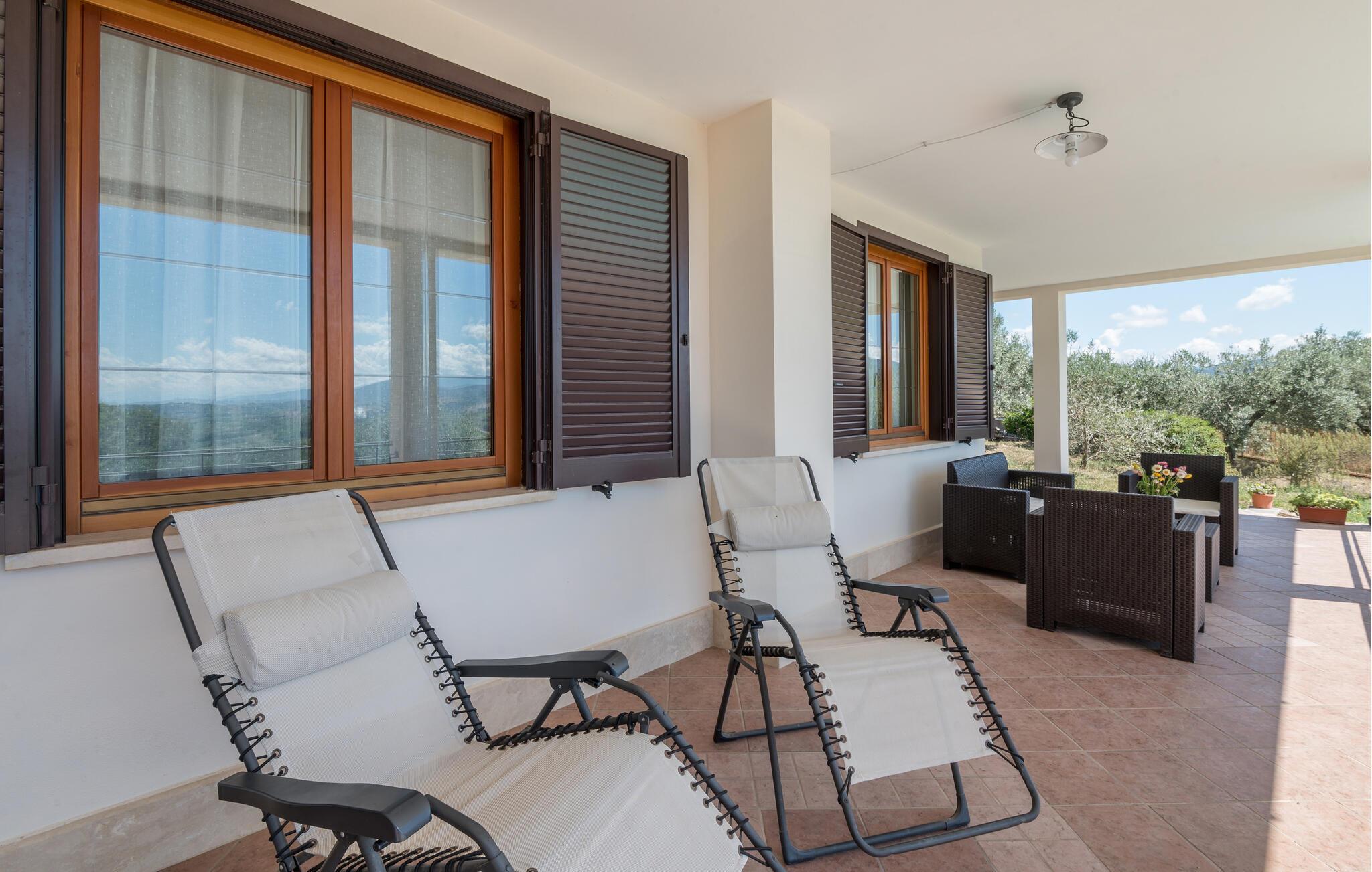 Sie werden sich auch gerne auf der großen Veranda aufhalten. Mit Blick auf die herrliche Landschaft und den Pool, der sich zu Ihren Füßen befindet, können Sie hier viele Stunden beim Baden, Sonnen und Essen verweilen. Sehen Sie Ihren Kindern beim Spielen im Garten zu und schmieden Pläne für Ihre nächsten Ausflüge.
