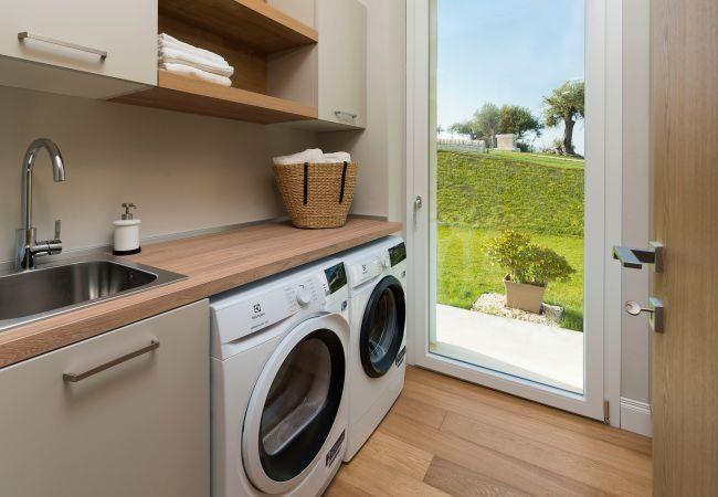 Ground Floor: living/dining room, kitchen, laundry room, 1 bathroom (washbasin and toilet), 1 double bedroom (king size bed) with en-suite tub, 2 double bedrooms with en-suite shower.