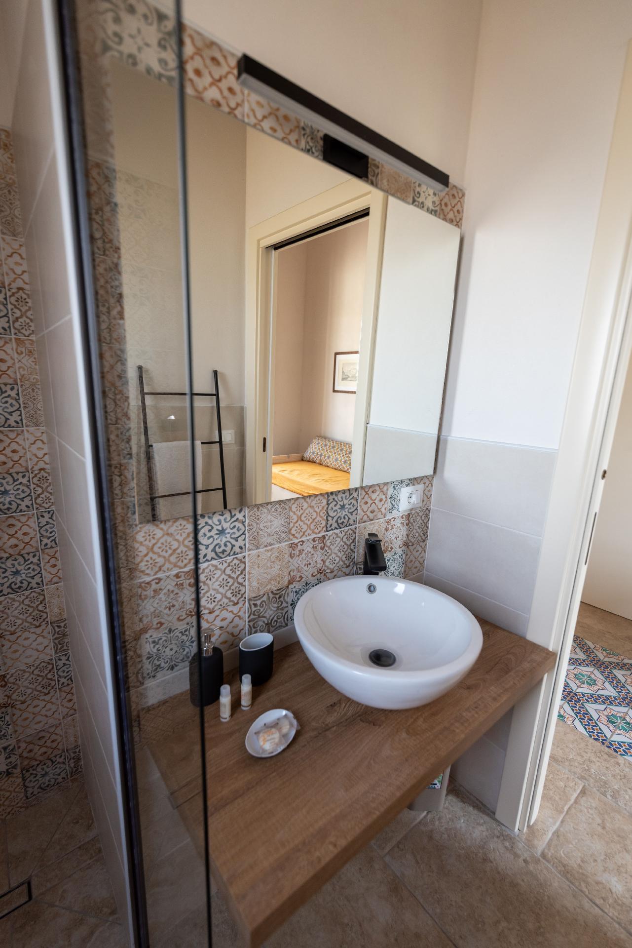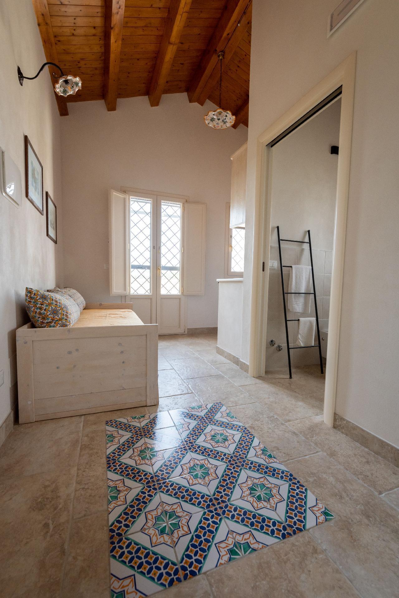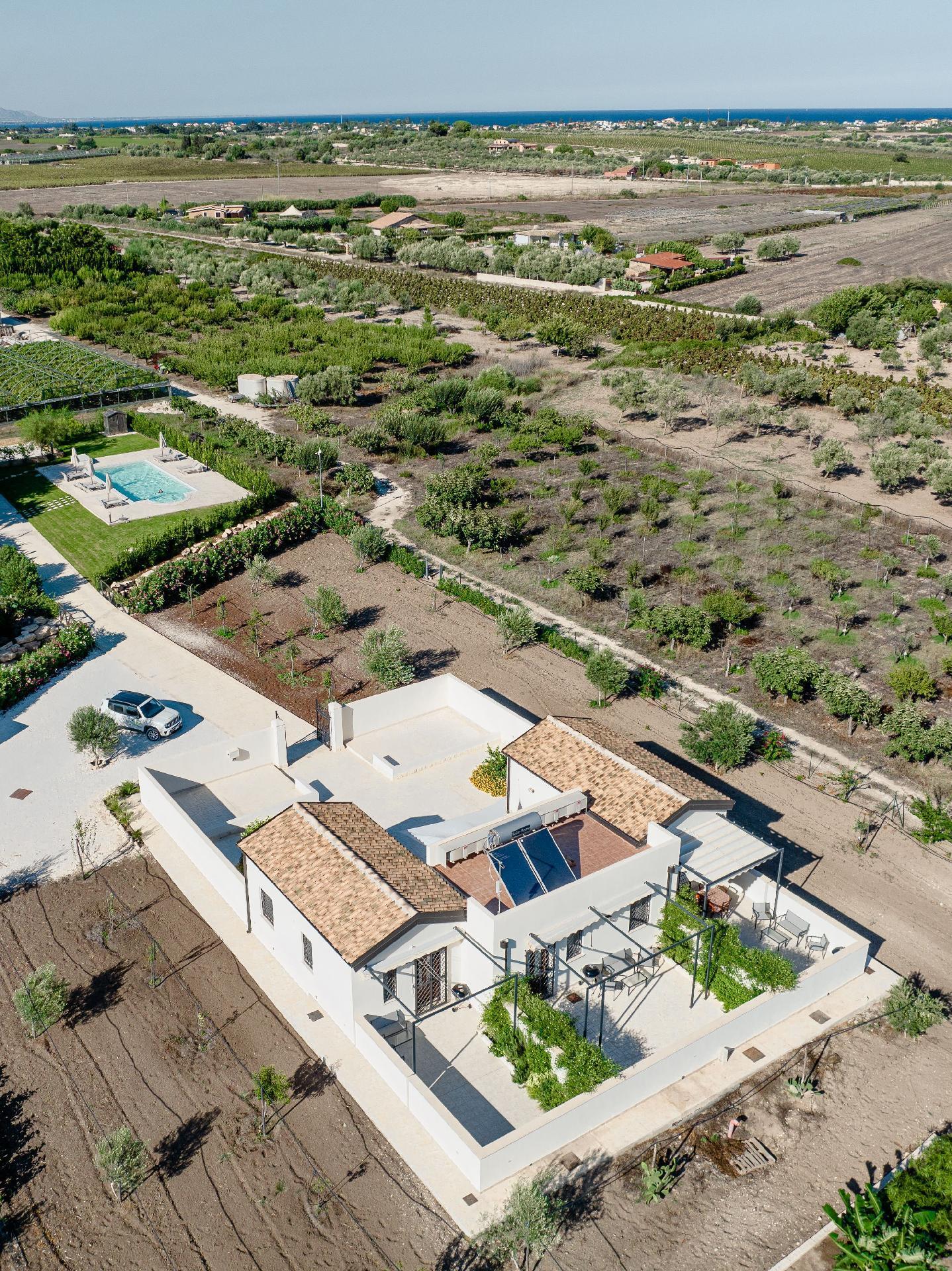 The house recalls the architectural forms of a Sicilian Baglio, an enclosed country residence with rustic annexes and was built with the latest energy-saving criteria and is powered by a photovoltaic system. Near the baglio, guests will find a small vegetable garden and orchard offering produce according to seasonality. There is ample covered parking with a charging station for electric vehicles. A detailed guide is available for guests to make the most of their holiday and our support to guide those interested in exploring the area's food and wine