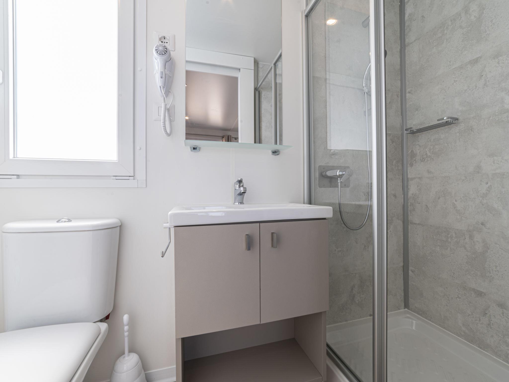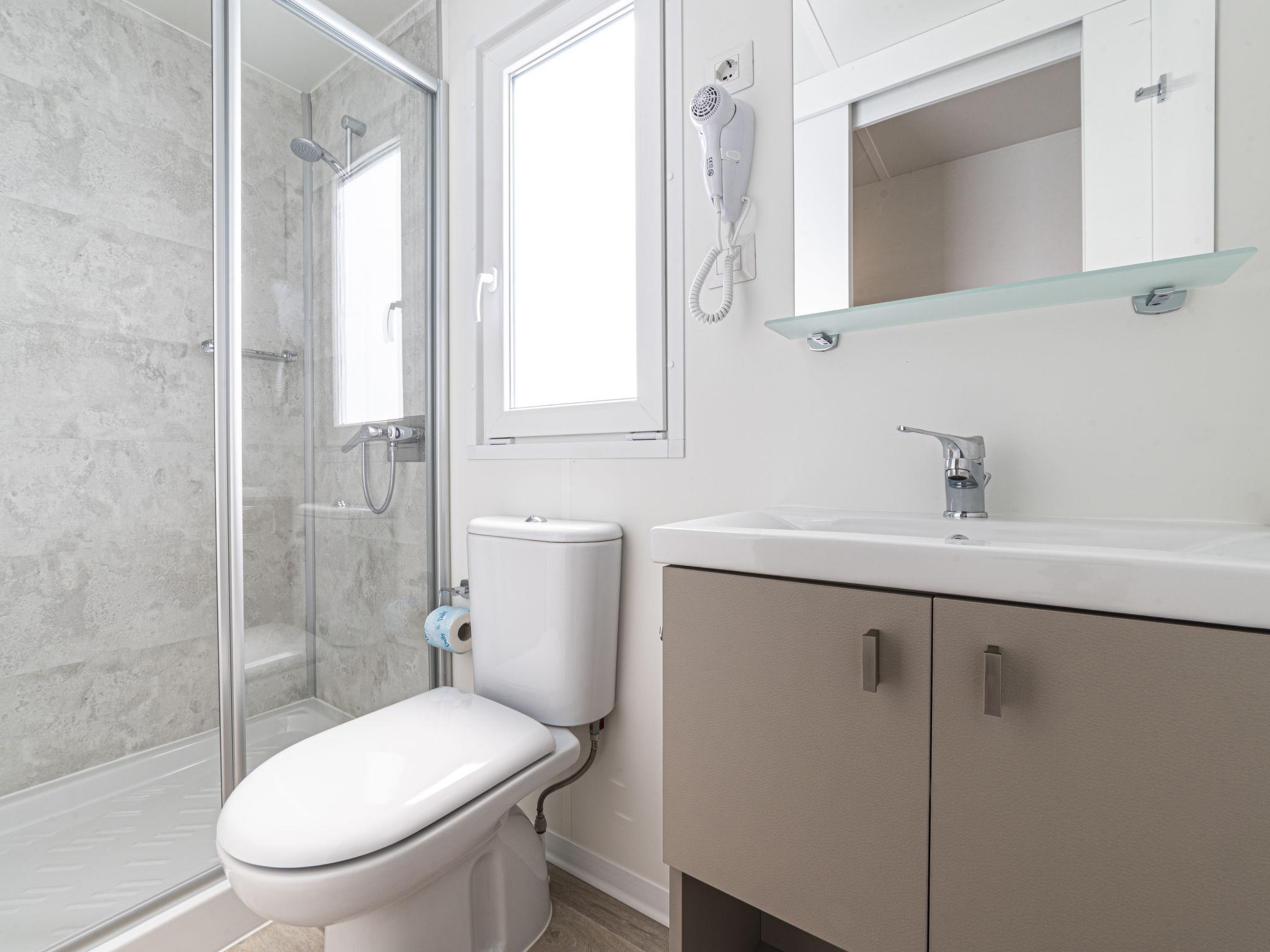 "Baia Revolution Plus", 4-room mobile home 34 m2. Modern furnishings: living/dining room with dining table and TV. Exit to the terrace. 1 room with 1 french bed (140 cm), shower/WC. 1 room with 2 beds (70 cm). 1 room with 1 x 2 bunk beds (70 cm). Kitchenette (4 gas rings, freezer). Shower/WC. Air-conditioning, forced-air heating (extra). Terrace roofed. Terrace furniture. Parking (1 car). Please note: non-smokers only. IT023022B1P4KHX4L9