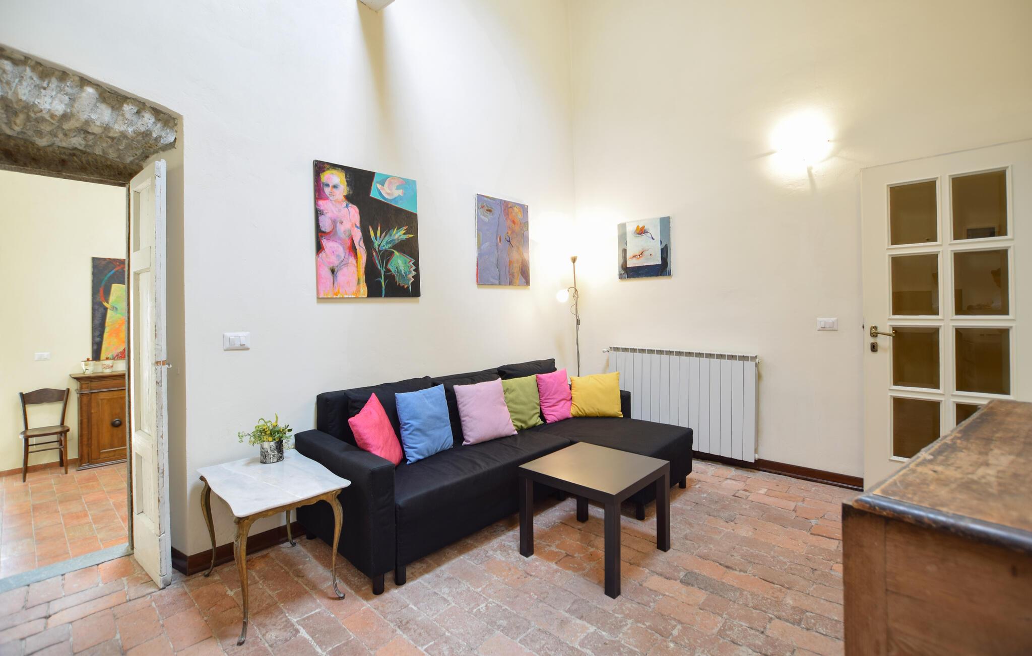 Willkommen in der einladenden Wohnung, die Sie in bester Lage für einen Urlaub mit Outdoor-Aktivitäten in einem historischen Gebäude empfängt. Geschmackvoll möblierte Räume mit aparten Deckenbalken bieten alles, was Sie für einen gelungenen Urlaub brauchen. Freuen Sie sich auf gemeinsame Mahlzeiten am Esstisch in der Küche und schmieden Sie Pläne für den nächsten Tag.