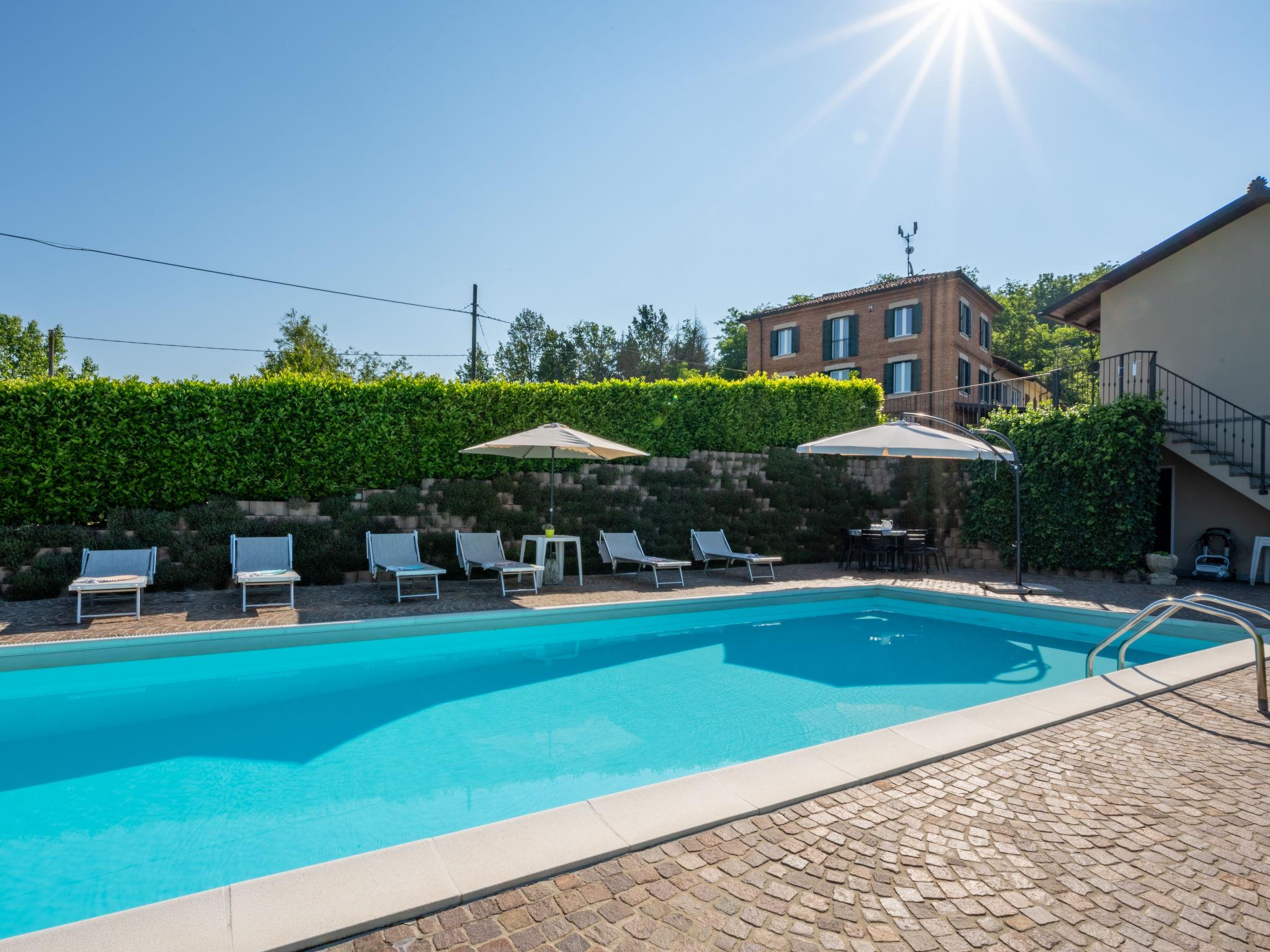 Very comfortable cottage "Marmorito", semi-detached, surrounded by meadows and fields. 3 km from the centre of Portacomaro, 9 km from the centre of Asti, 40 km from the centre of Alba, residential area (villas). Private: property 3'000 m2 (fenced), well-kept garden with lawn and wildlife garden, swimming pool (12 x 5 m, depth 100 - 200 cm, seasonal availability: 05.Apr. - 30.Oct.). Shower/WC in the pool area, outdoor shower, pool maintenance by the owner/gardener. In the house: fitness room, table football. Parking at the house on the premises. Shop 3 km, supermarket 6 km, bus stop 1.7 km, railway station "Asti" 9 km. Golf course (18 hole) 18 km. Please note: car recommended. Part of the house is closed and unoccupied.