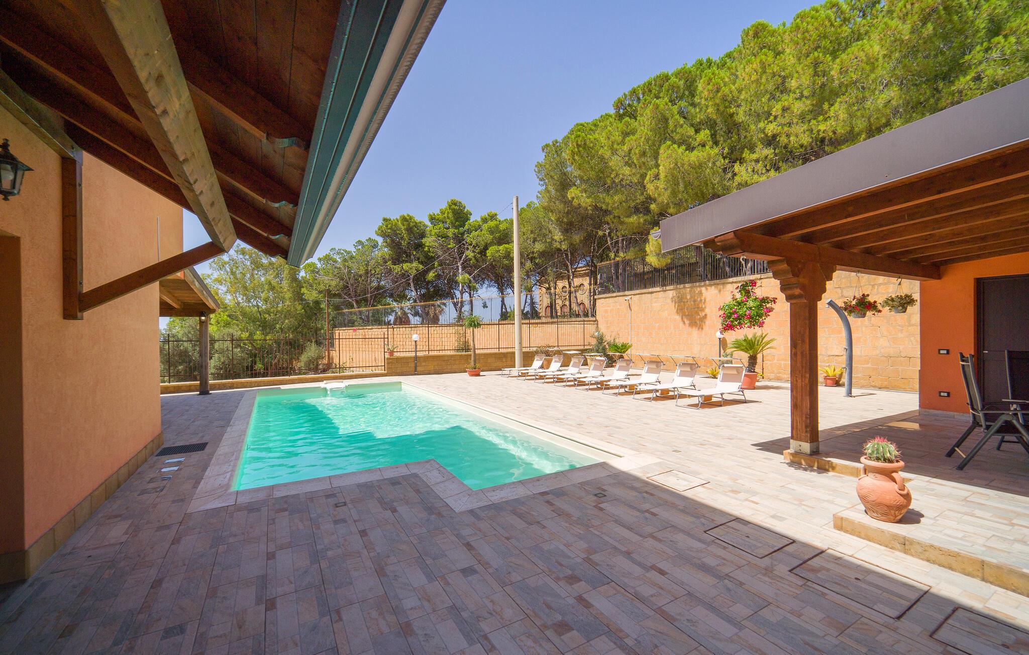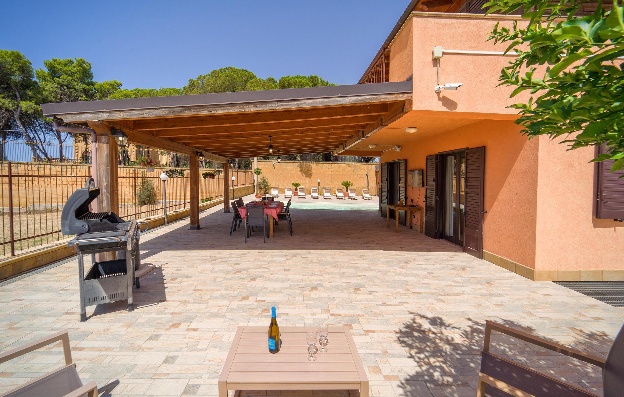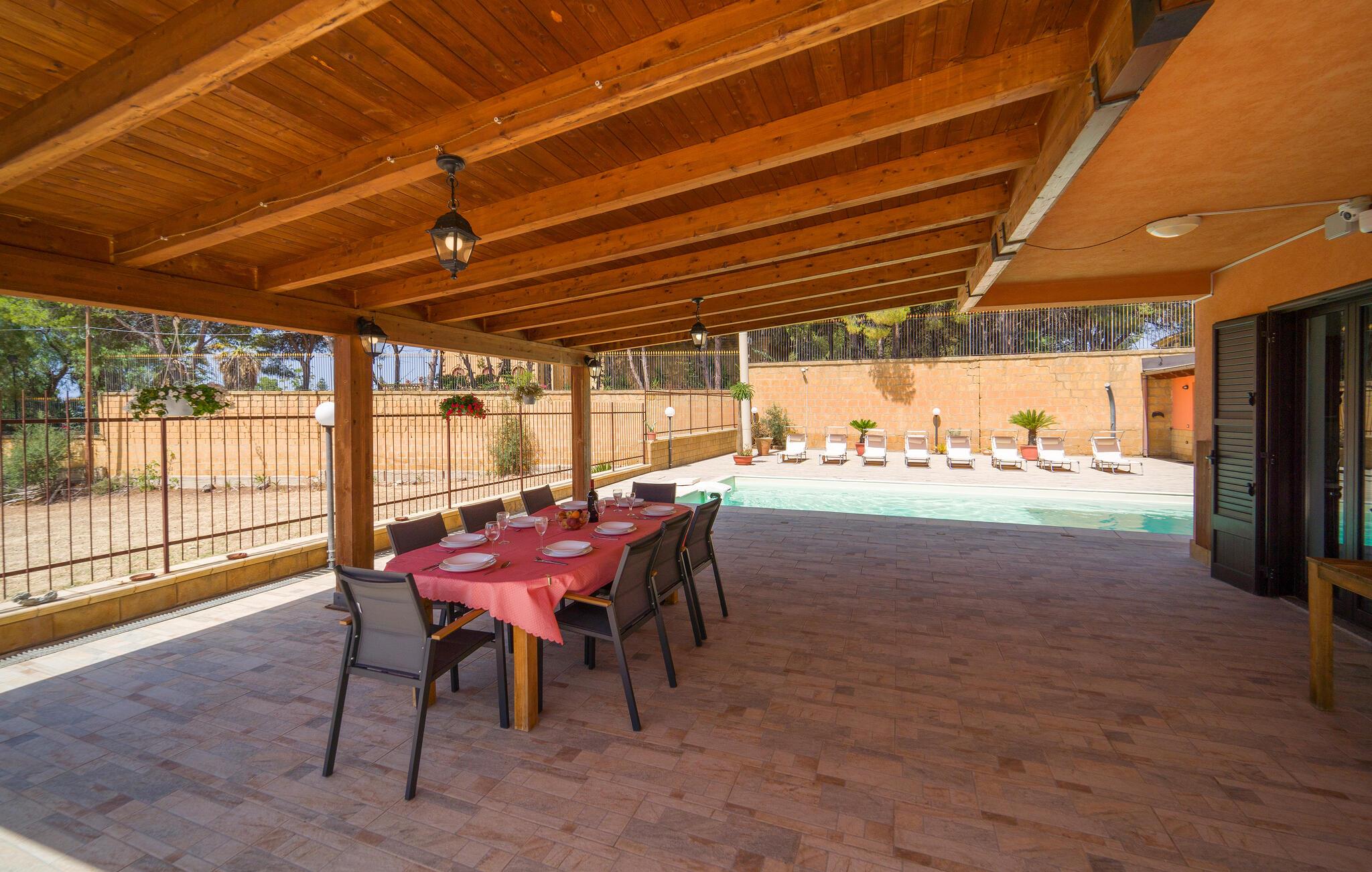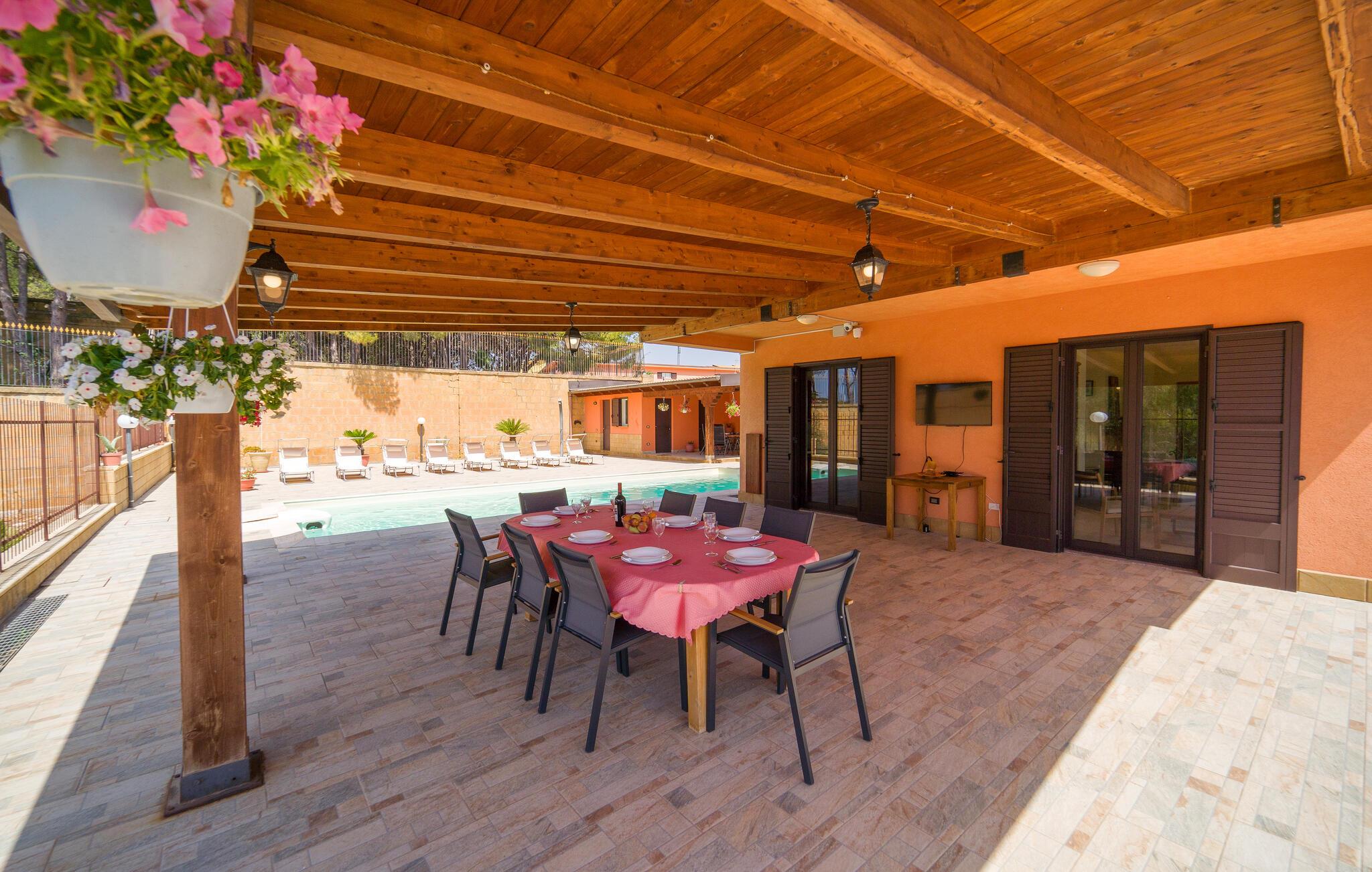 Auf Ihrer überdachten Terrasse lädt eine schöne Essgelegenheit zu stimmungsvollen Grillabenden ein. Erfrischen Sie sich nach Lust und Laune im Pool und machen Sie es sich mit einer unterhaltsamen Lektüre von Andrea Camilleri auf der einladenden Lounge bequem.