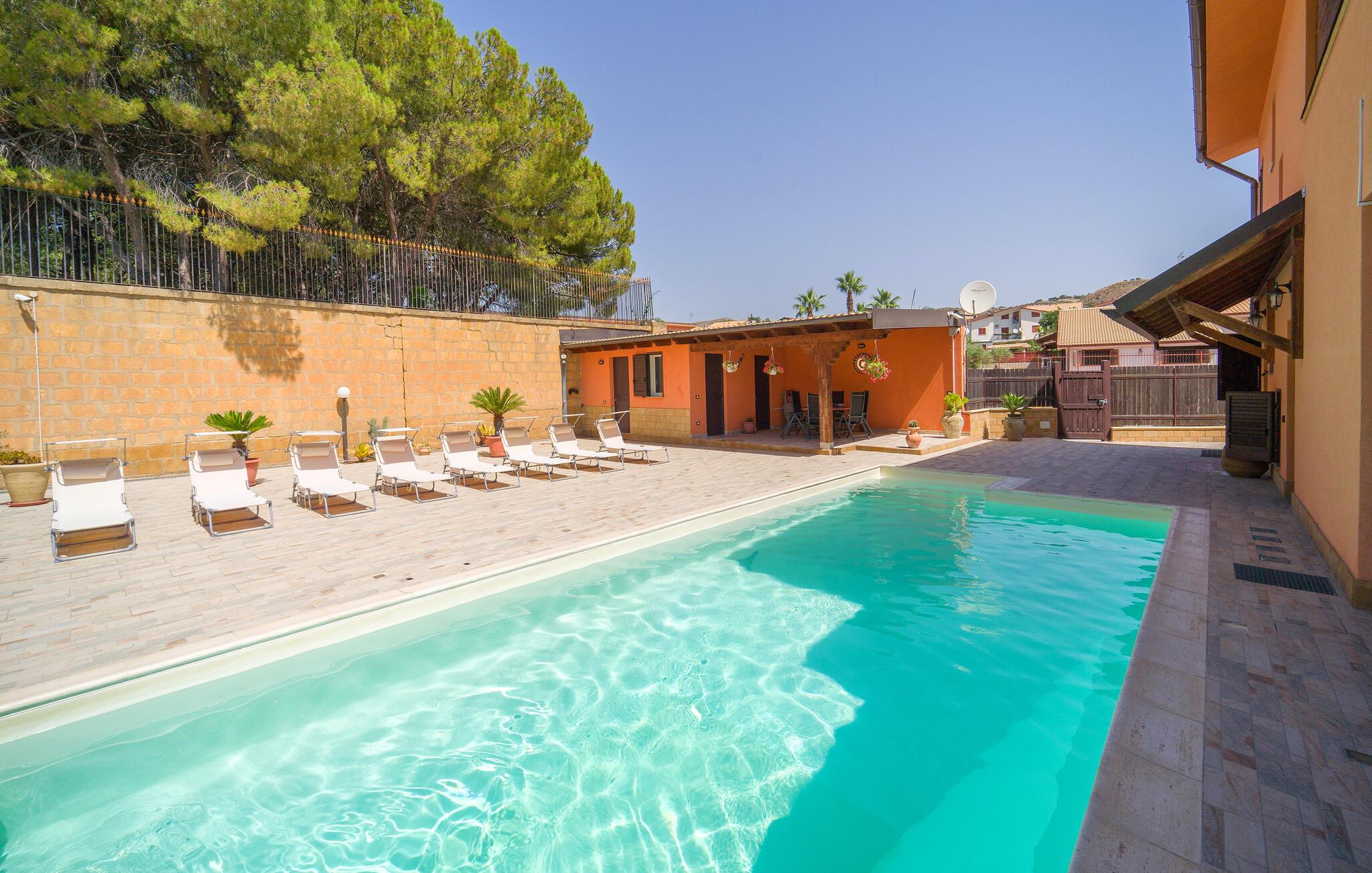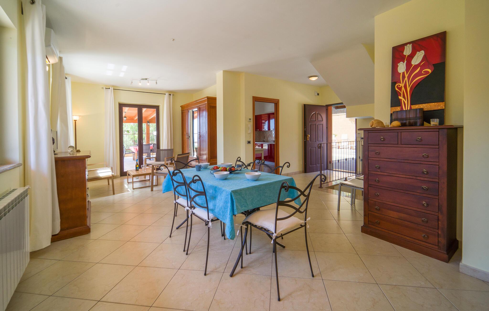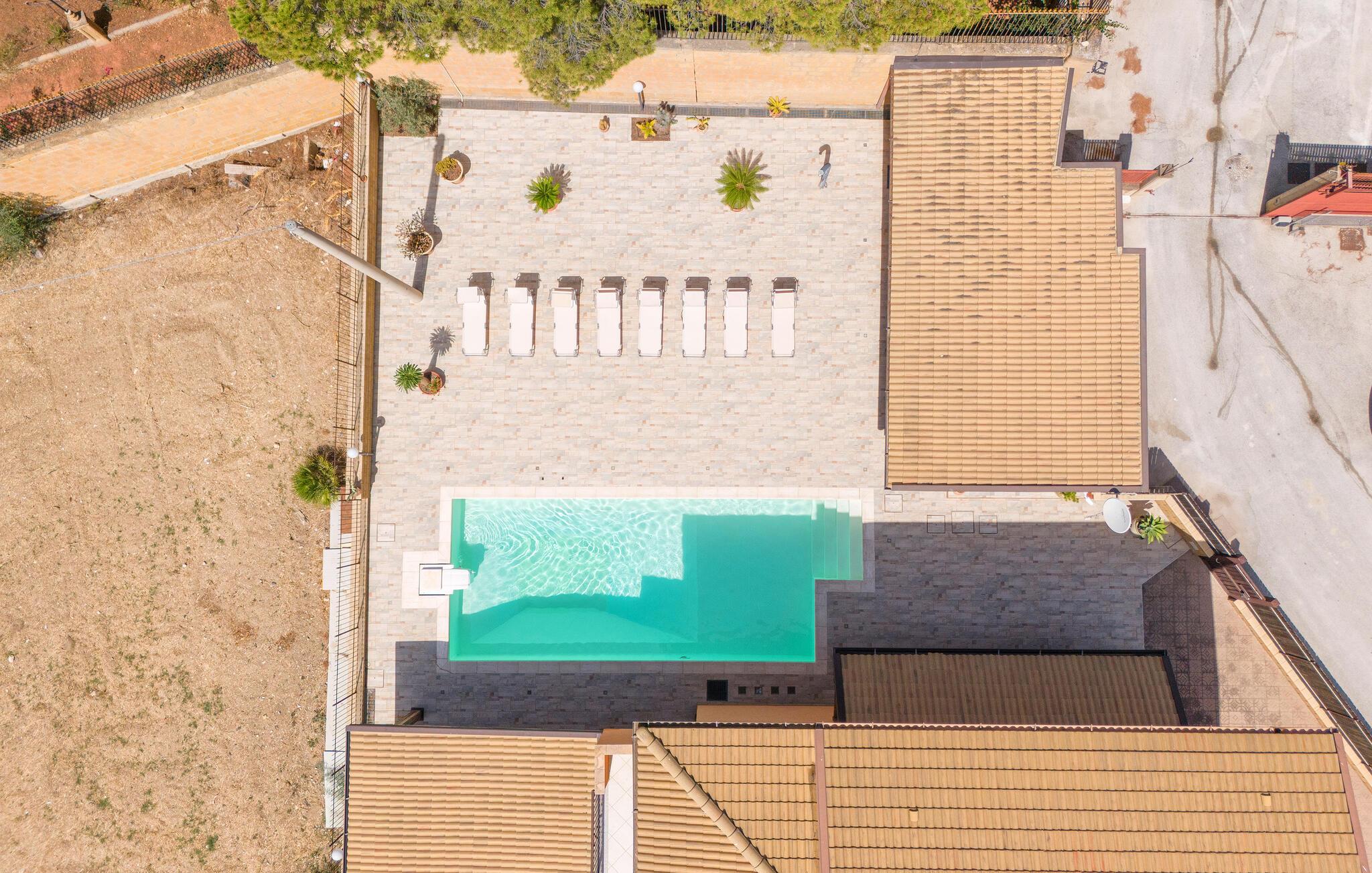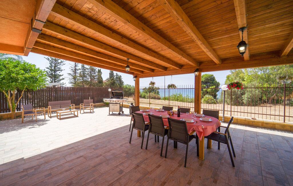 Auf Ihrer überdachten Terrasse lädt eine schöne Essgelegenheit zu stimmungsvollen Grillabenden ein. Erfrischen Sie sich nach Lust und Laune im Pool und machen Sie es sich mit einer unterhaltsamen Lektüre von Andrea Camilleri auf der einladenden Lounge bequem.
